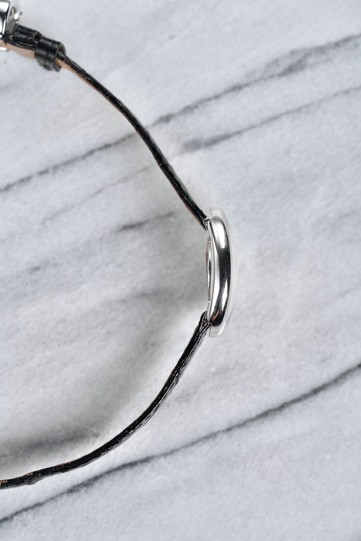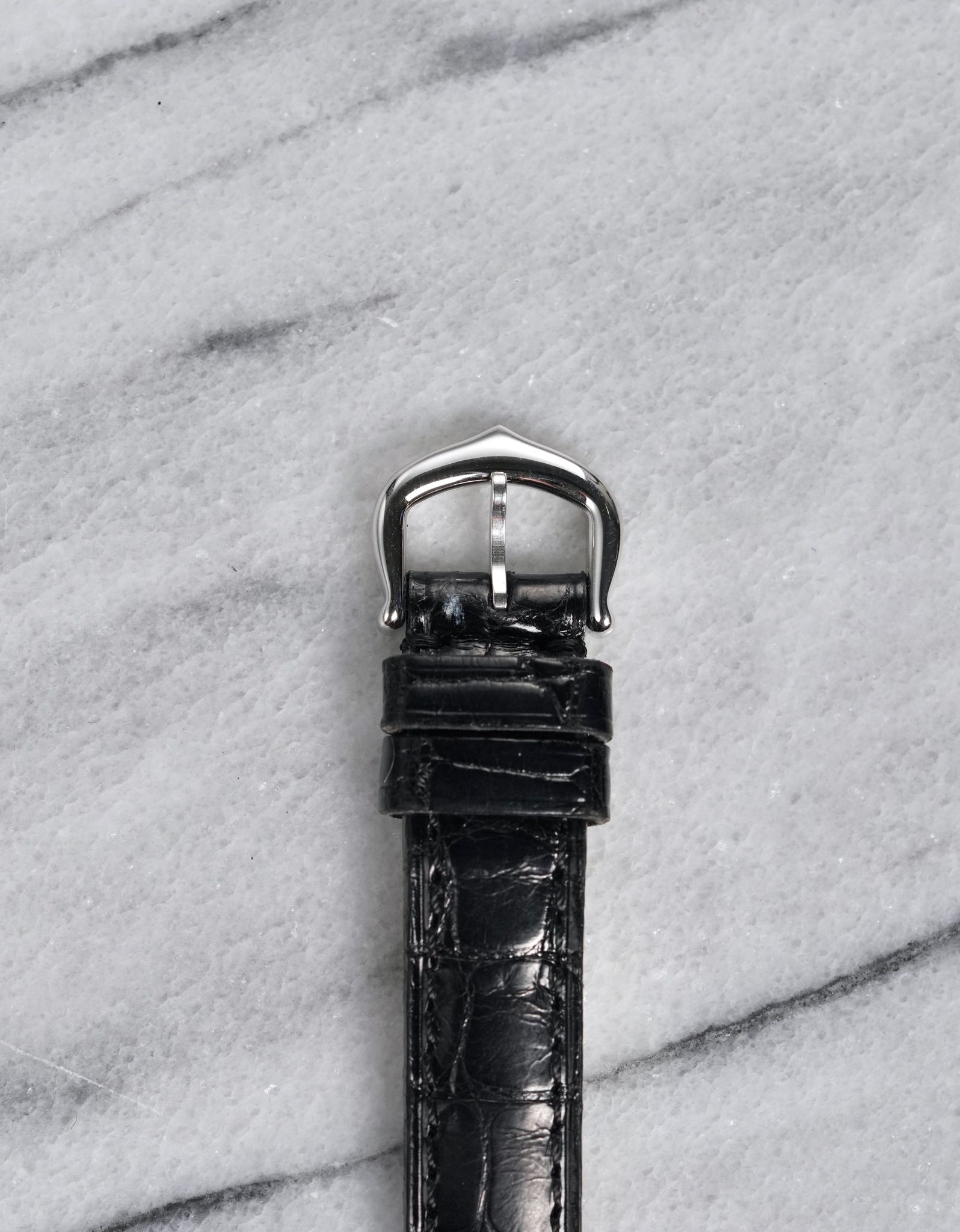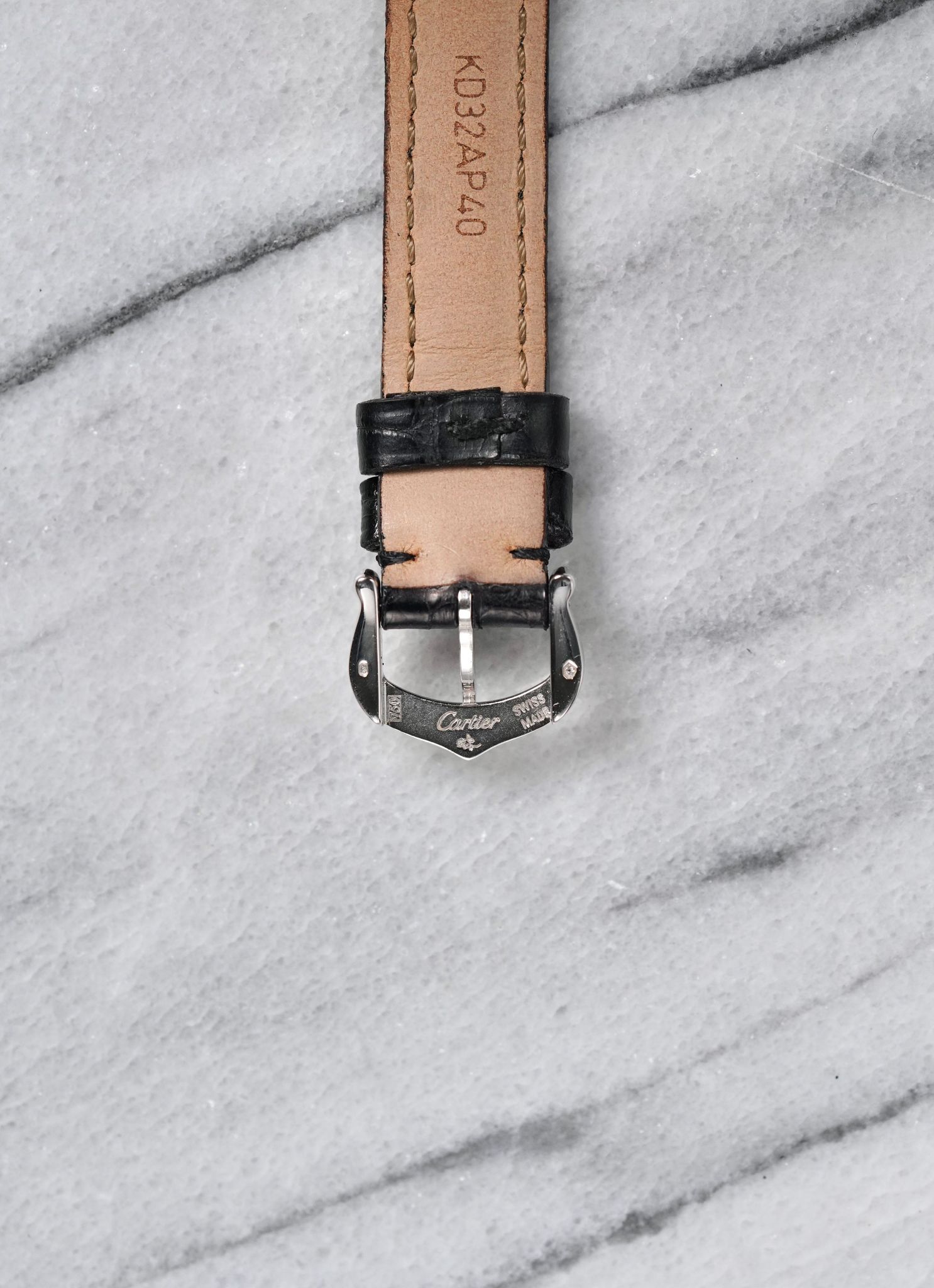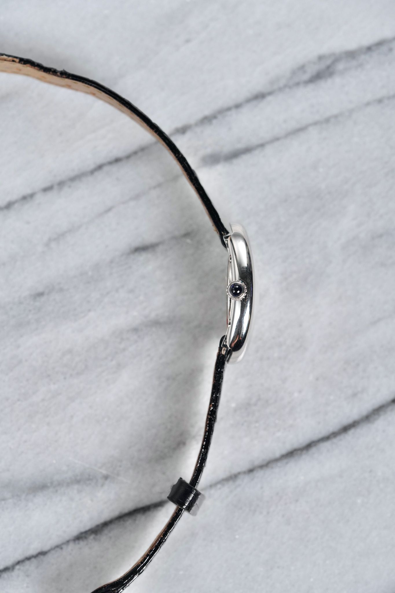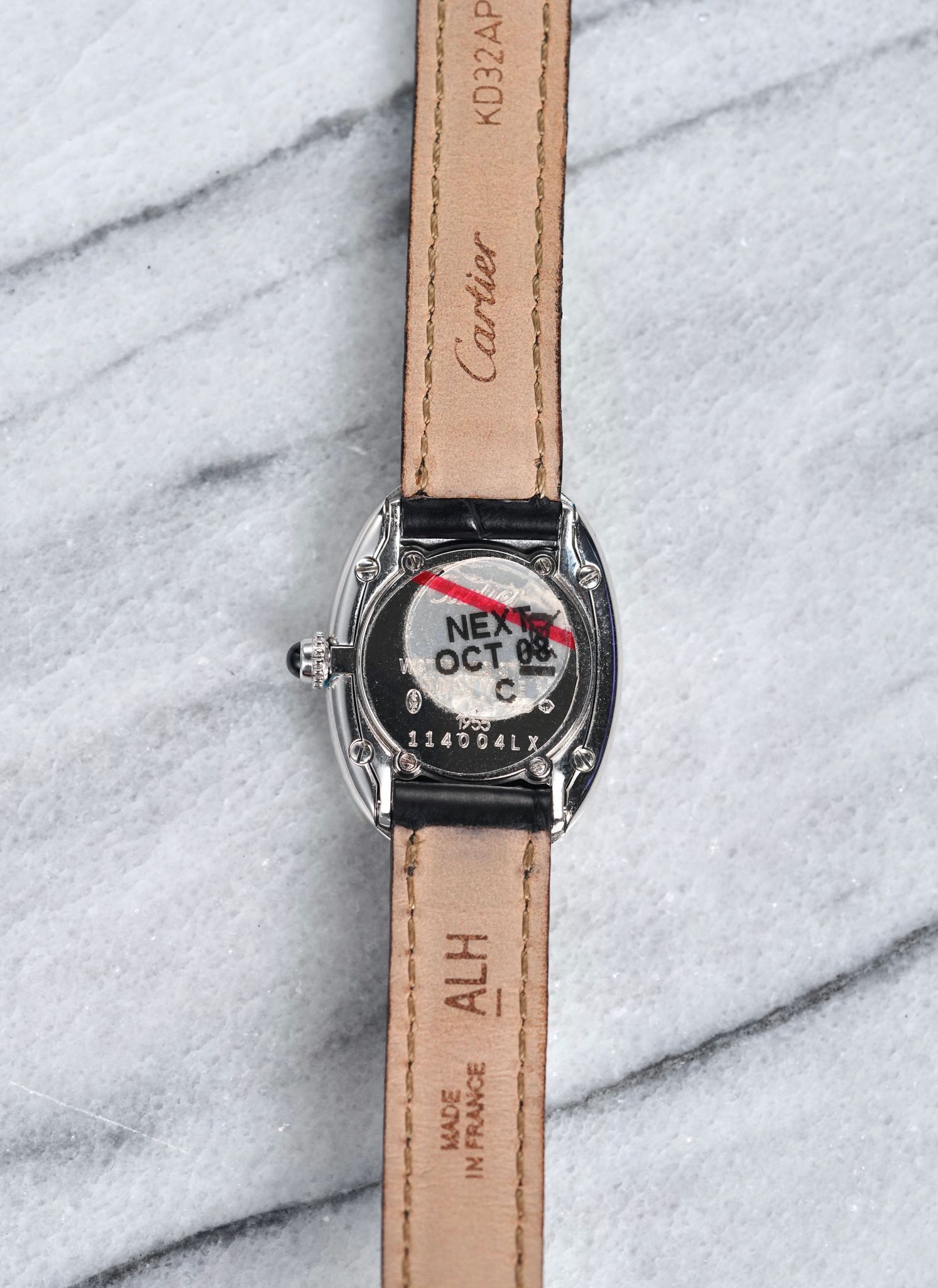 Here’s a Cartier Baignoire reference 1955 quartz with a 23x31mm oval case in 18k white gold from the 2000s. Keeps great time and is fully functional. Classic Cartier styling with a clean white Roman numeral dial, blued sword hands, and cabochon crown. Fitted on its original Cartier leather strap with signed white gold tang buckle. Original case, dial, and movement. Unisex. Fully functional and keeping time.