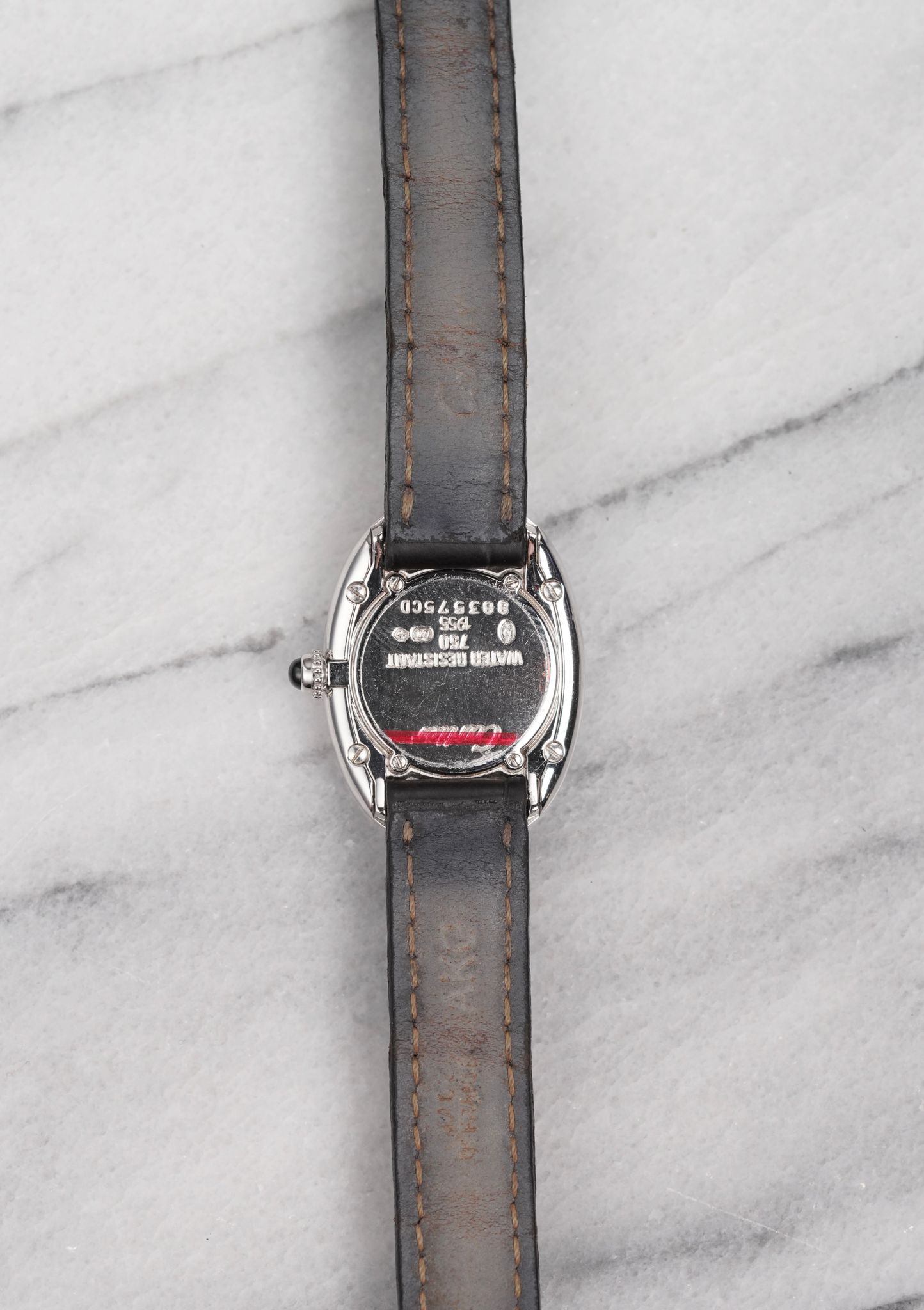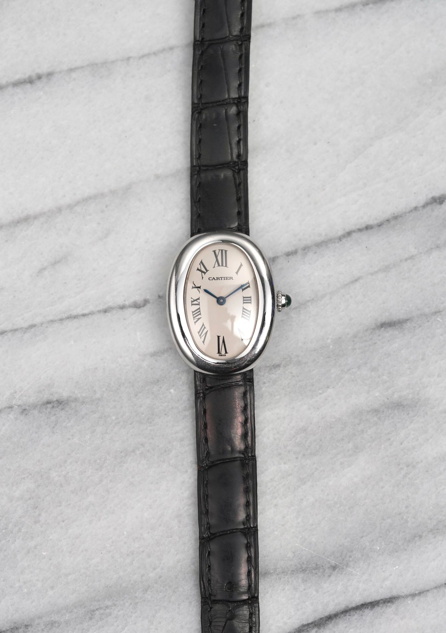 Here’s a Cartier Baignoire reference 1955 quartz with a 23x31mm oval case in 18k white gold from the 2000s. Keeps great time and is fully functional. Classic Cartier styling with a clean white Roman numeral dial, blued sword hands, and cabochon crown. Fitted on its original Cartier leather strap with signed white gold tang buckle. Original case, dial, and movement. Unisex. Fully functional and keeping time.