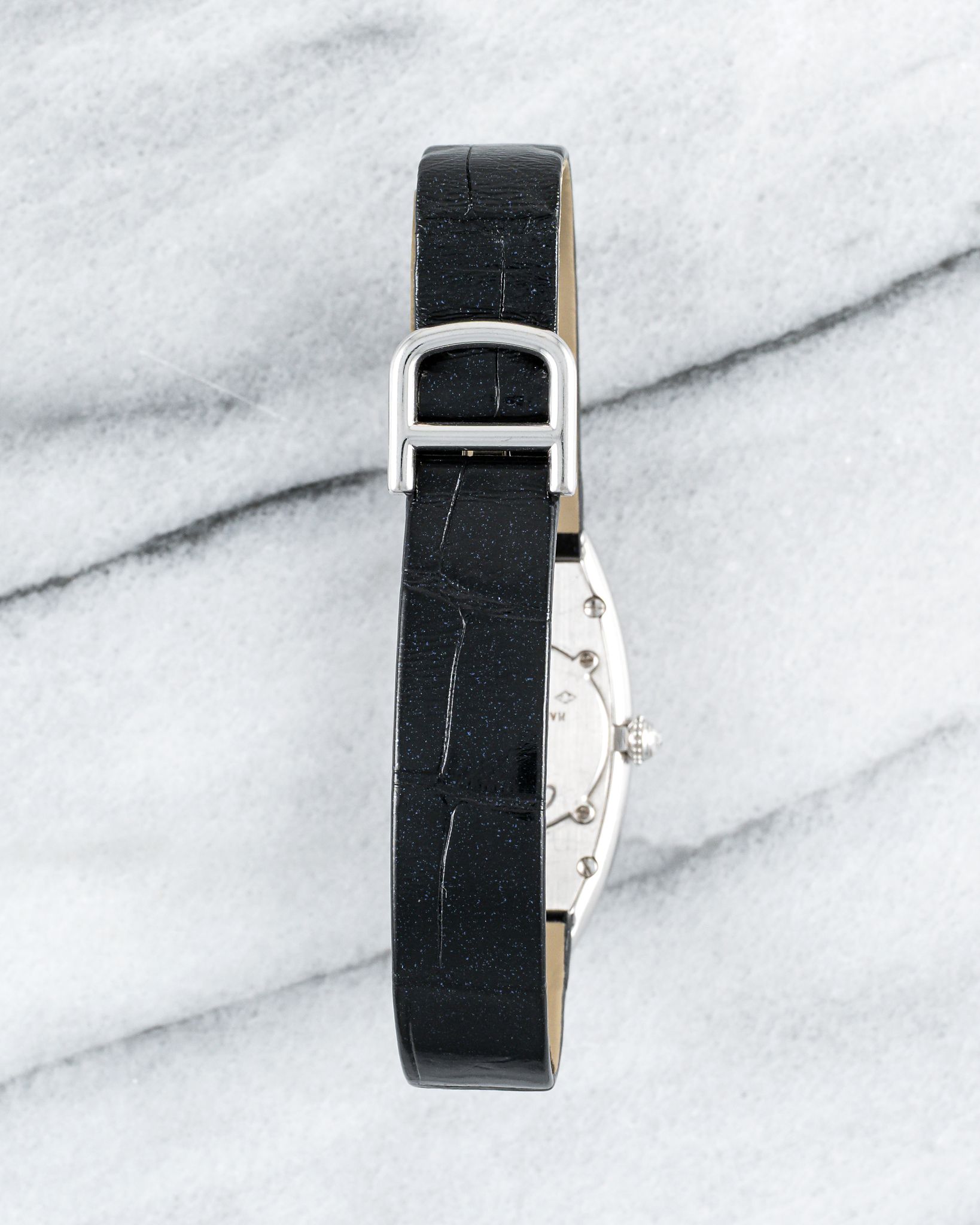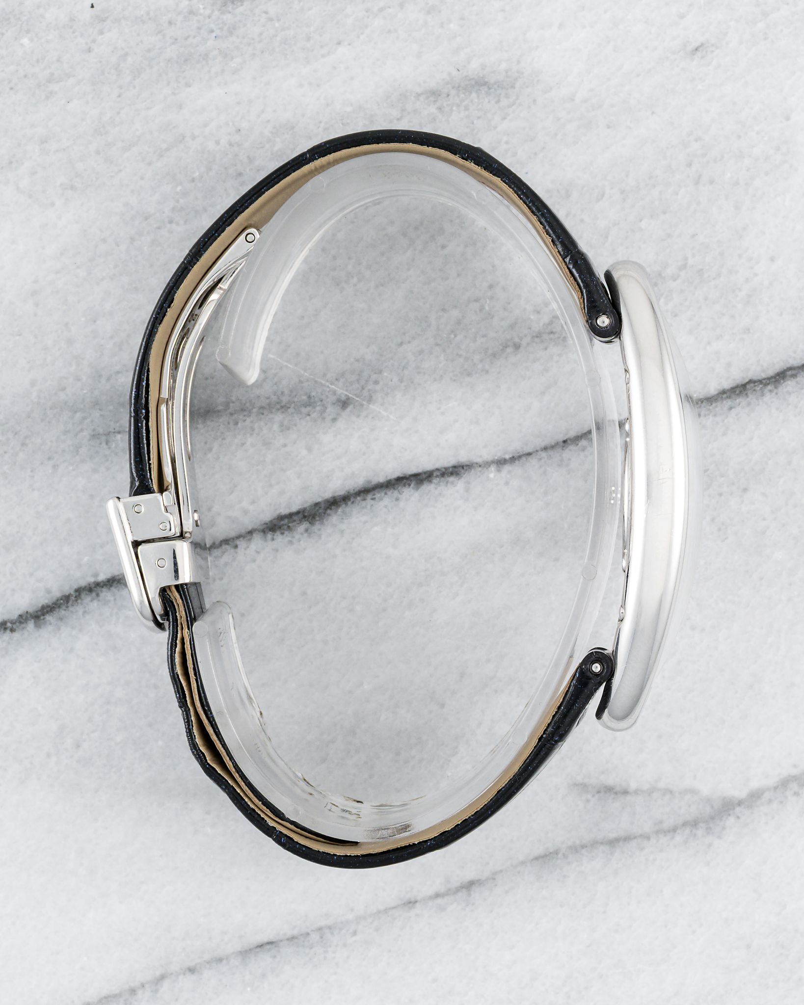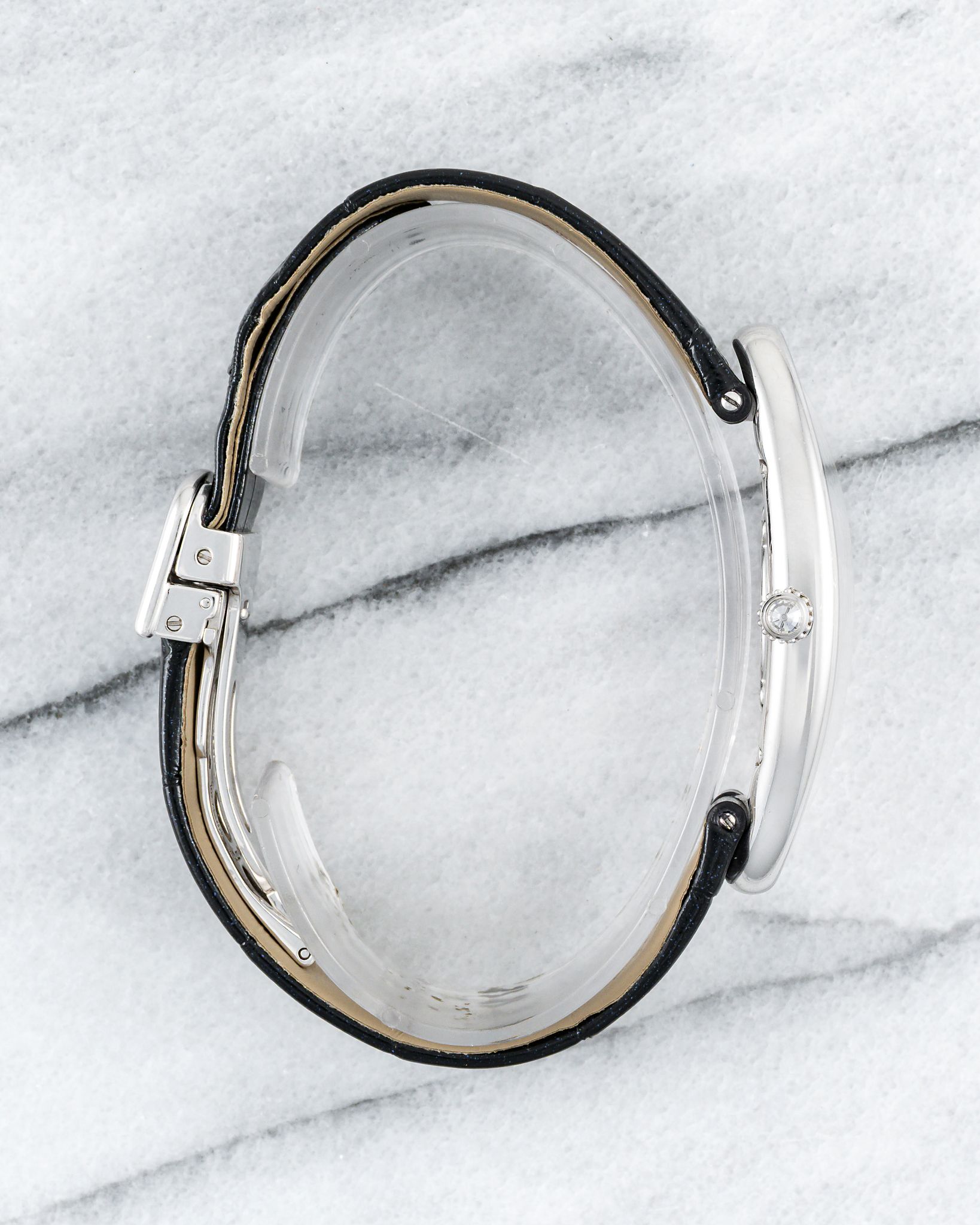 Here's a neo-vintage Cartier Baignoire Allongee reference 2514 in 18K white gold manual wind from the 2000s. Keeps great time and is fully functional. Measurements include a 21x47mm mm case size. It's on its original black alligator leather strap and matching white gold deployant. Time only. 18K yellow gold case and caseback. Factory diamond sapphire and diamond pave dial. Blued hands. Diamond cabochon crown. Unisex example. A great alternative to the coveted Cartier Crash. Examples like this are seldom soon so it's a great opportunity to own one! All parts are original including the cabochon crown, dial, movement, and caseback. Both the dial and case are in great cosmetic, untouched condition.