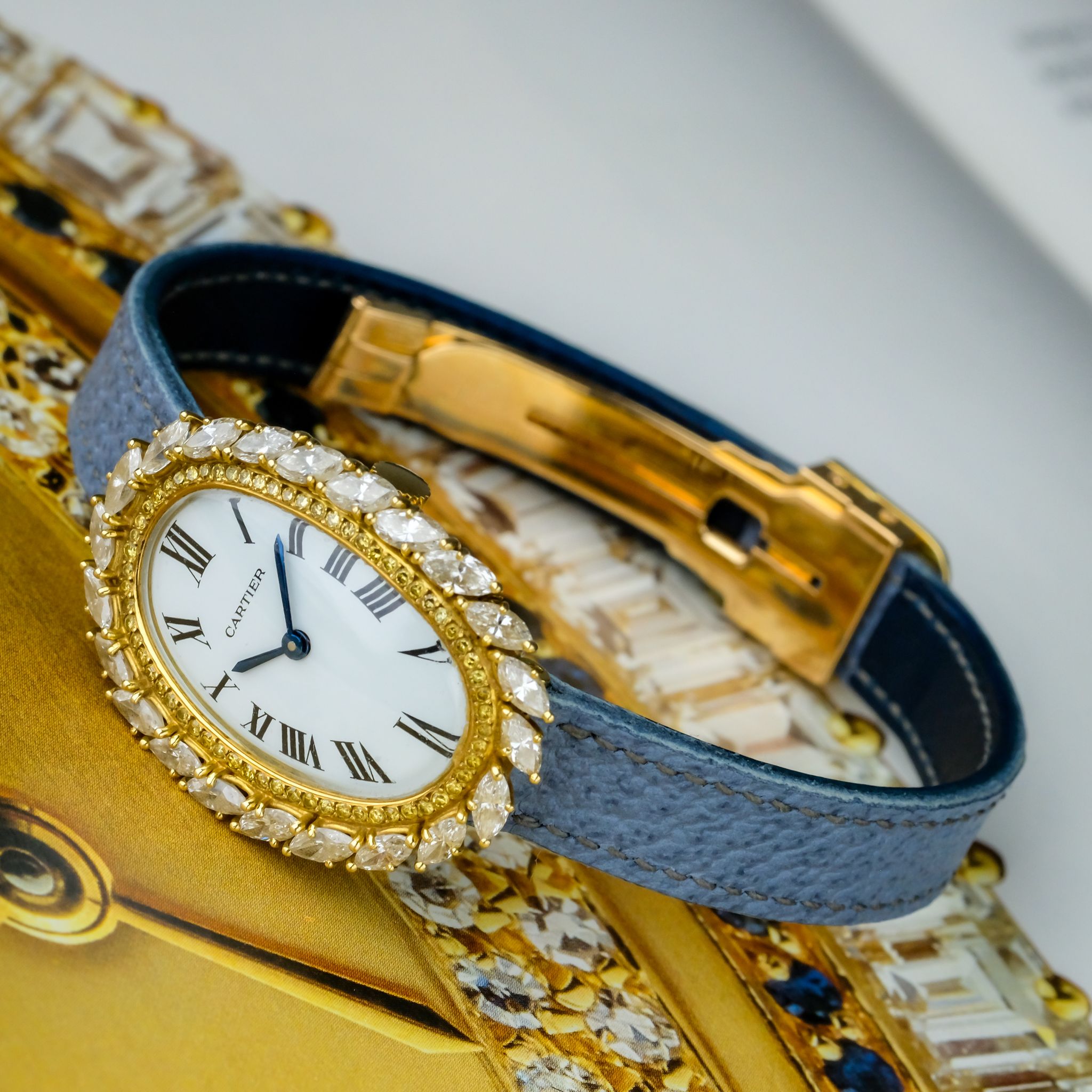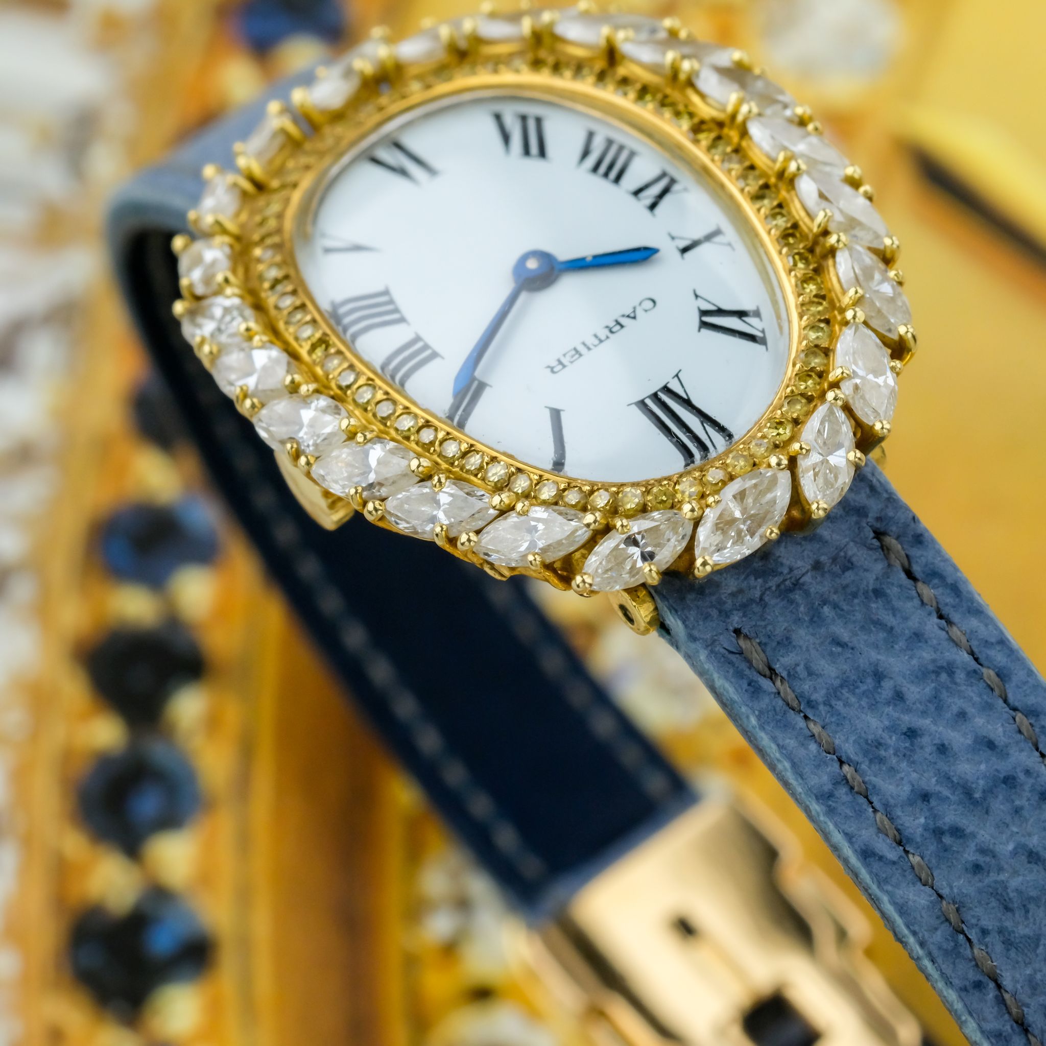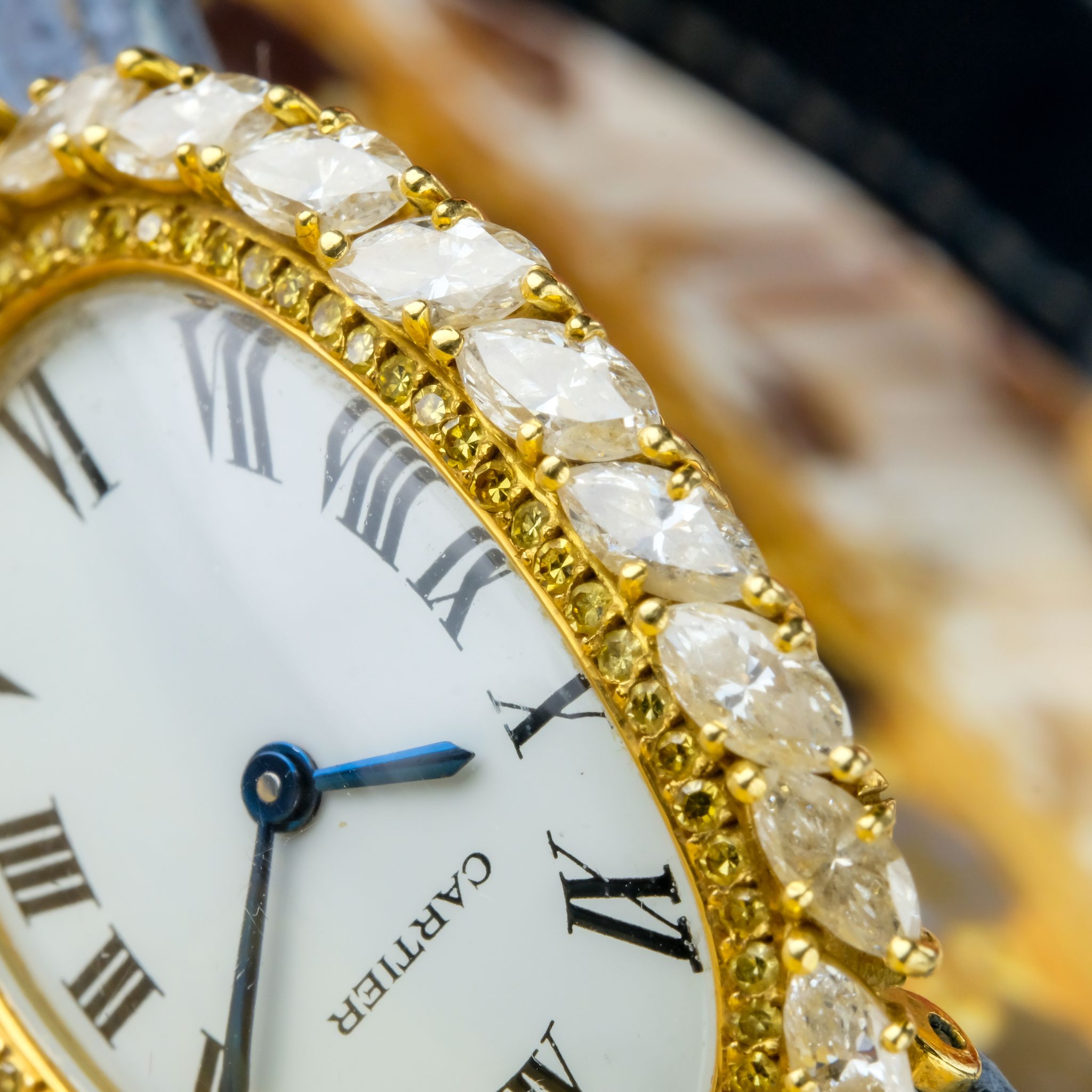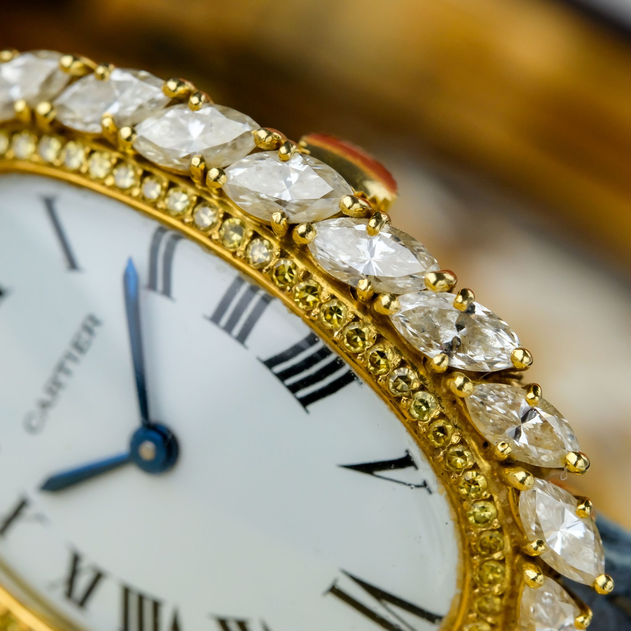 Hidden behind the typical reference 78094, this watch is everything but typical. It features two rows of exquisite, factory “sertissage” gemstones on the bezel, the outer one with 22 large “marquise” cut diamonds and the inner with smaller, brilliant cut yellow gemstones. This watch proves Cartier as the “king of jewelers and the jeweler of kings” again, because if that does not scream “royalty” what does? The case is in very good condition and features no scratches eventhough the construction makes scratches unlikely. The “Paris” signed dial is in very good condition and only has some slight spots to it. The watch comes on a handmade leather strap and with the original pre 1988 “deployante” folding clasp. The manual wind movement has recently been checked and runs properly.