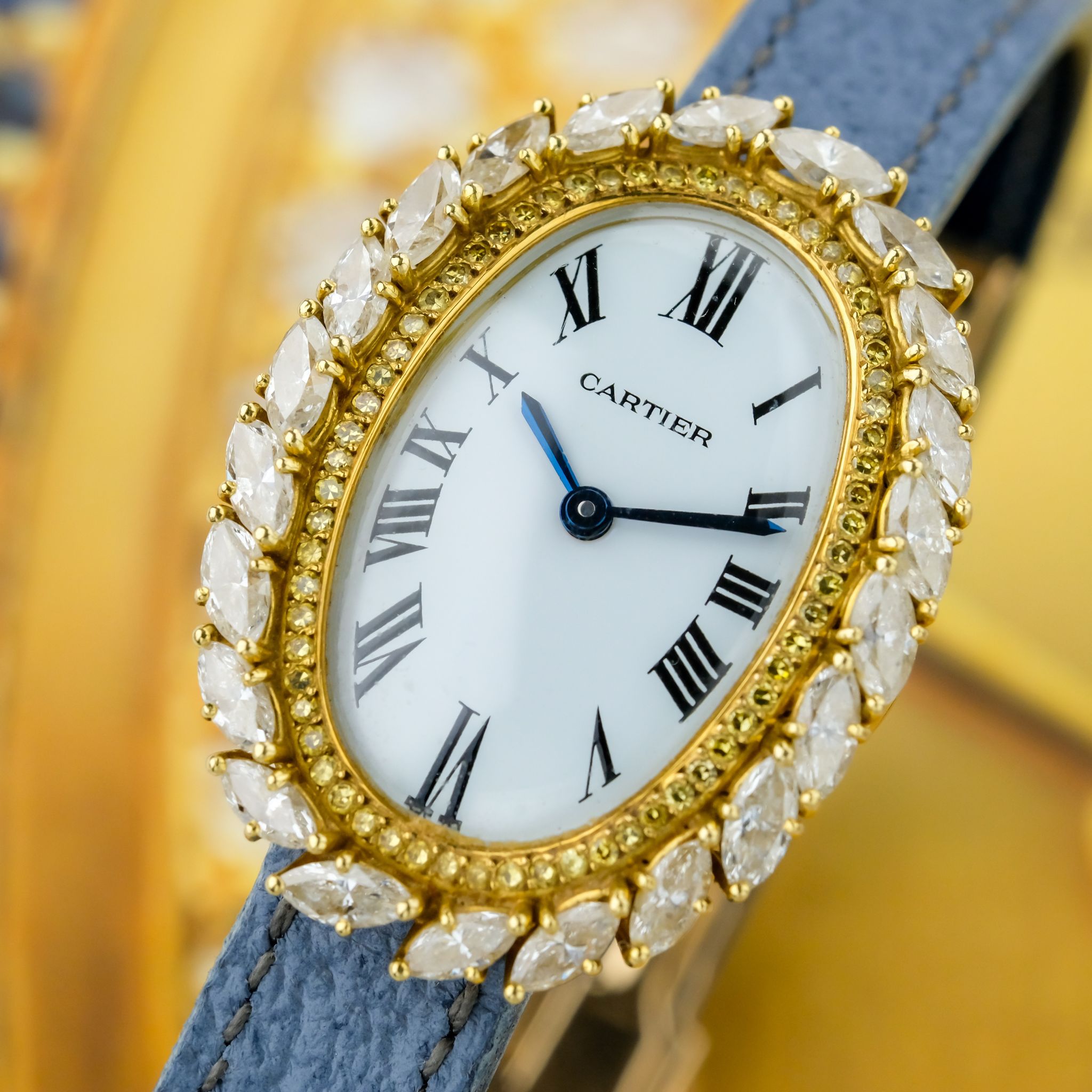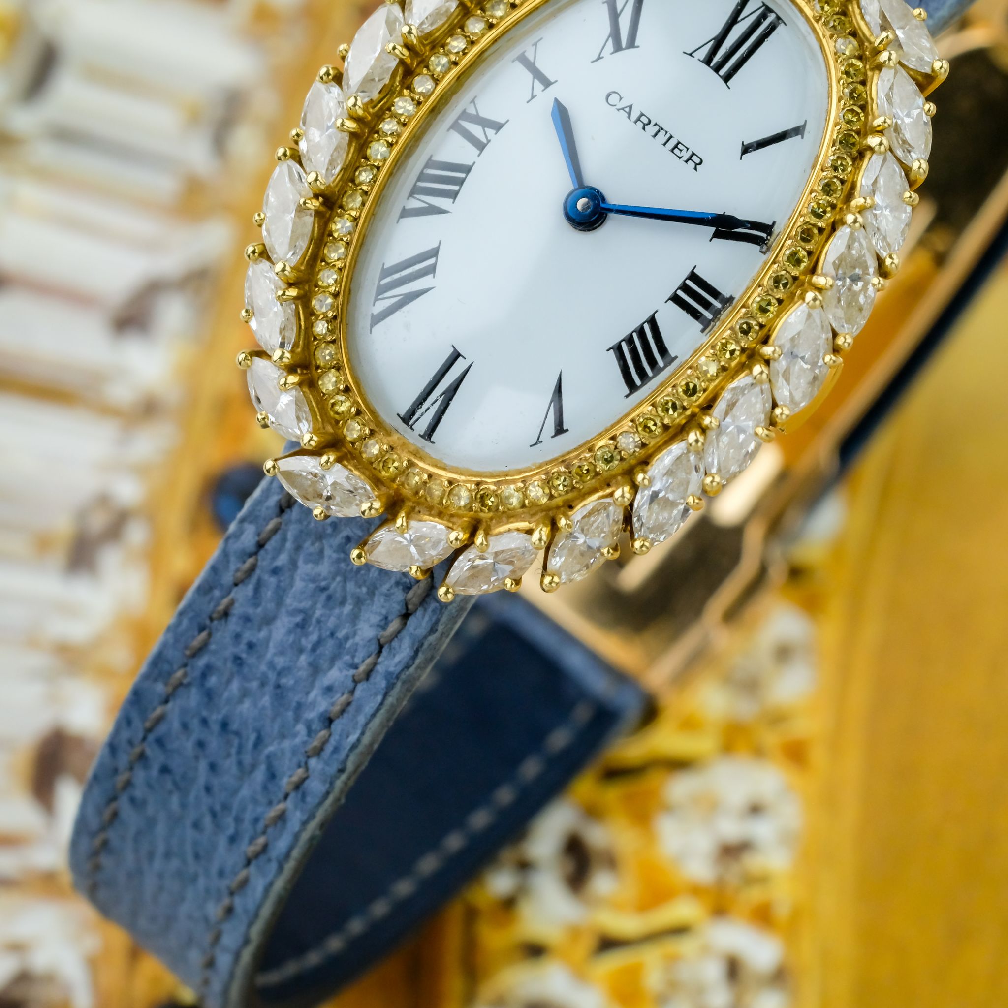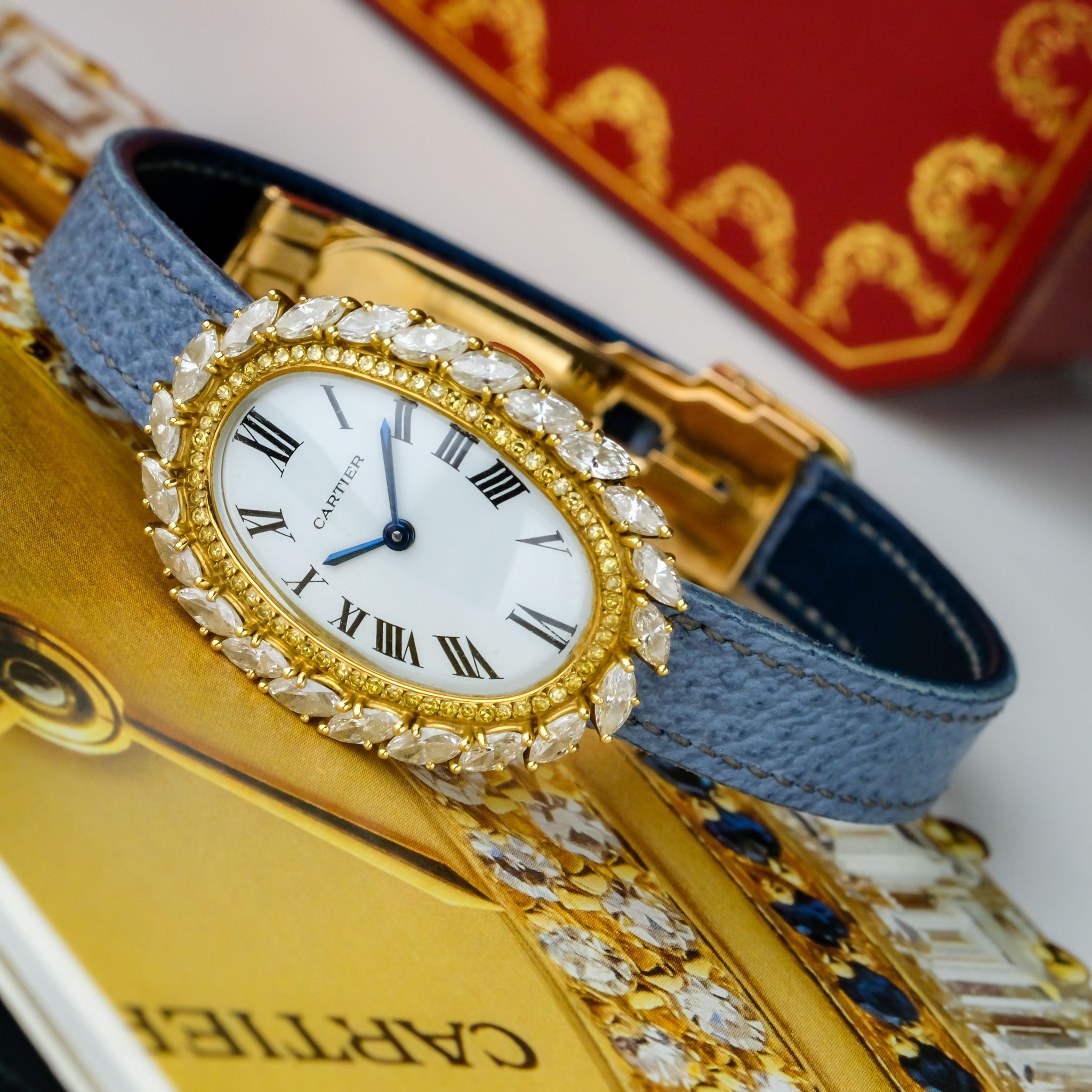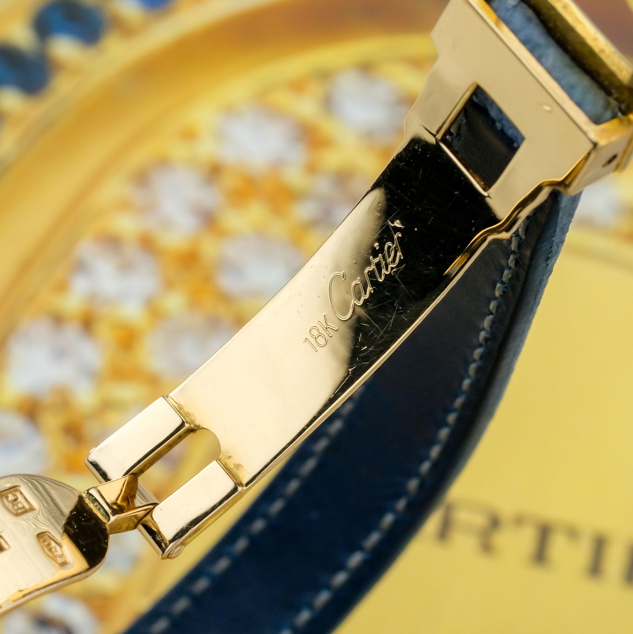 Hidden behind the typical reference 78094, this watch is everything but typical. It features two rows of exquisite, factory “sertissage” gemstones on the bezel, the outer one with 22 large “marquise” cut diamonds and the inner with smaller, brilliant cut yellow gemstones. This watch proves Cartier as the “king of jewelers and the jeweler of kings” again, because if that does not scream “royalty” what does? The case is in very good condition and features no scratches eventhough the construction makes scratches unlikely. The “Paris” signed dial is in very good condition and only has some slight spots to it. The watch comes on a handmade leather strap and with the original pre 1988 “deployante” folding clasp. The manual wind movement has recently been checked and runs properly.