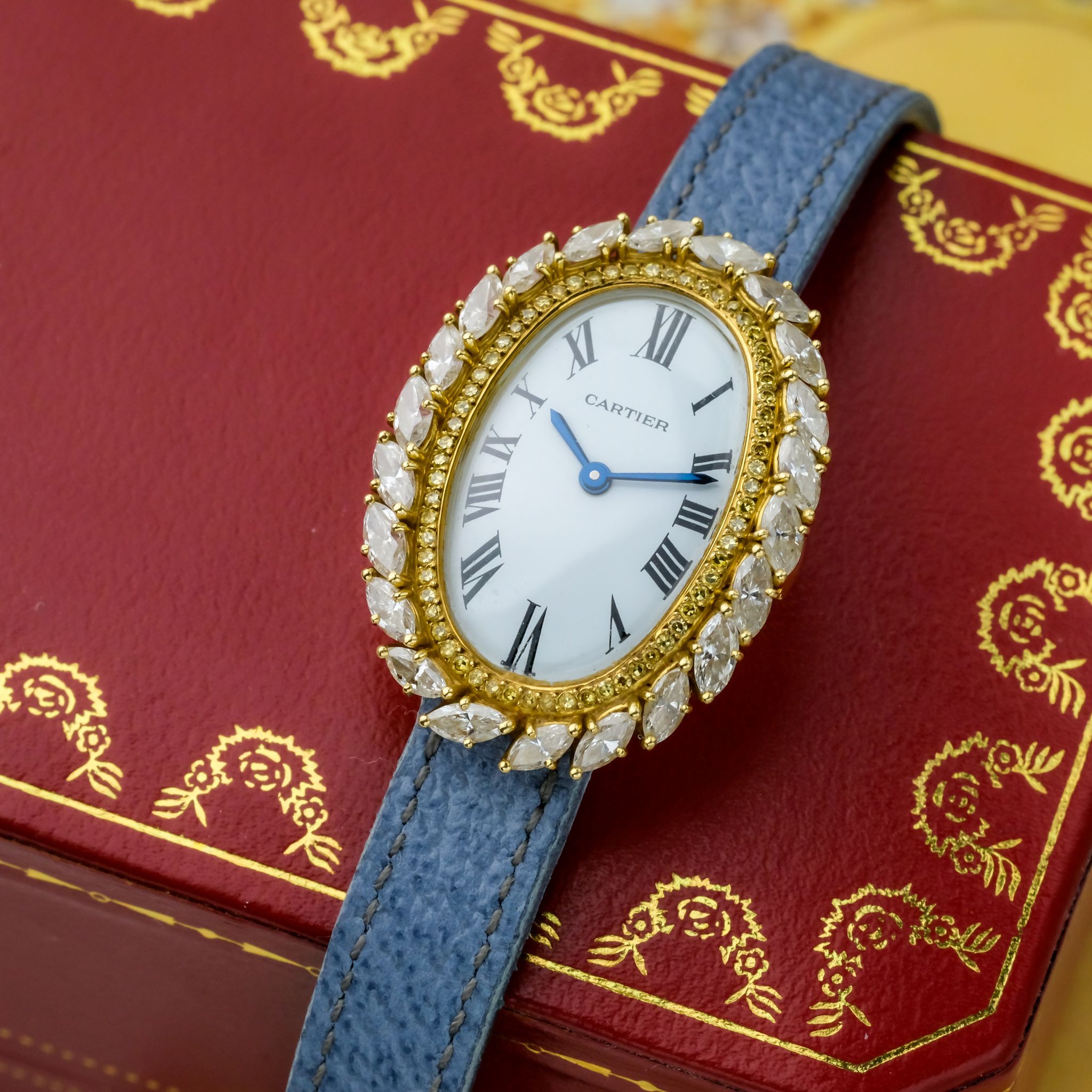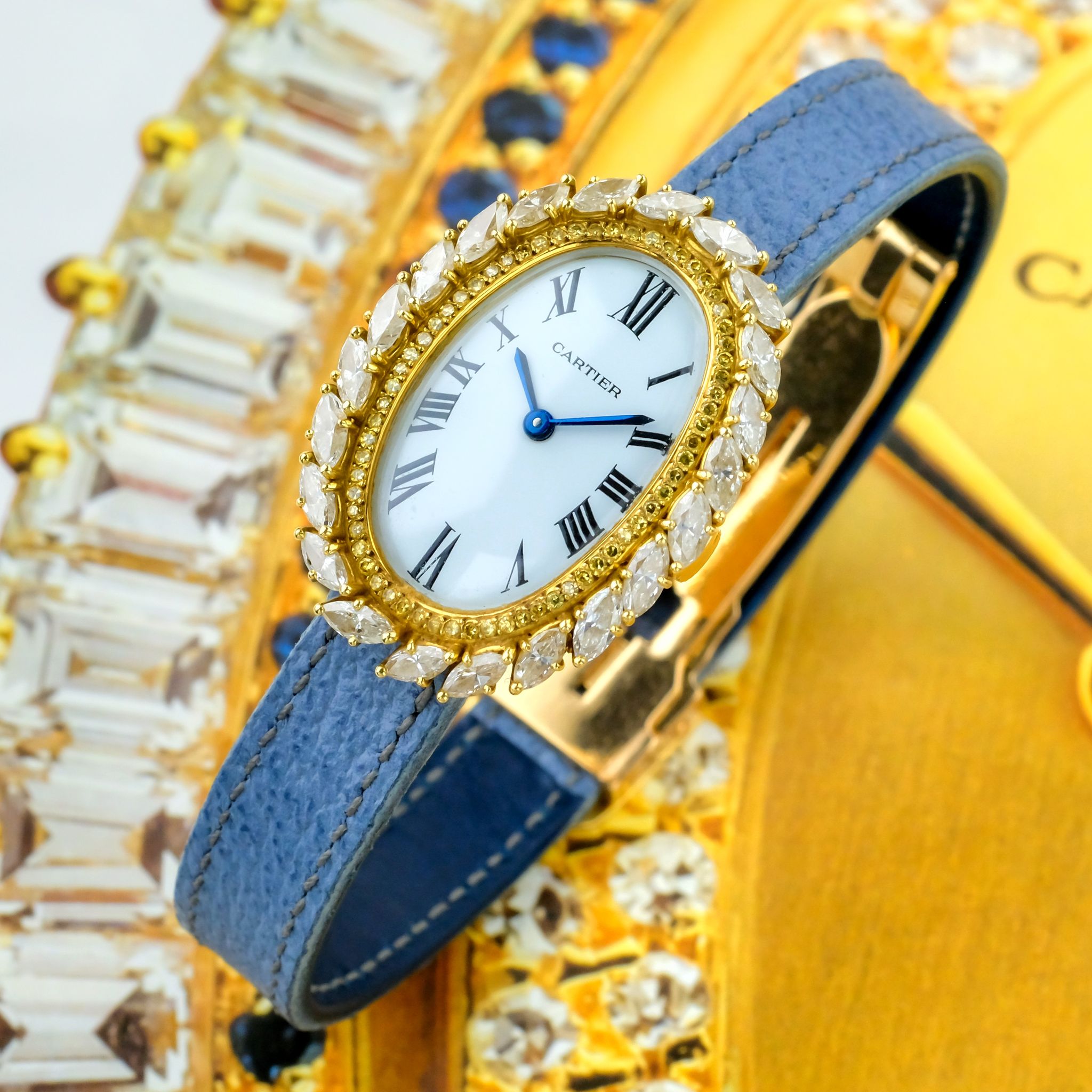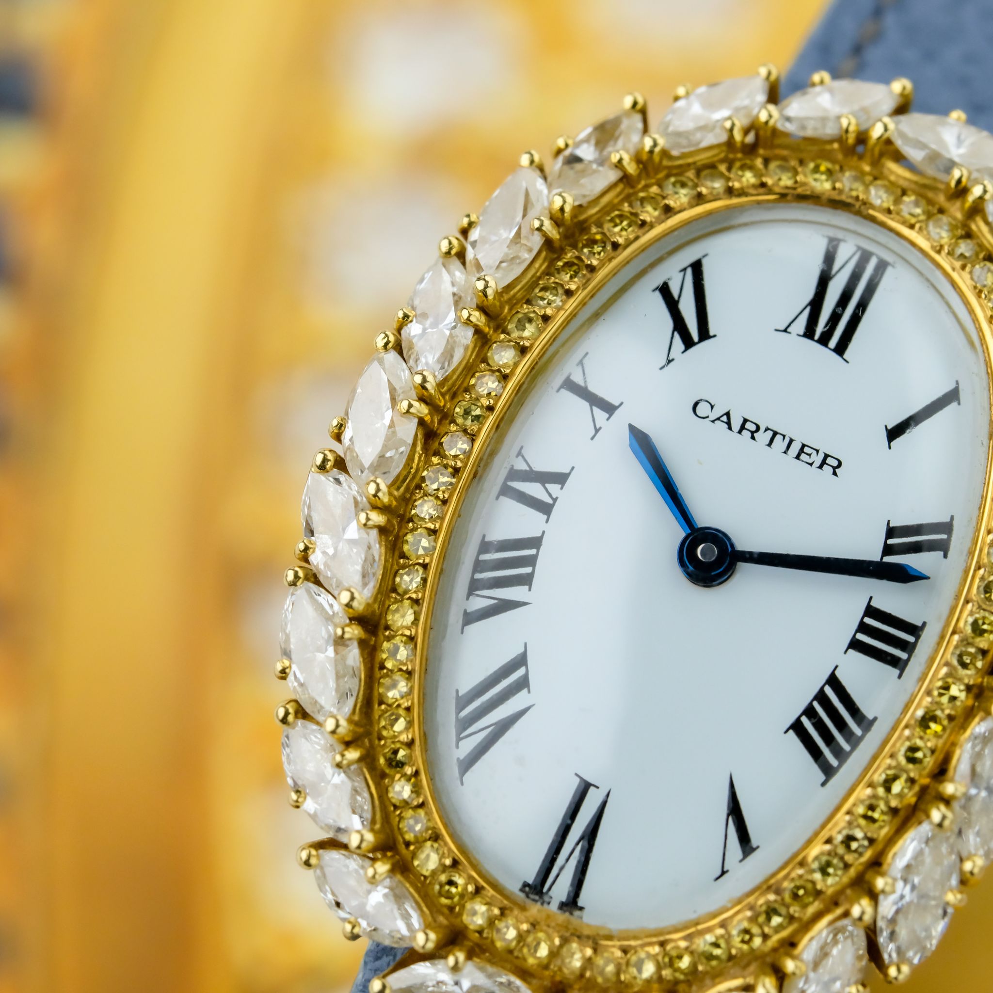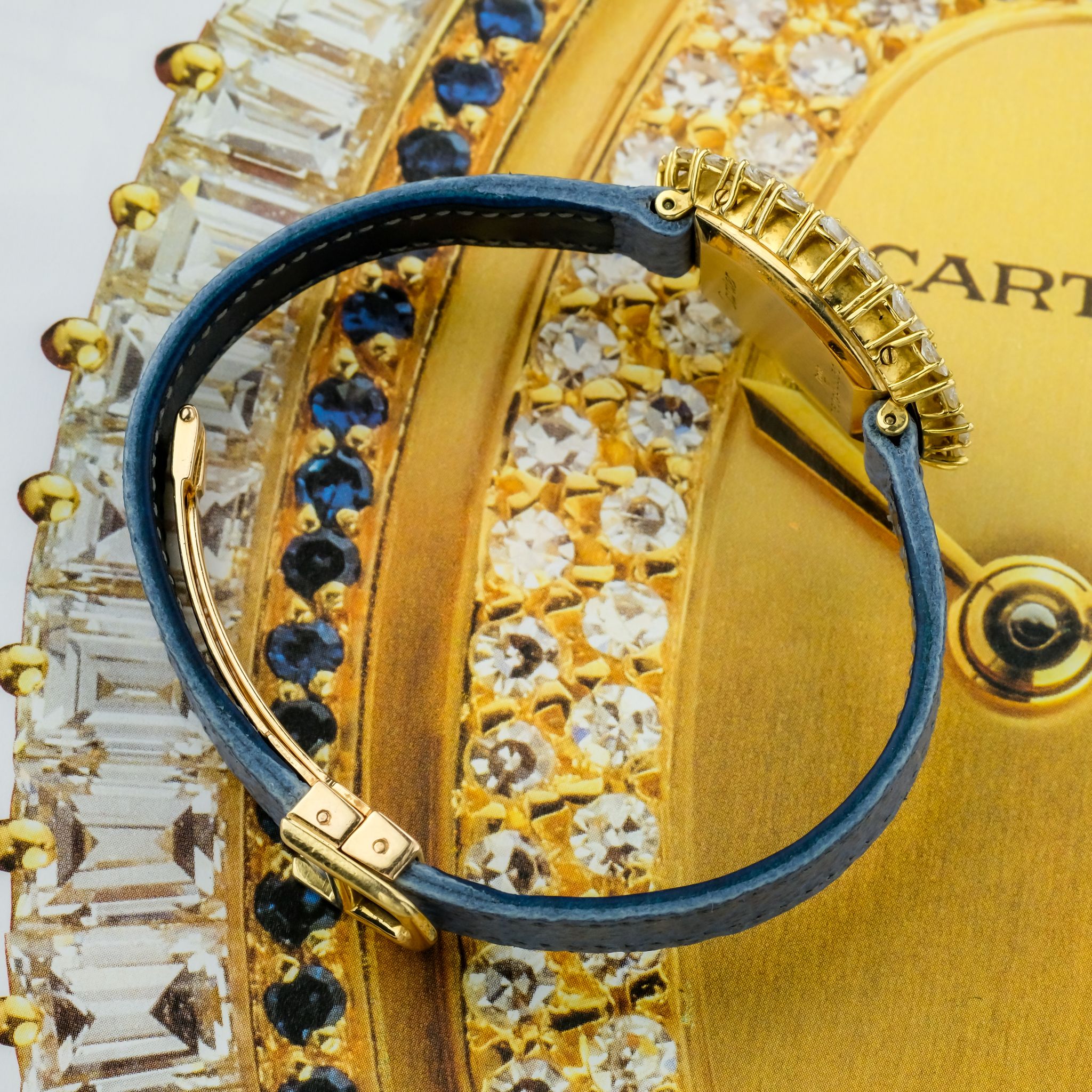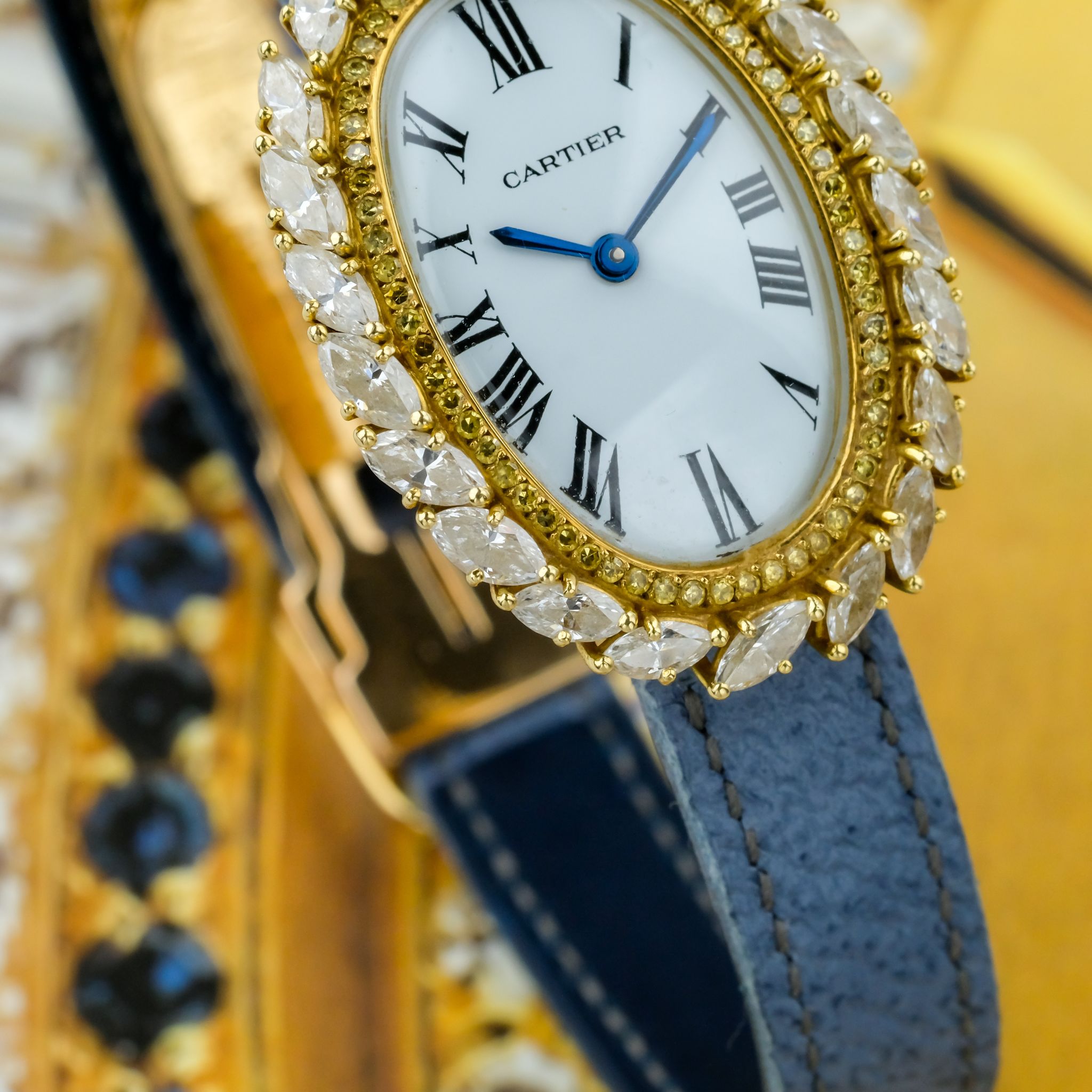 Hidden behind the typical reference 78094, this watch is everything but typical. It features two rows of exquisite, factory “sertissage” gemstones on the bezel, the outer one with 22 large “marquise” cut diamonds and the inner with smaller, brilliant cut yellow gemstones. This watch proves Cartier as the “king of jewelers and the jeweler of kings” again, because if that does not scream “royalty” what does? The case is in very good condition and features no scratches eventhough the construction makes scratches unlikely. The “Paris” signed dial is in very good condition and only has some slight spots to it. The watch comes on a handmade leather strap and with the original pre 1988 “deployante” folding clasp. The manual wind movement has recently been checked and runs properly.
