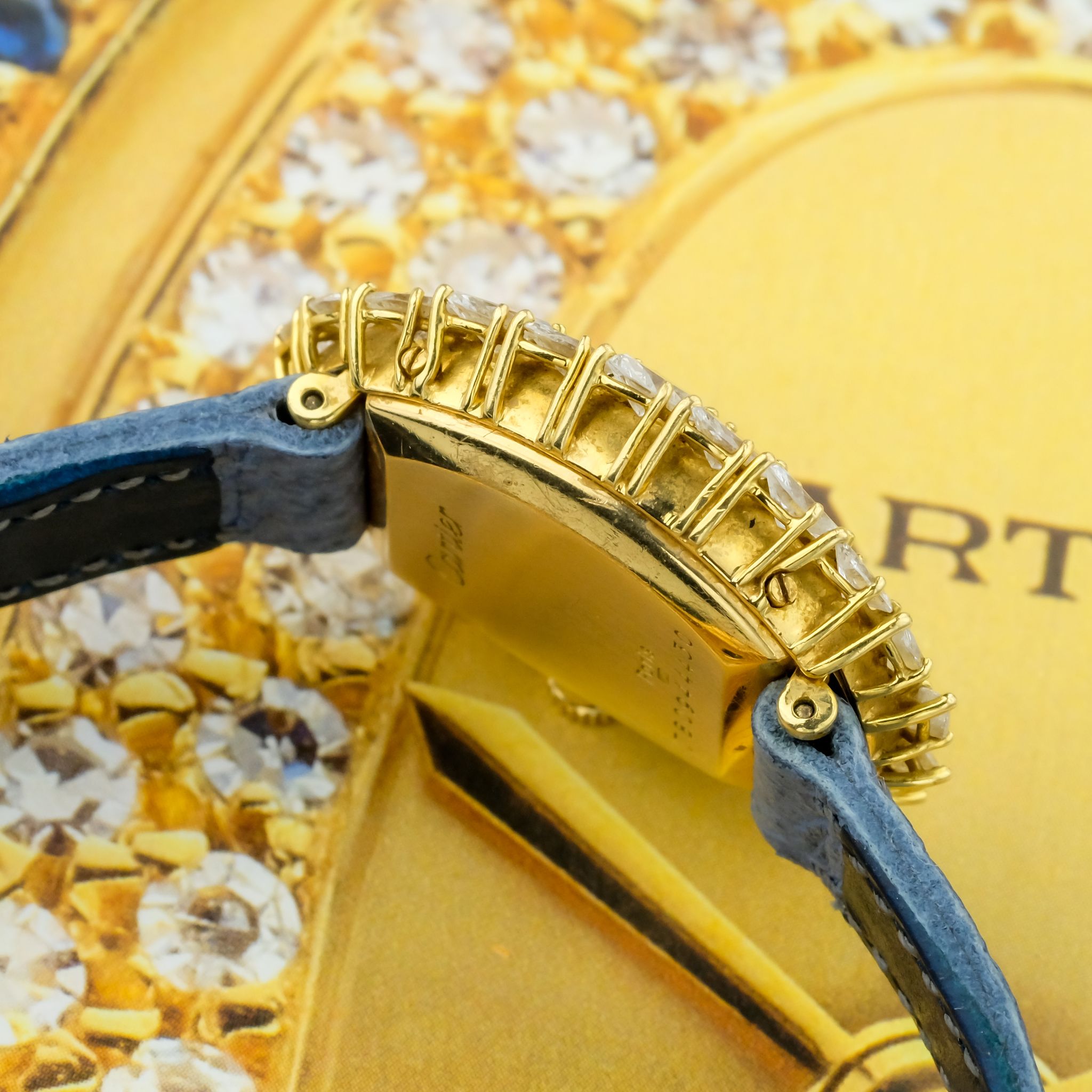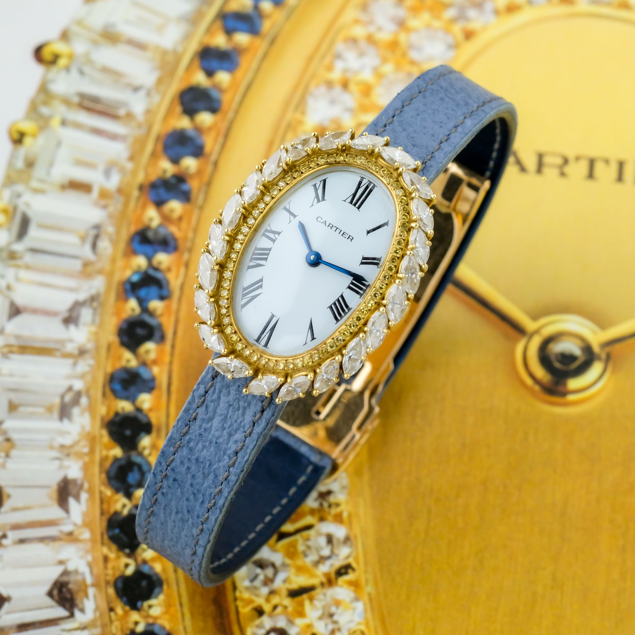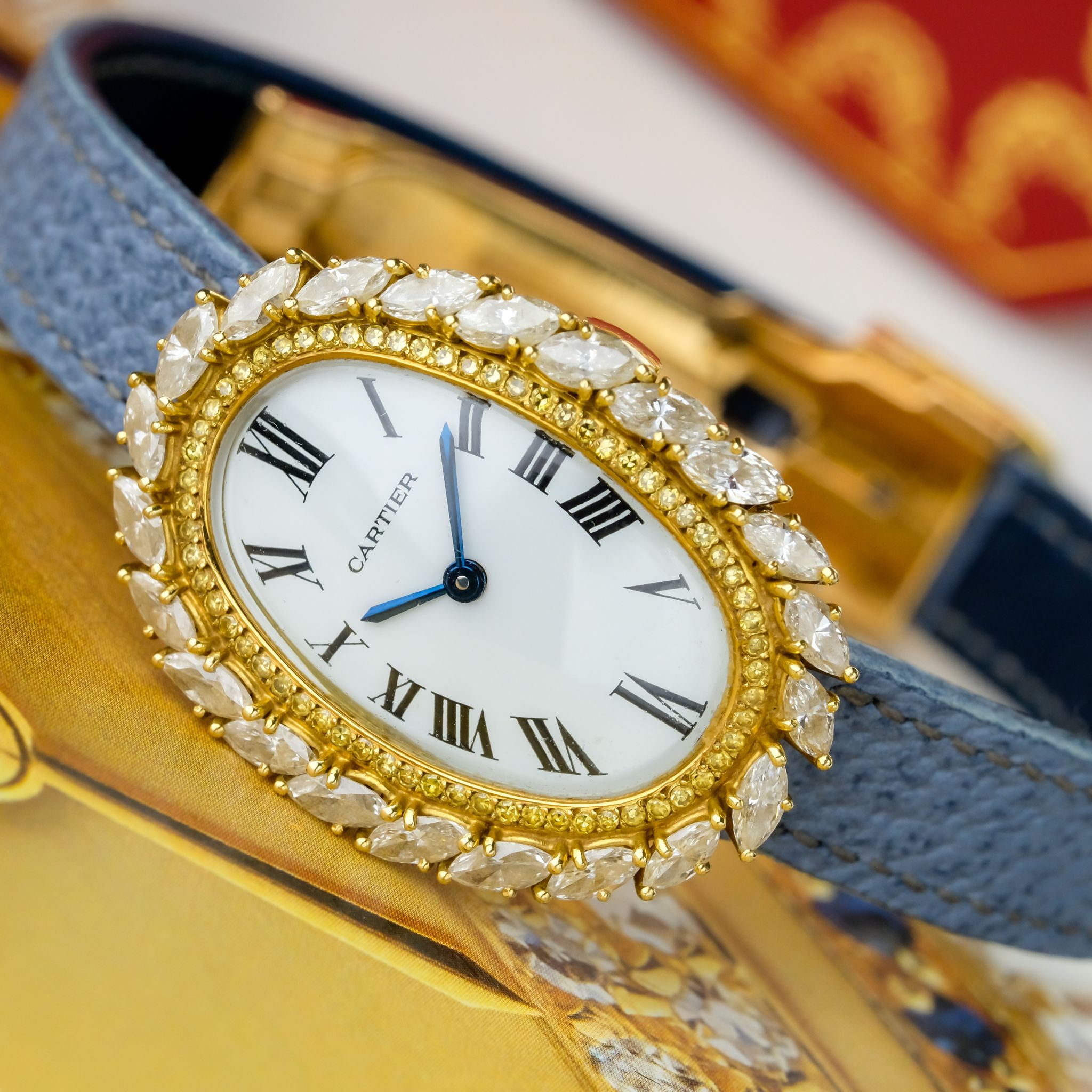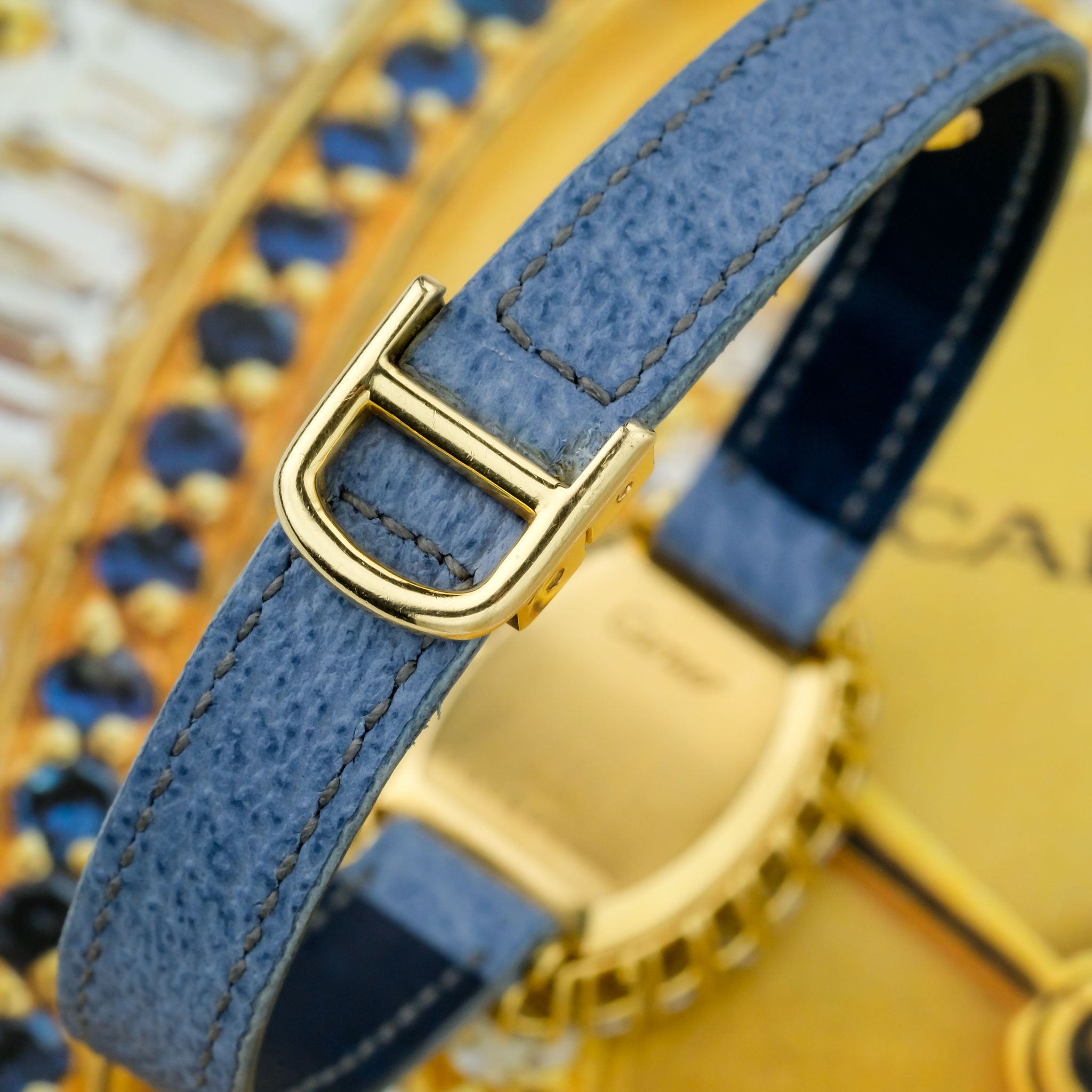 Hidden behind the typical reference 78094, this watch is everything but typical. It features two rows of exquisite, factory “sertissage” gemstones on the bezel, the outer one with 22 large “marquise” cut diamonds and the inner with smaller, brilliant cut yellow gemstones. This watch proves Cartier as the “king of jewelers and the jeweler of kings” again, because if that does not scream “royalty” what does? The case is in very good condition and features no scratches eventhough the construction makes scratches unlikely. The “Paris” signed dial is in very good condition and only has some slight spots to it. The watch comes on a handmade leather strap and with the original pre 1988 “deployante” folding clasp. The manual wind movement has recently been checked and runs properly.