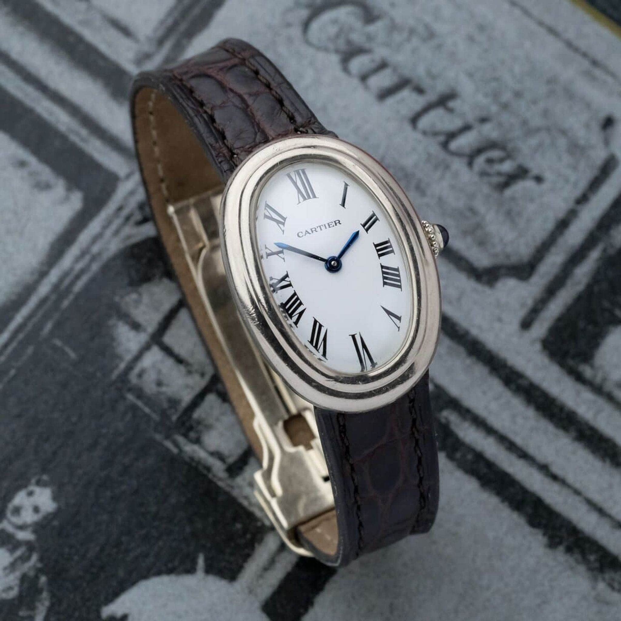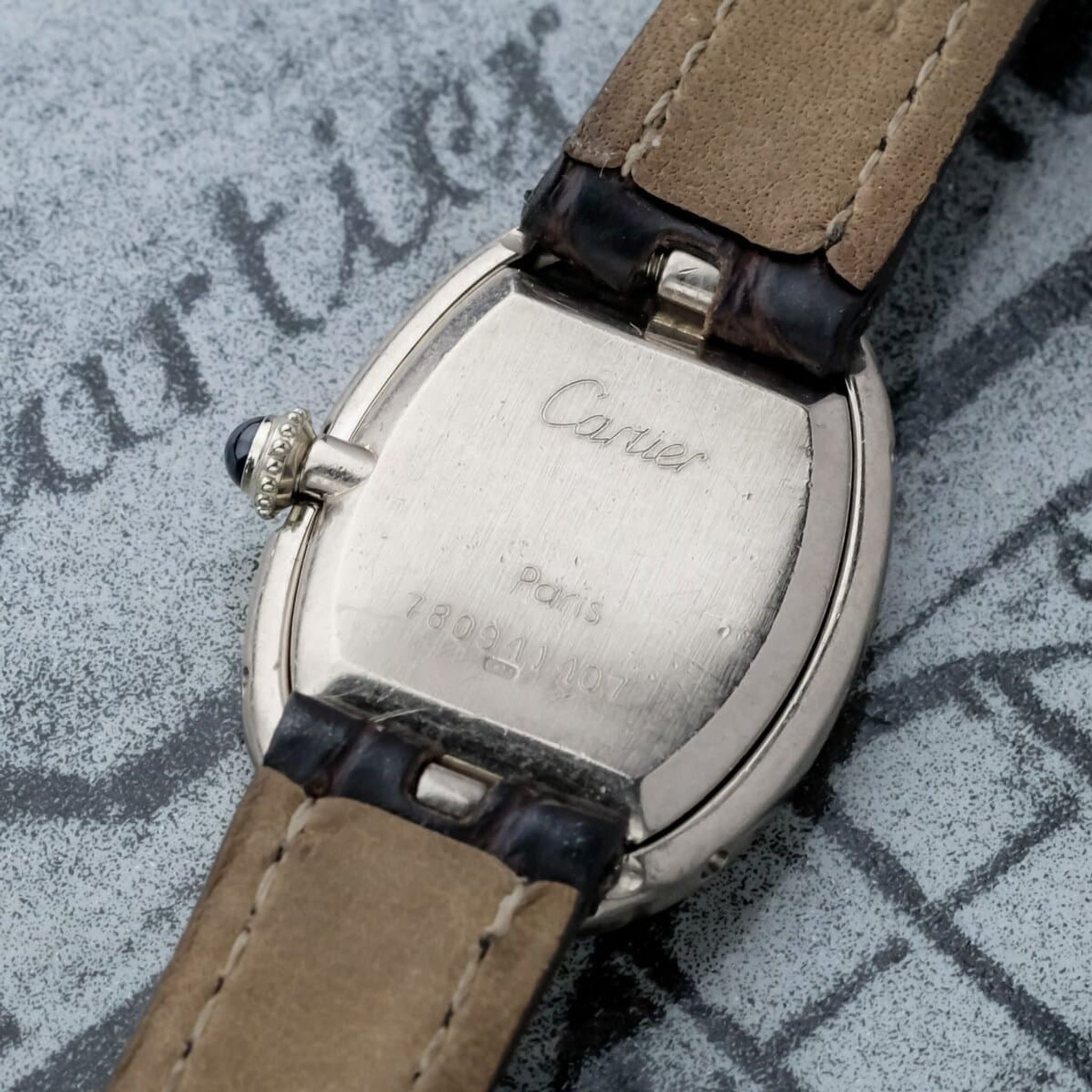The case remains in excellent unpolished condition with sharp engravings on the caseback and only light, normal signs of wear. Seldom encountered in this configuration, this Baignoire GM is a highly desirable vintage Cartier that combines refined proportions, mechanical charm and the discreet luxury of white gold.