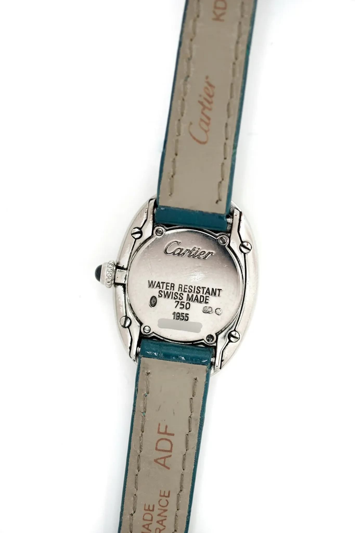 Rounded all-gold case, white dial, black indexes and blue hands: all the codes of the Cartier Baignoire are laid down. This model, ref. 1955, is mounted on a Cartier strap in duck blue leather, the color of which blends particularly well with the 18-carat white gold of the case. This accentuates its elegance.