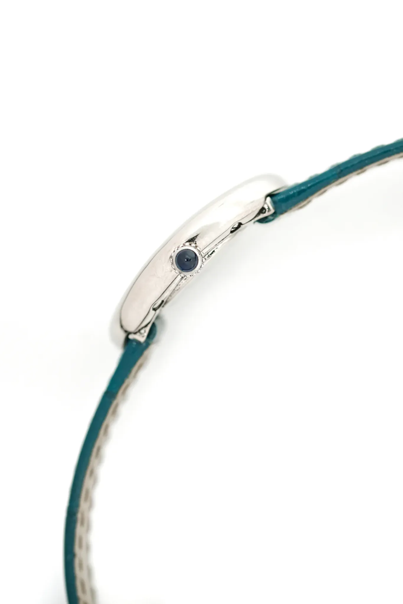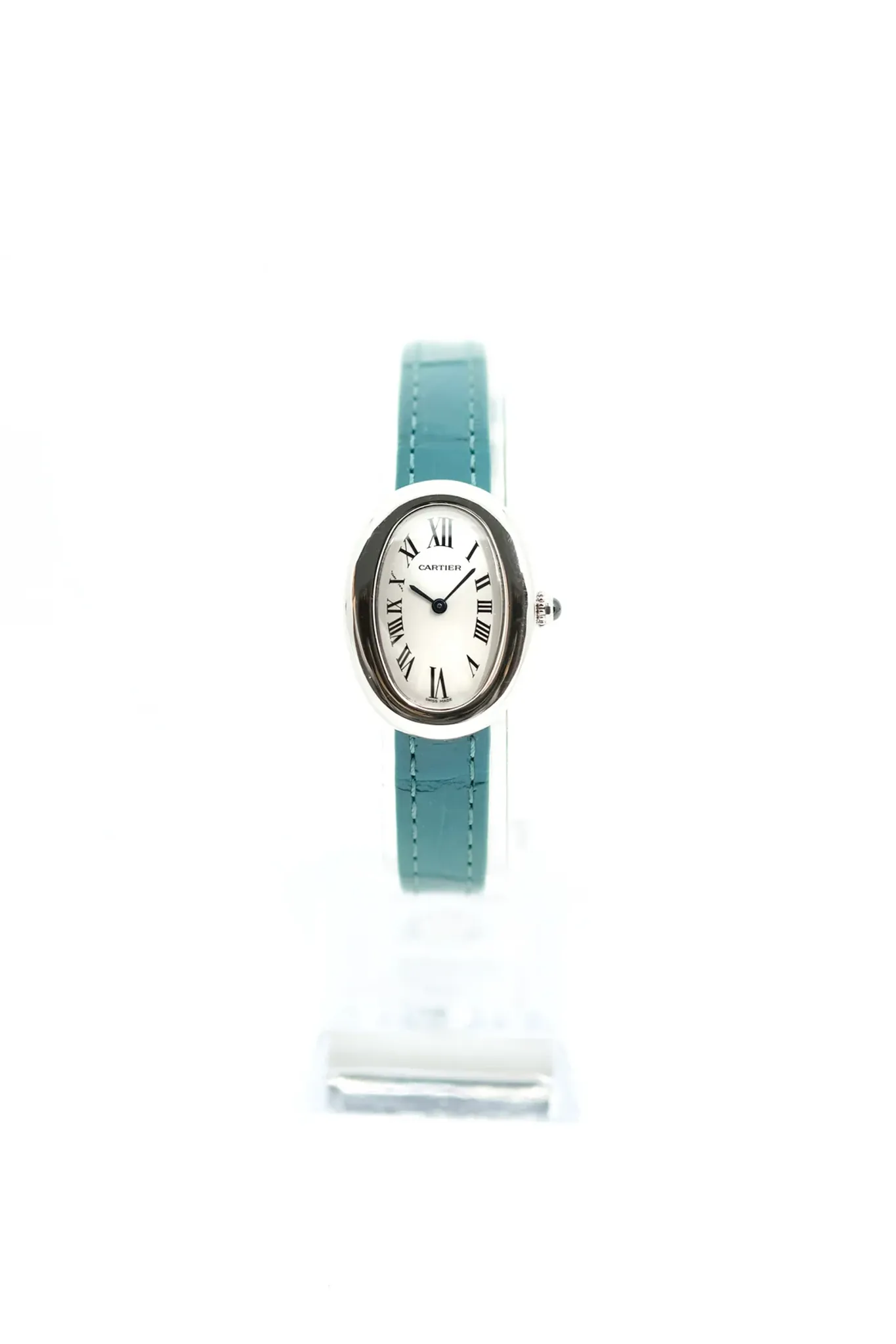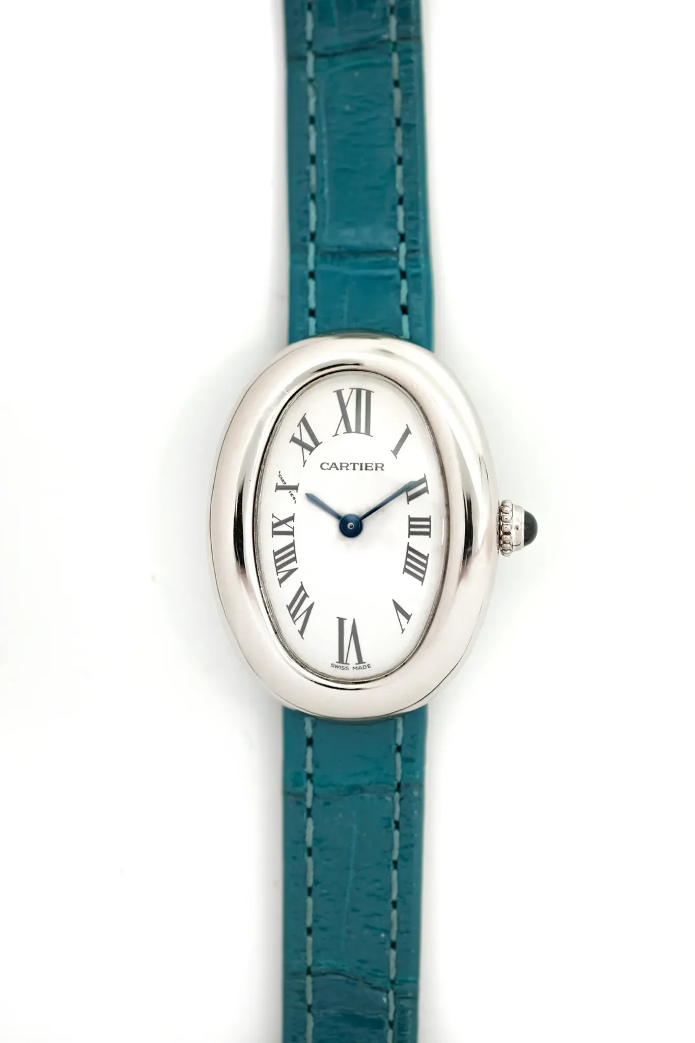 Case and pin buckle in 18 carats white gold. Cartier strap in duck blue alligator leather. With Cartier box and service invoice.