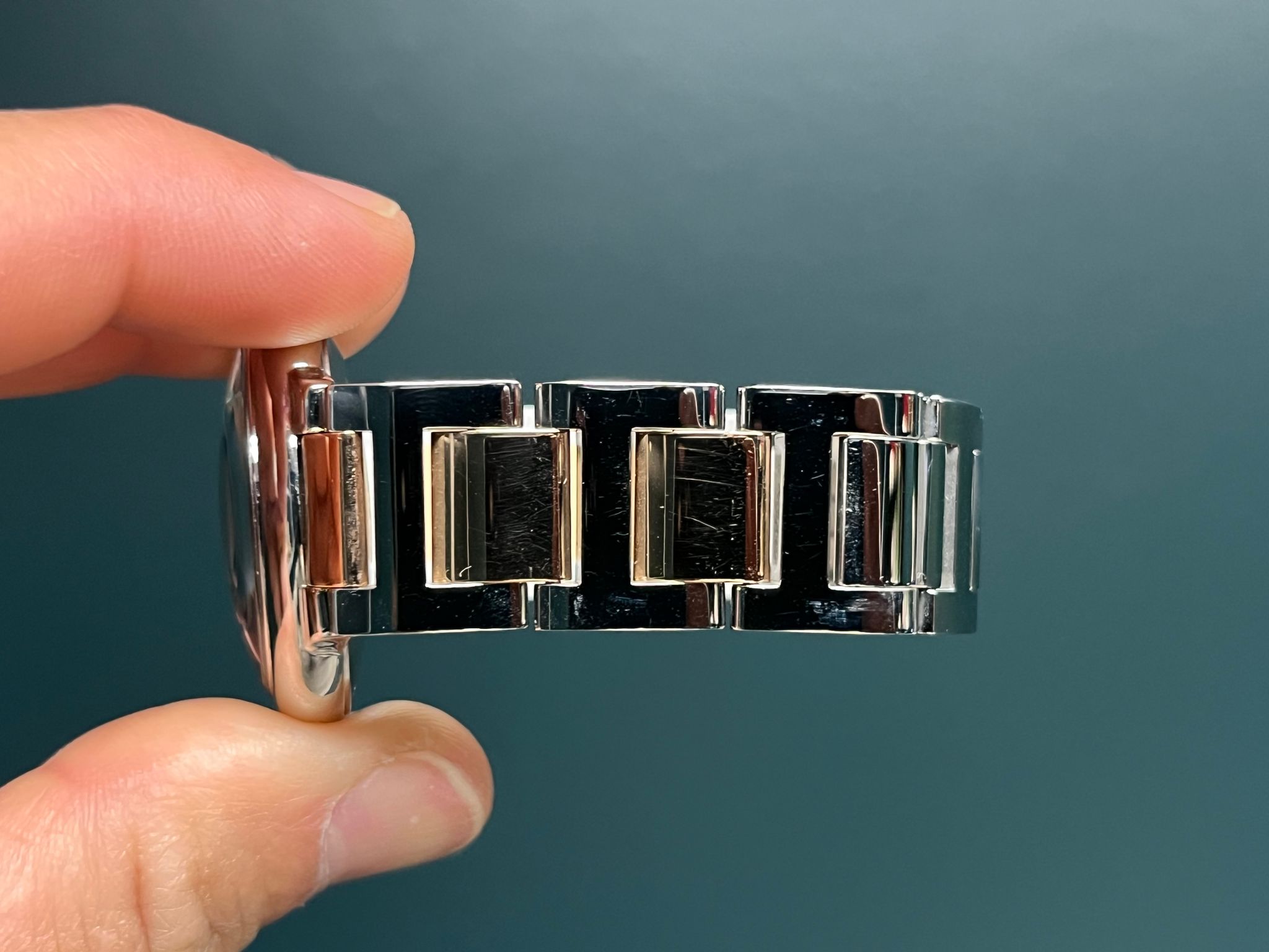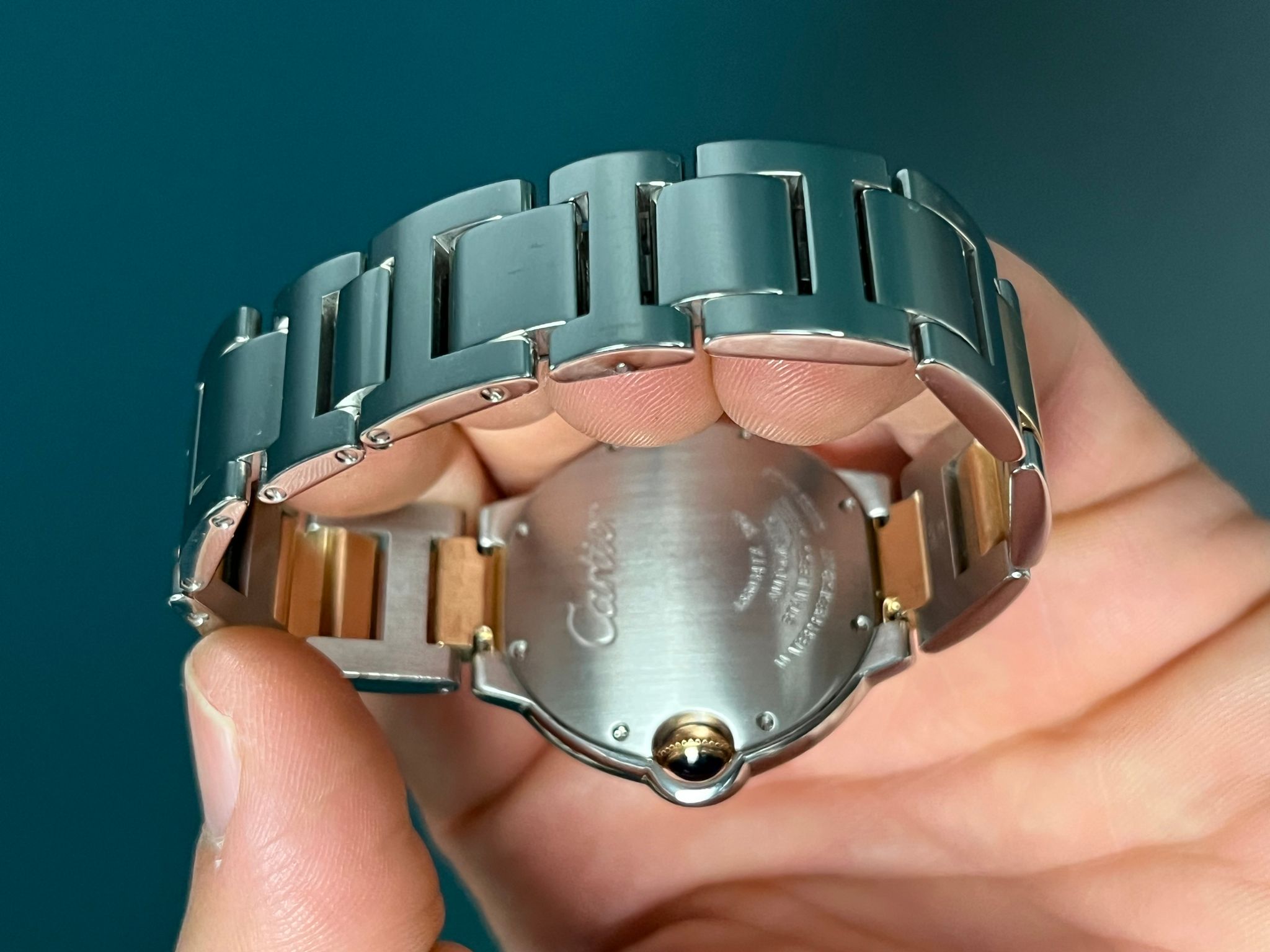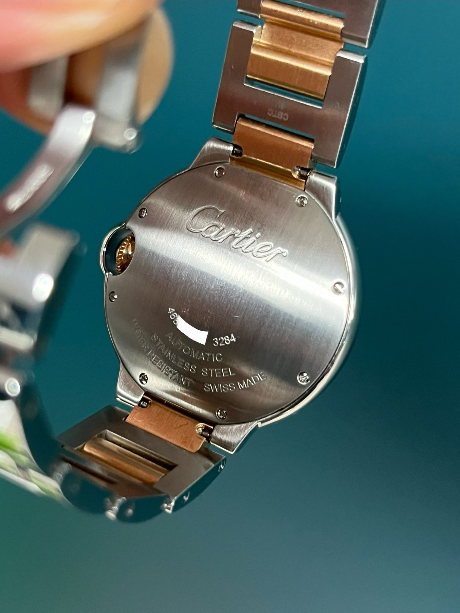 The Cartier Ballon Bleu Reference 3284 (WE902031) is a stunning fusion of elegance and contemporary craftsmanship. This exquisite timepiece showcases a luxurious two-tone design, combining 18k rose gold and stainless steel for a refined aesthetic. The signature rounded case, is accentuated by Cartier’s signature fluted crown set with a blue cabochon spinel. What truly sets this model apart is its factory diamond dial, which elevates the watch’s sophistication with brilliant-cut diamonds serving as hour markers on the silvered guilloché dial. Blued steel hands glide effortlessly over the dial, enhancing its timeless allure. Powered by a precise automatic movement, this watch is as reliable as it is stylish. Perfect for those who appreciate classic Cartier charm with a touch of luxury, the Ballon Bleu 3284 is an exquisite statement piece. The bracelet on this example has a total of 8 large and 2 small links and shows no stretch.