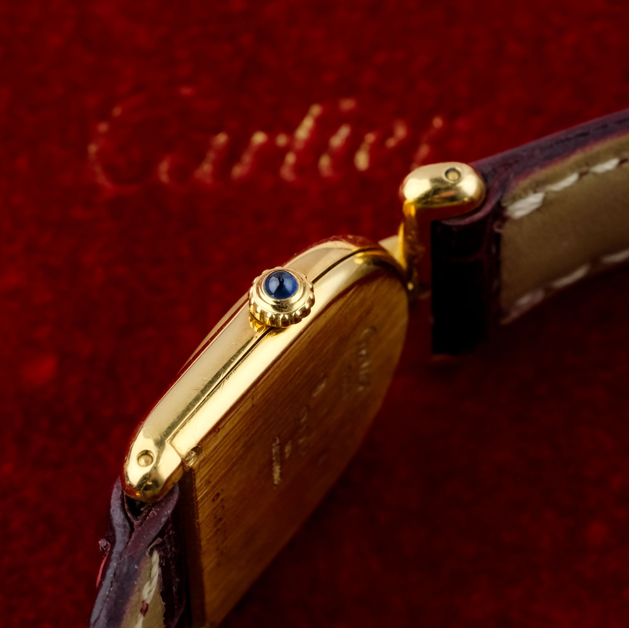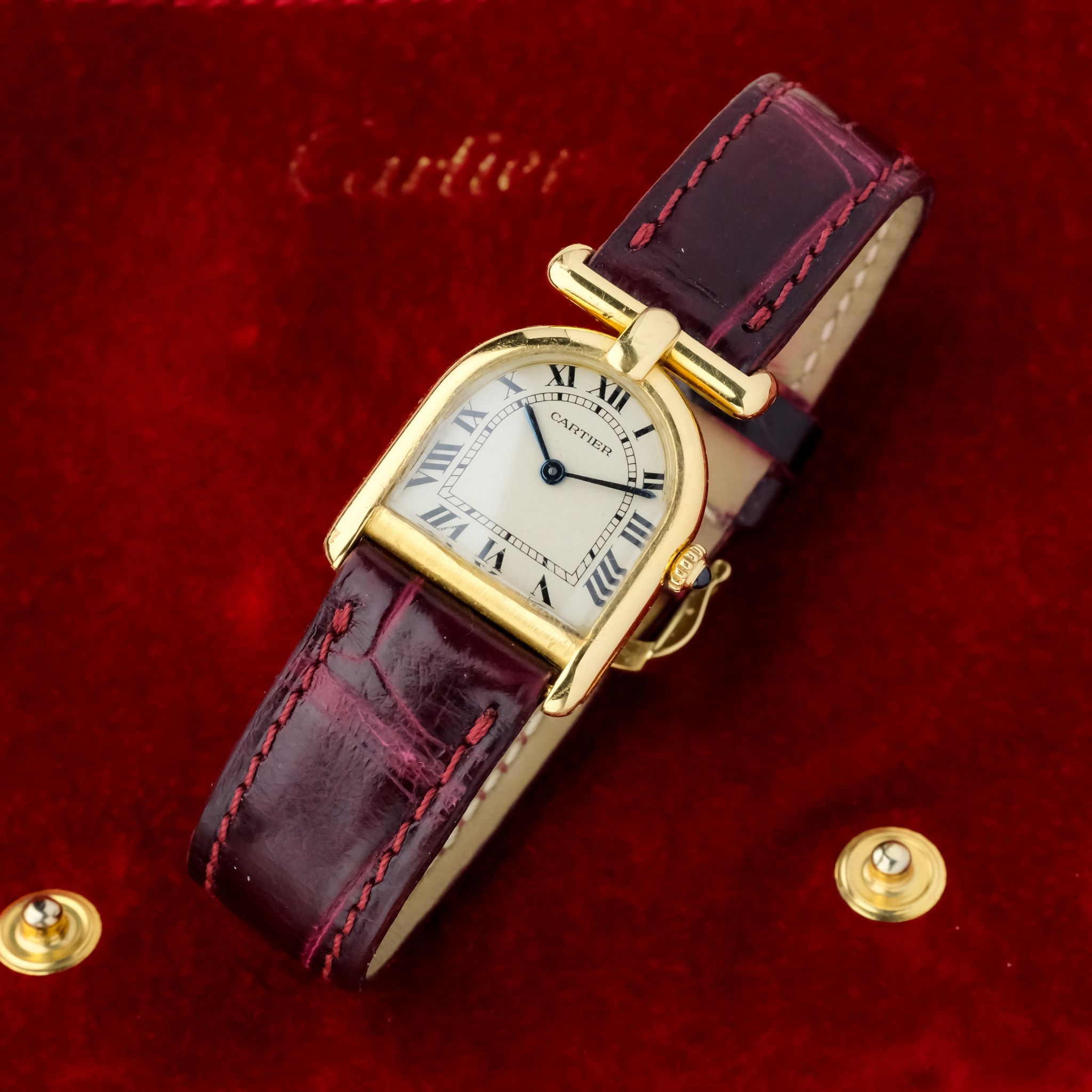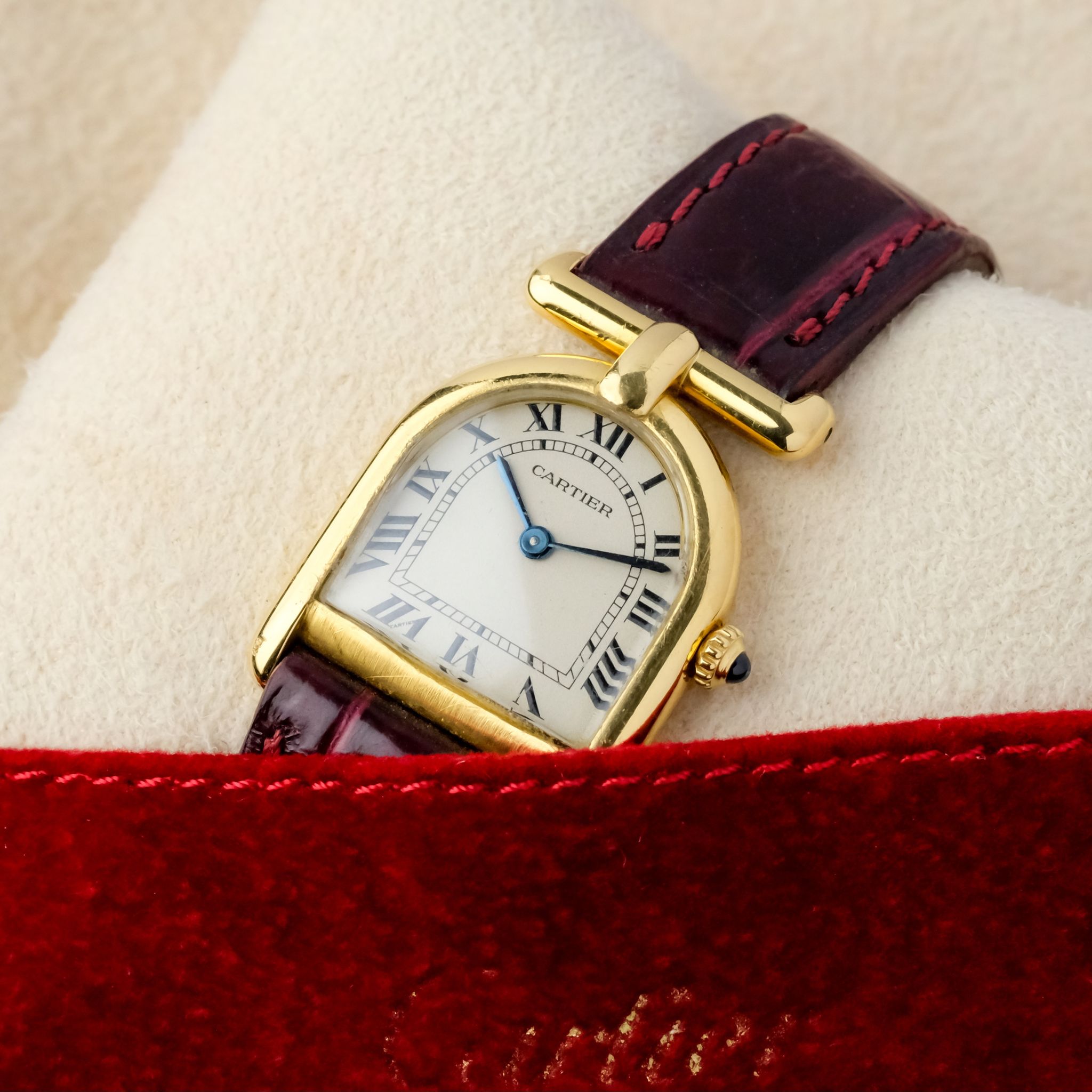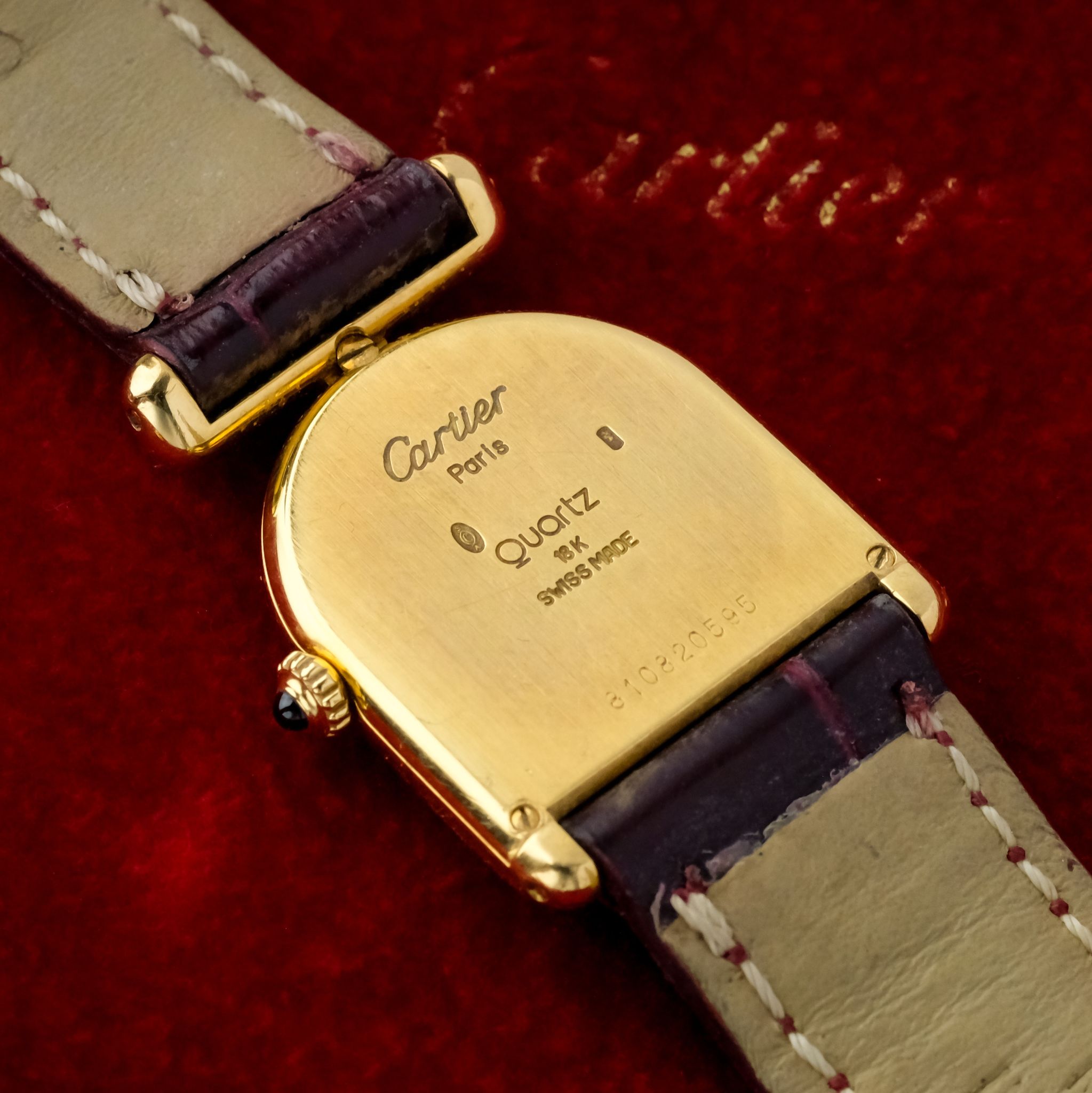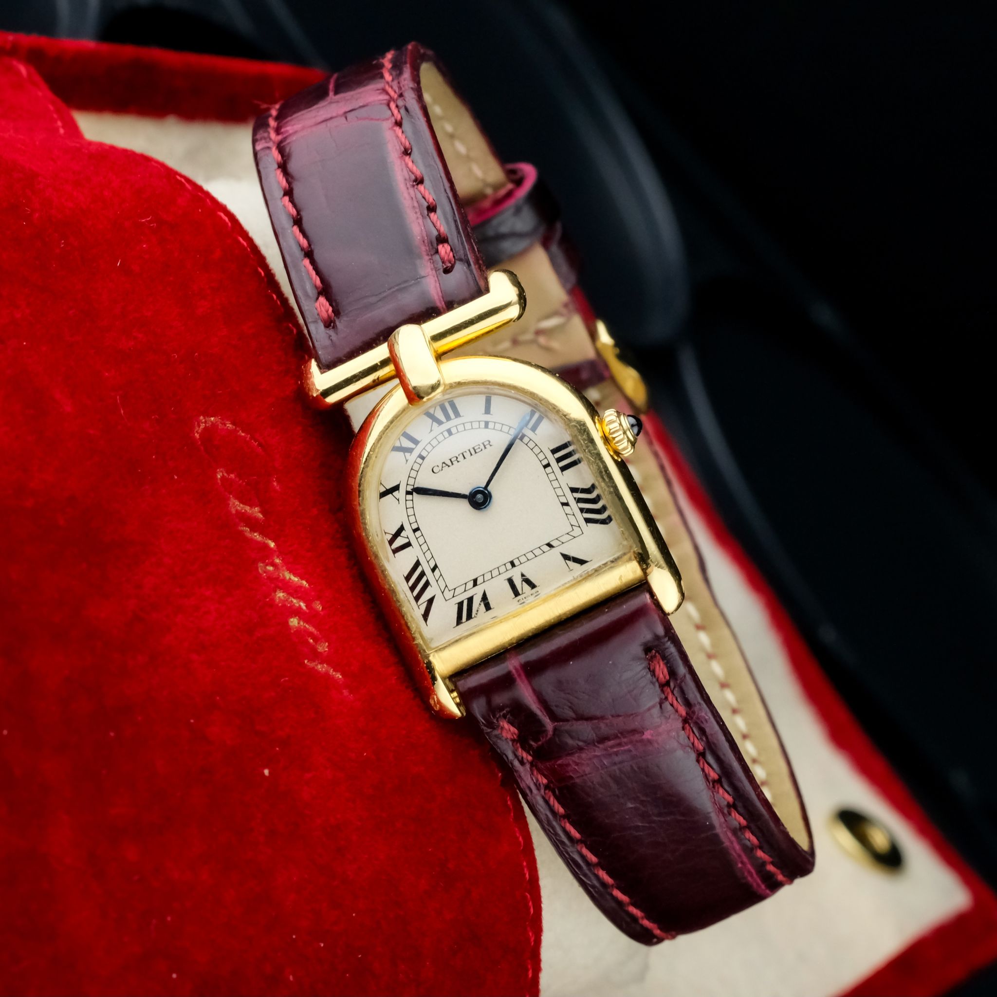 This Cartier Calandre Romane GM is a rare and elegant piece from Cartier’s more unconventional design era, featuring a sculpted 18k yellow gold case with softly rounded edges and Roman numerals set on a square inner dial. Powered by the Cartier 81 quartz movement, it offers reliable and low-maintenance timekeeping in a refined and distinctive form. The case measures 23 x 31 mm, with a stepped lug design that accommodates both 16 mm and 18 mm strap widths. Fitted with a Cartier yellow gold tang buckle and in good overall condition, this Calandre Romane stands out as a unique alternative to the more common Tank and Santos models. It is perfect for collectors looking for something rare, refined and unmistakably Cartier.