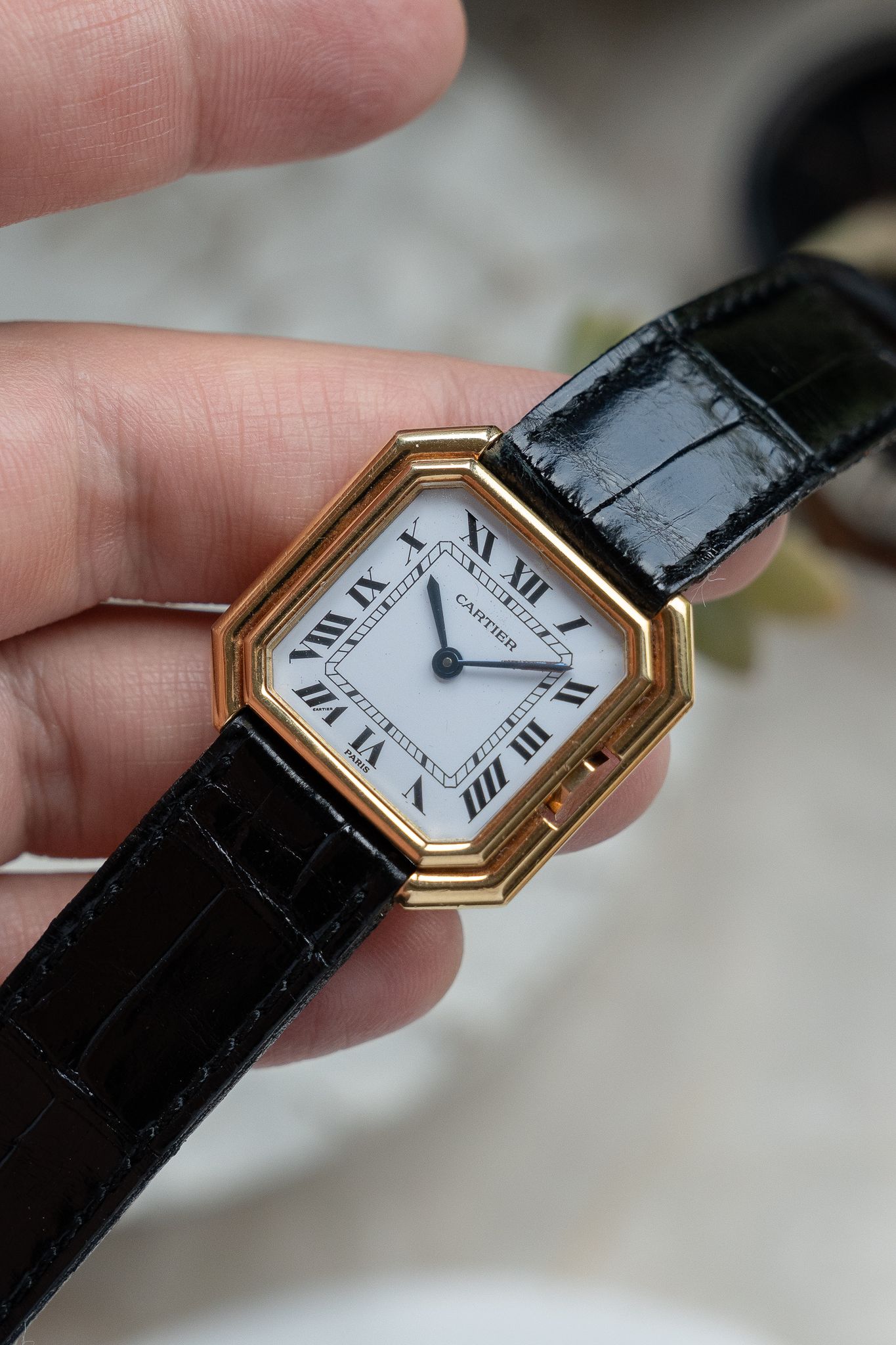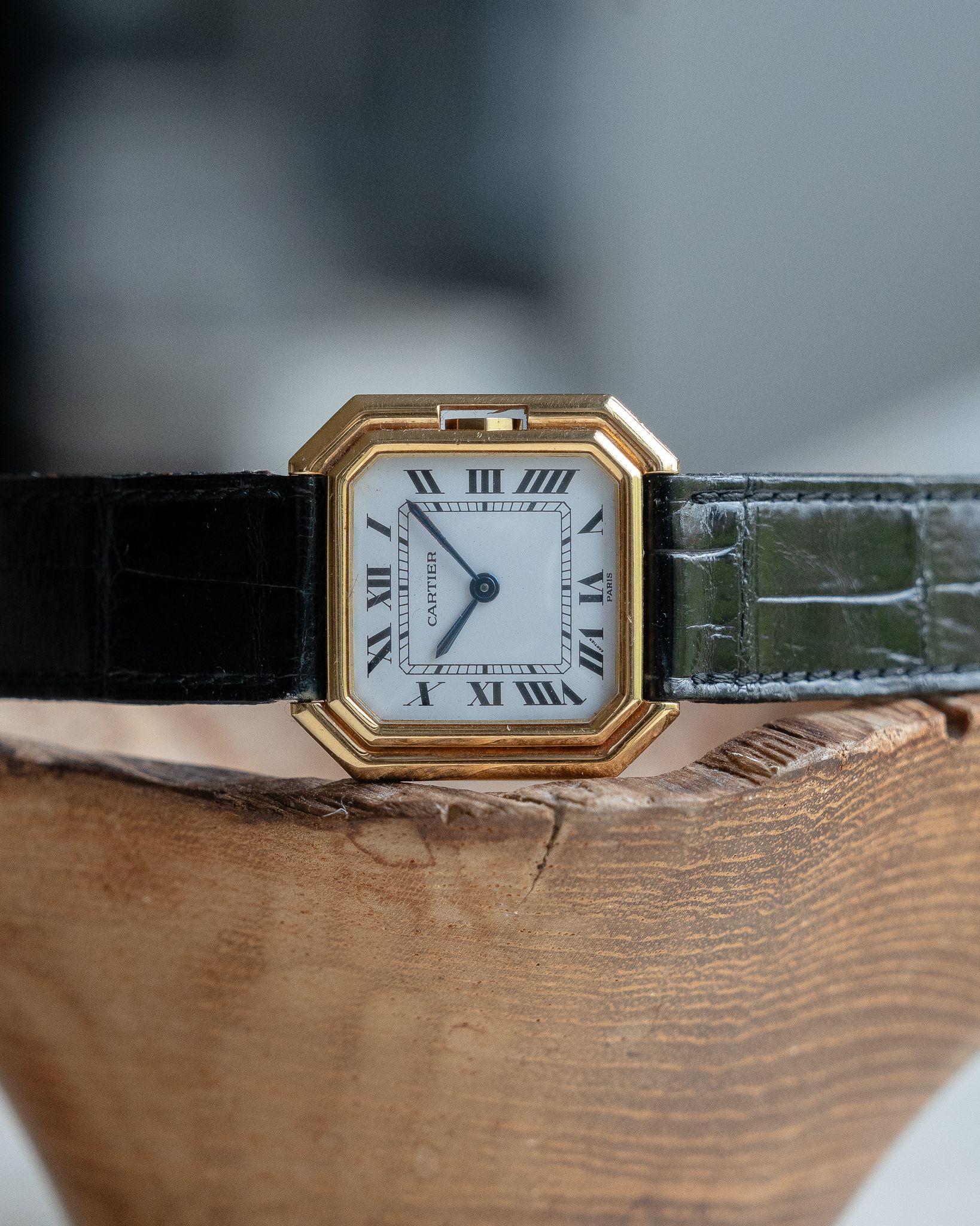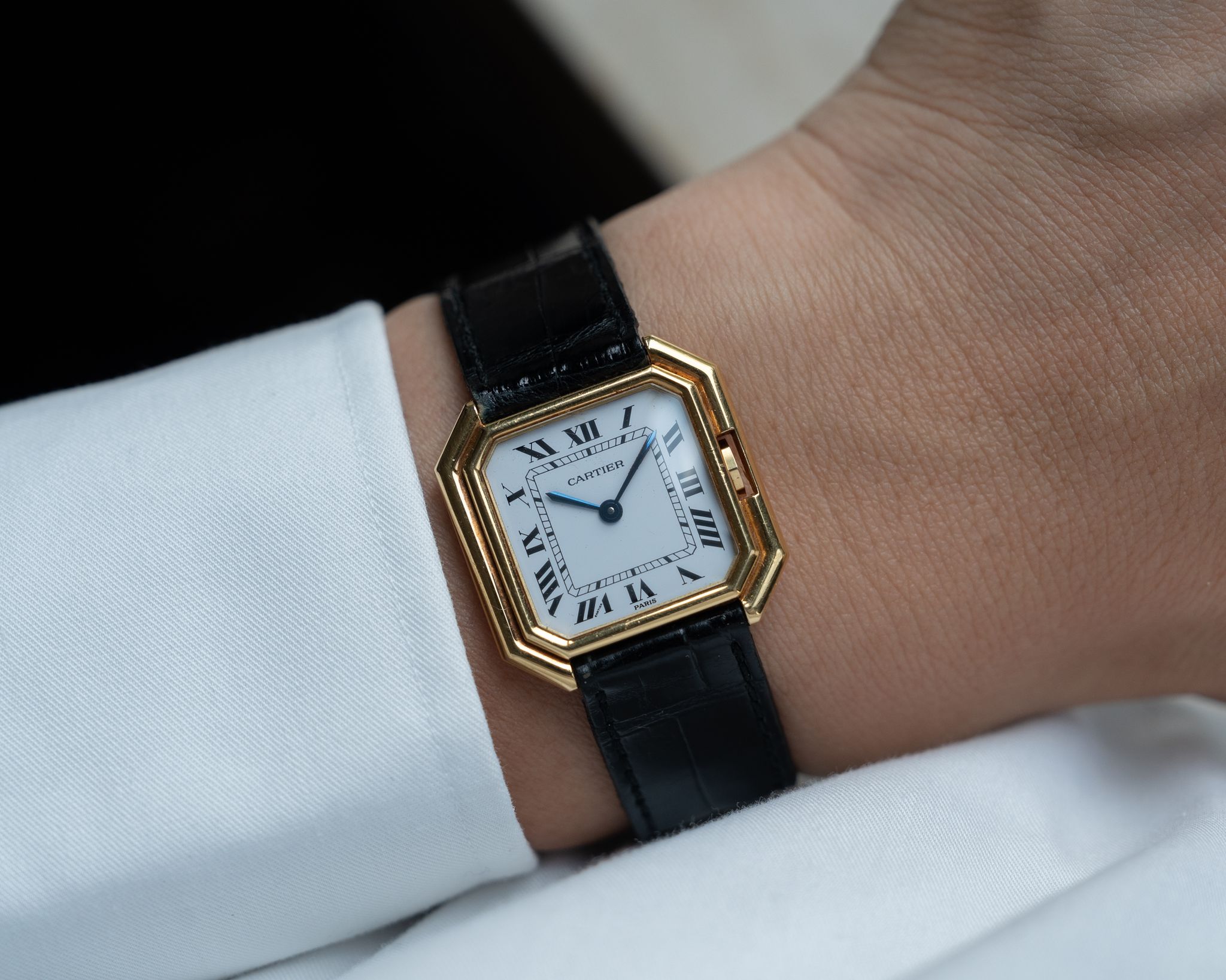 The Ceinture was originally introduced by Cartier in 1927. Over 50 years later, during the early 1970's, Cartier reintroduced the Ceinture as one of 12 special "shaped" watches that formed part of the “Louis Cartier Collection”. This 12 shape Tank collection included familiar models such as the Ellipse, Cristallor, Gondollo, and Stepped Tank. The word Ceinture in French translates to "belt", and the watch was named as such given its resemblance to the buckle of a belt. Made of 18k yellow gold, the octagonal case has a beautiful double stepped bezel and the manual wind 78-1 caliber can be wound by a flat octagonal crown. The present example here is the Ceinture in LM (large) size which was produced for men's. At 27mm x 27.5mm and 6.6mm thick, for Cartier purists, the LM size Ceinture is the preferred size compared to the ladies SM size or the XL Jumbo size which was powered by an automatic movement. The Ceinture stands as a perfect example of why Cartier is often referred to as the "master of shapes". The maison's astonishing talent lies in crafting refreshingly unique designs that defy the traditional norms of their era, leaving us truly amazed.