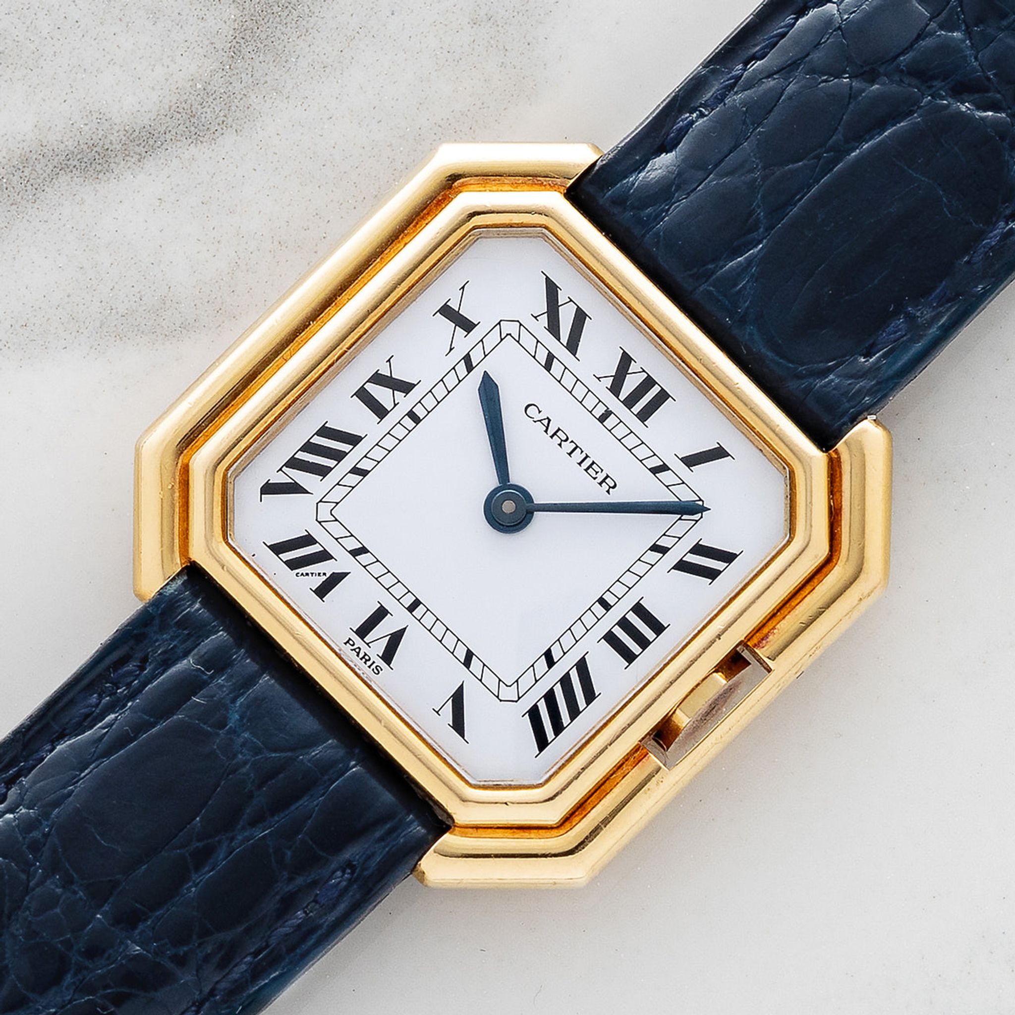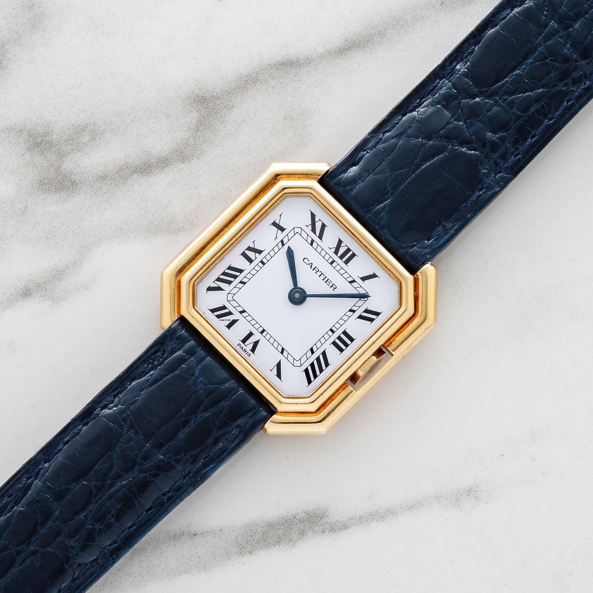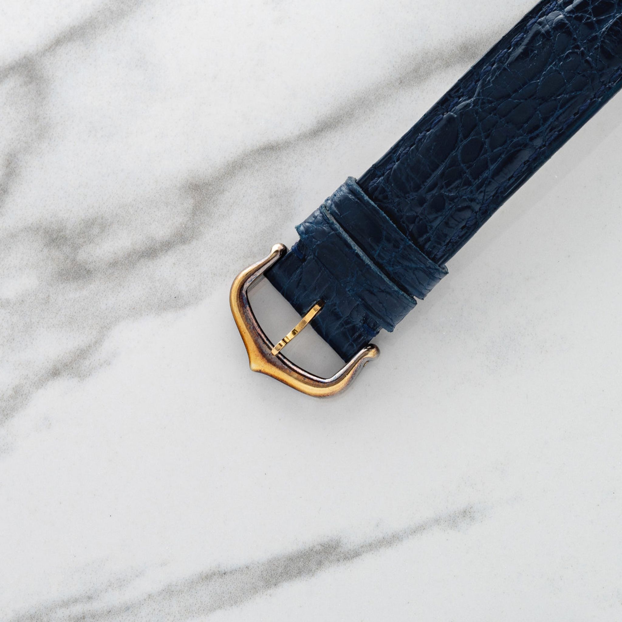 Case: Appears unpolished. Excellent preservation with deep and crisp hallmarks. Light signs of use overall. Correct crown. Bracelet: Two piece Cartier strap in blue gator with Cartier gold plaque pin buckle.