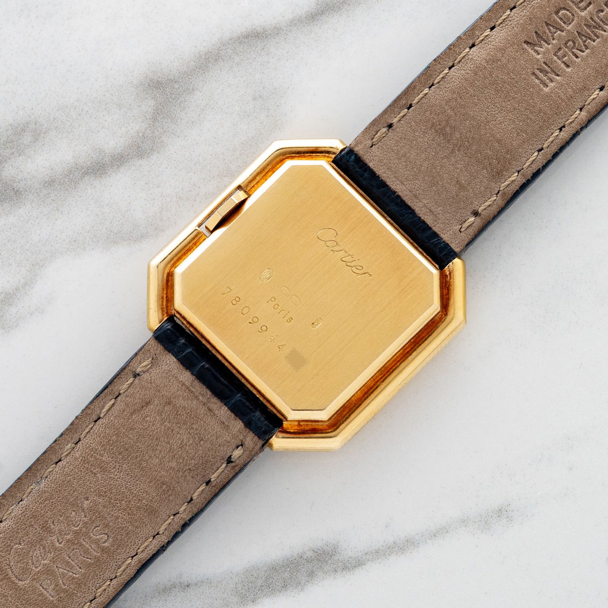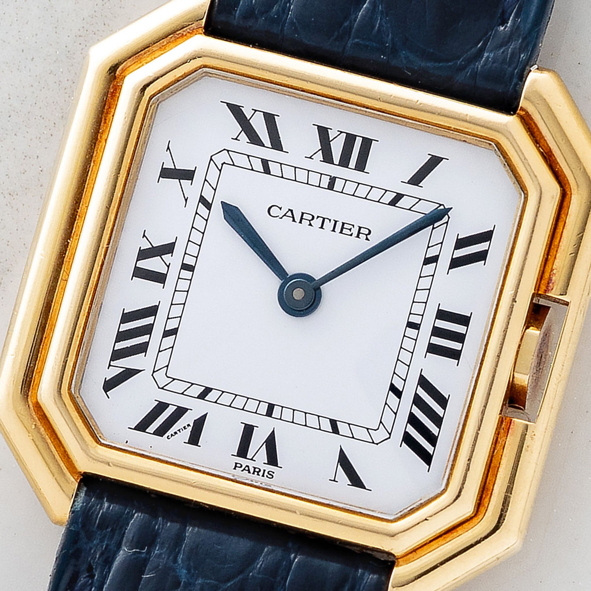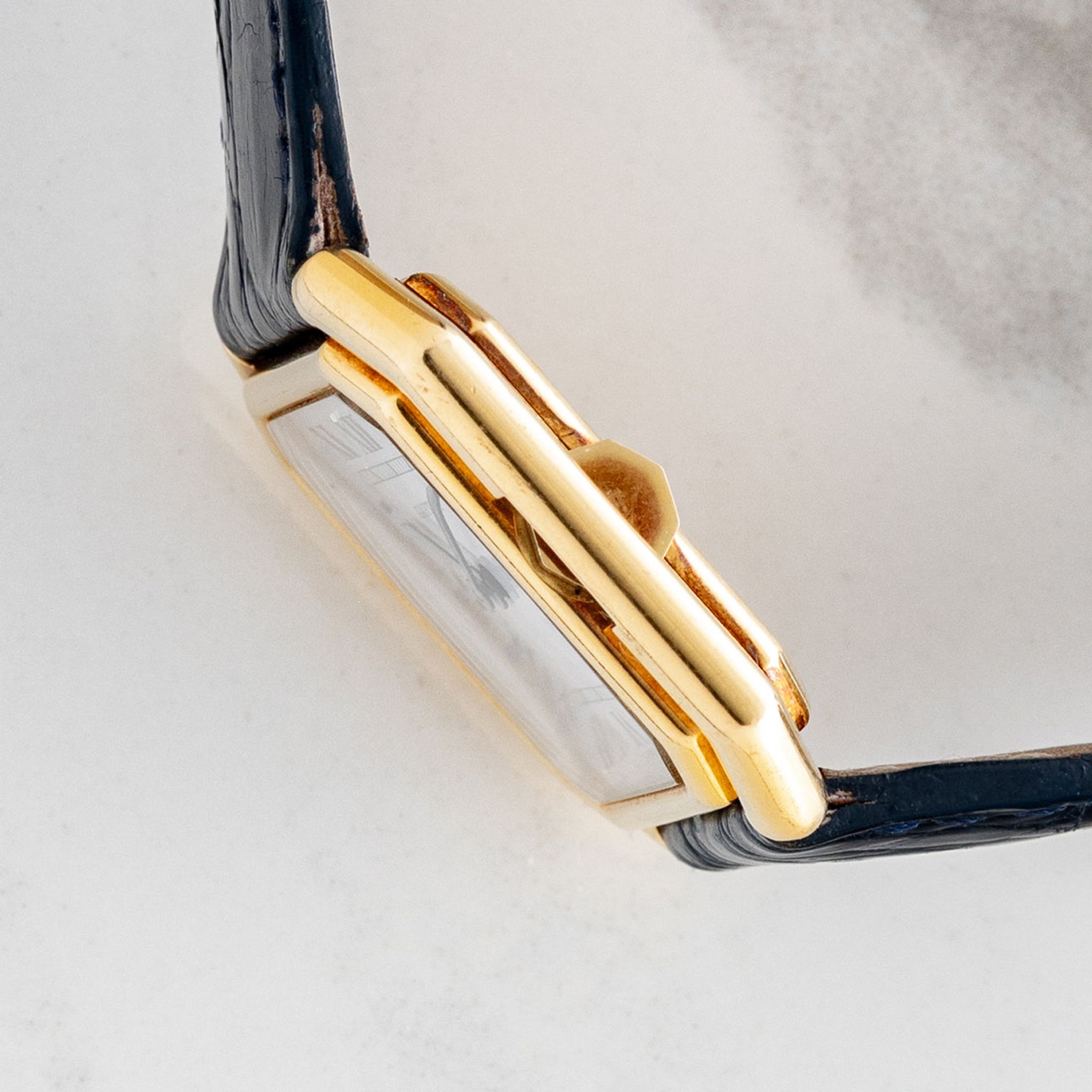 Case: Appears unpolished. Excellent preservation with deep and crisp hallmarks. Light signs of use overall. Correct crown. Bracelet: Two piece Cartier strap in blue gator with Cartier gold plaque pin buckle.
