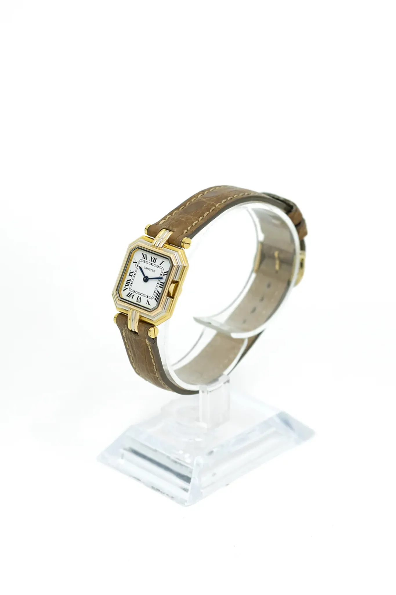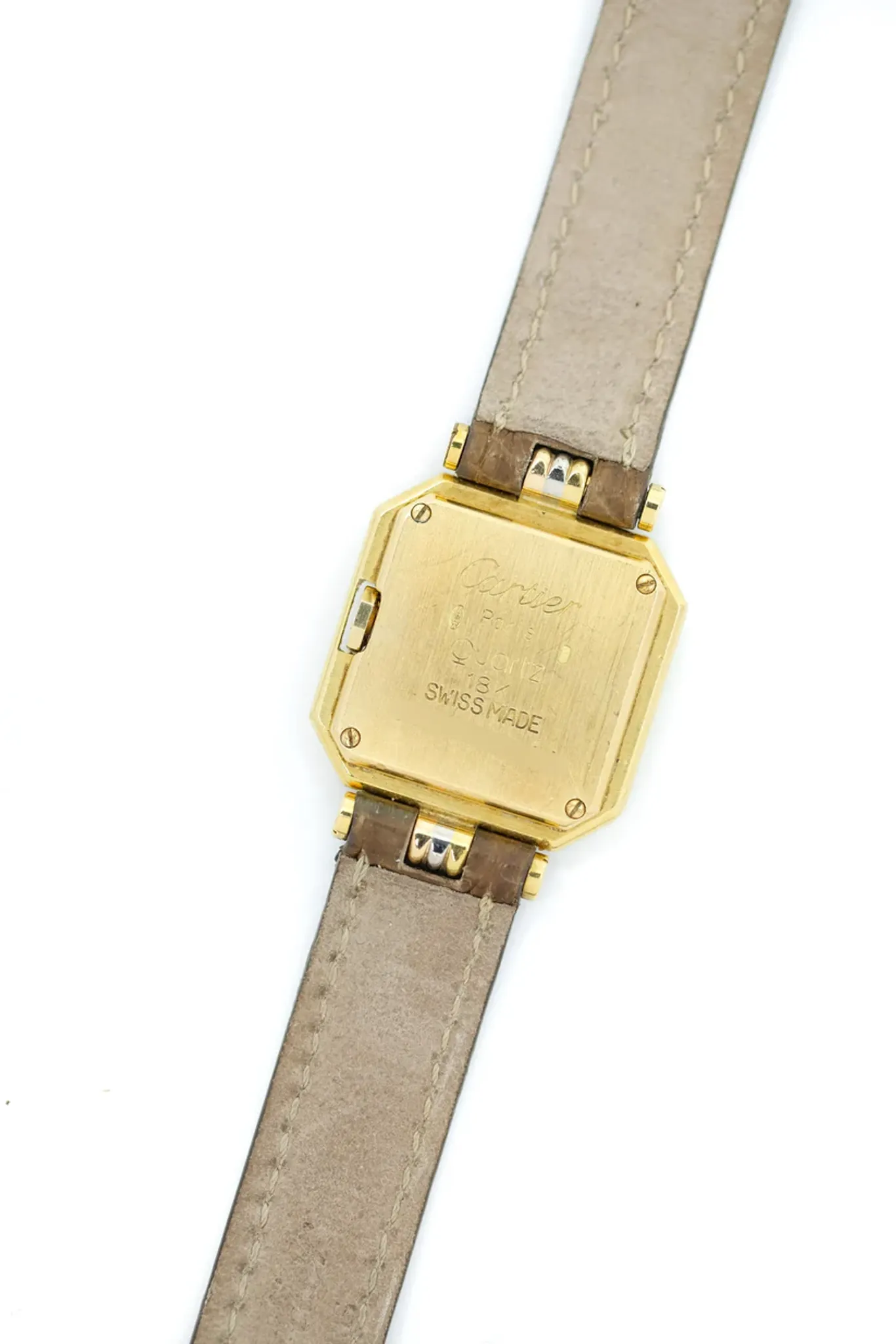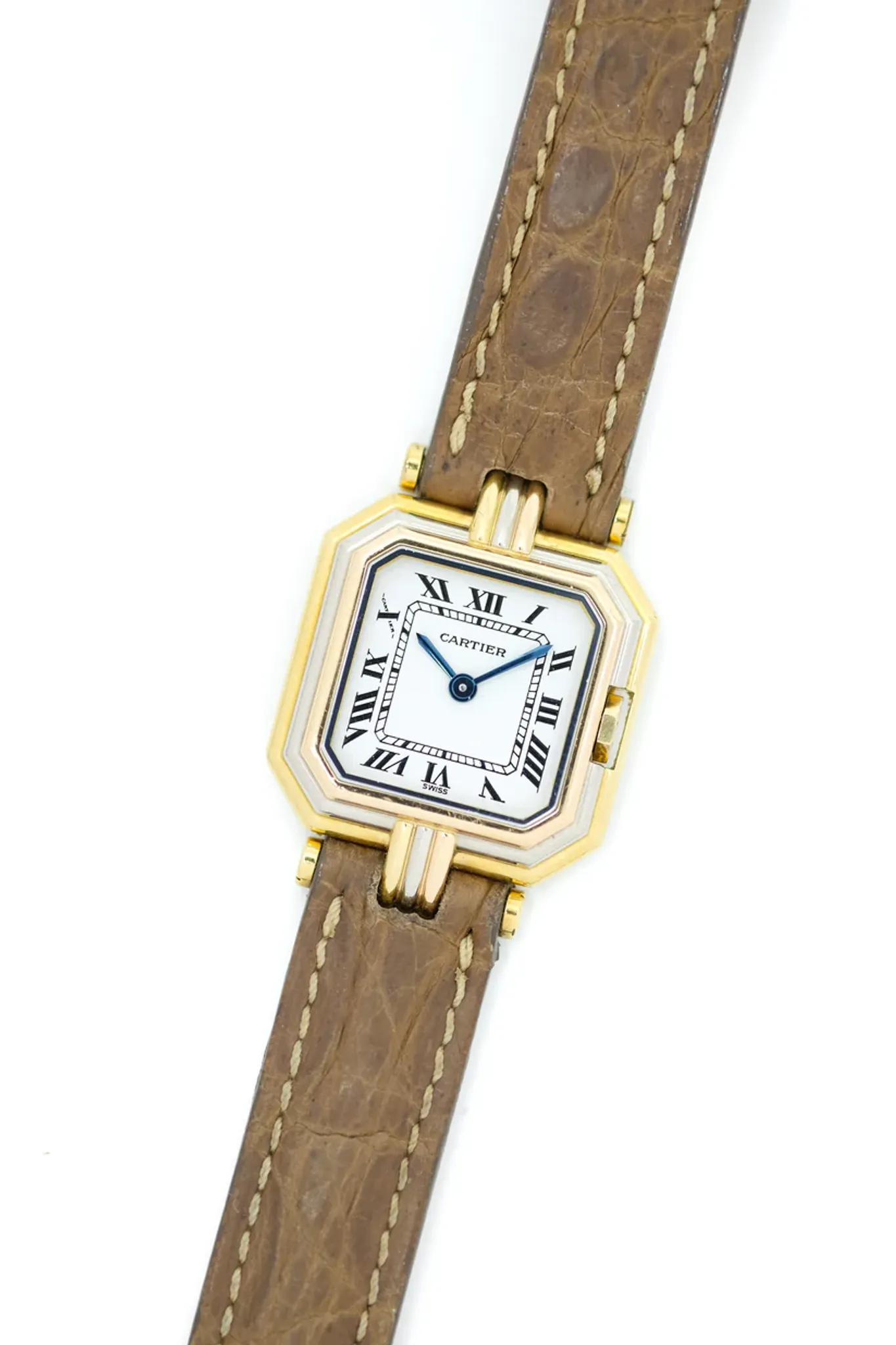 18K yellow, pink and white gold case. Cartier brown alligator leather strap. Cartier gold-plated pin buckle (worn on the reverse).