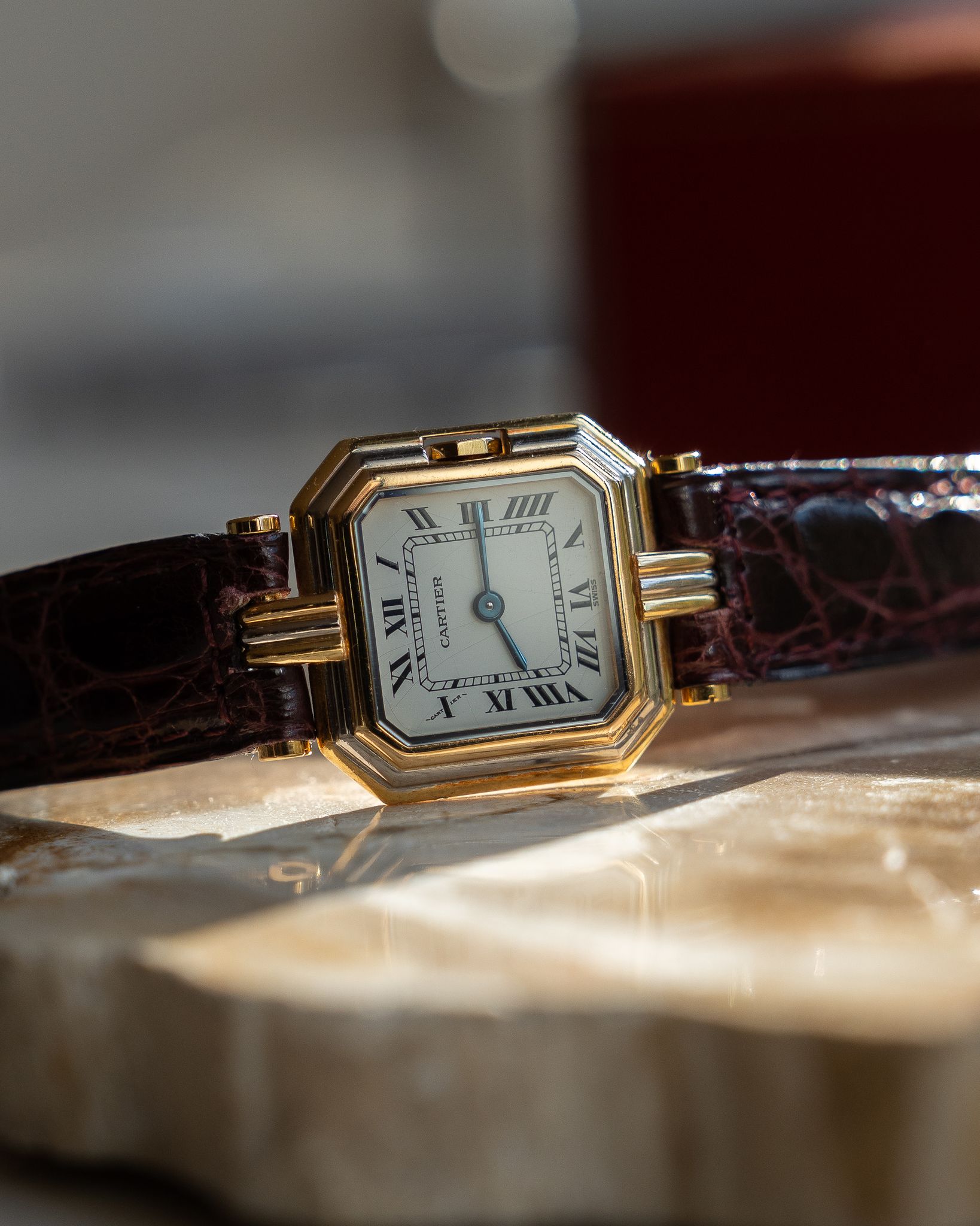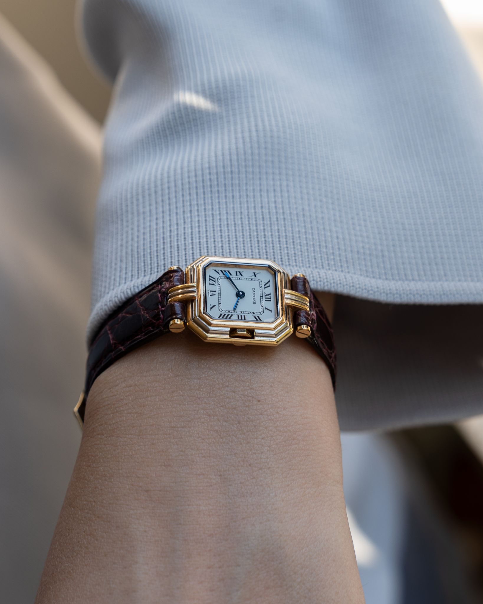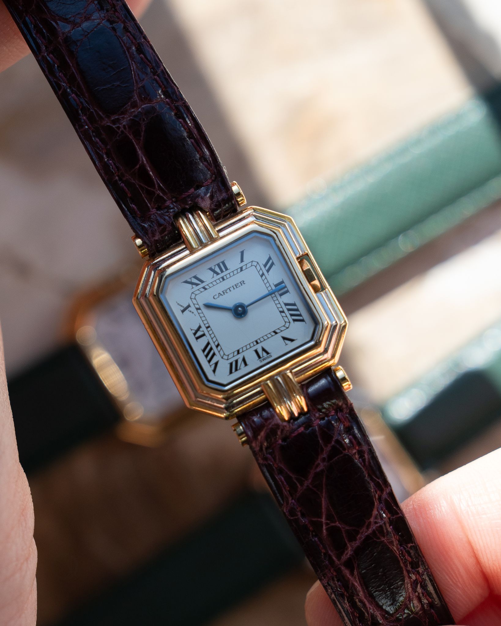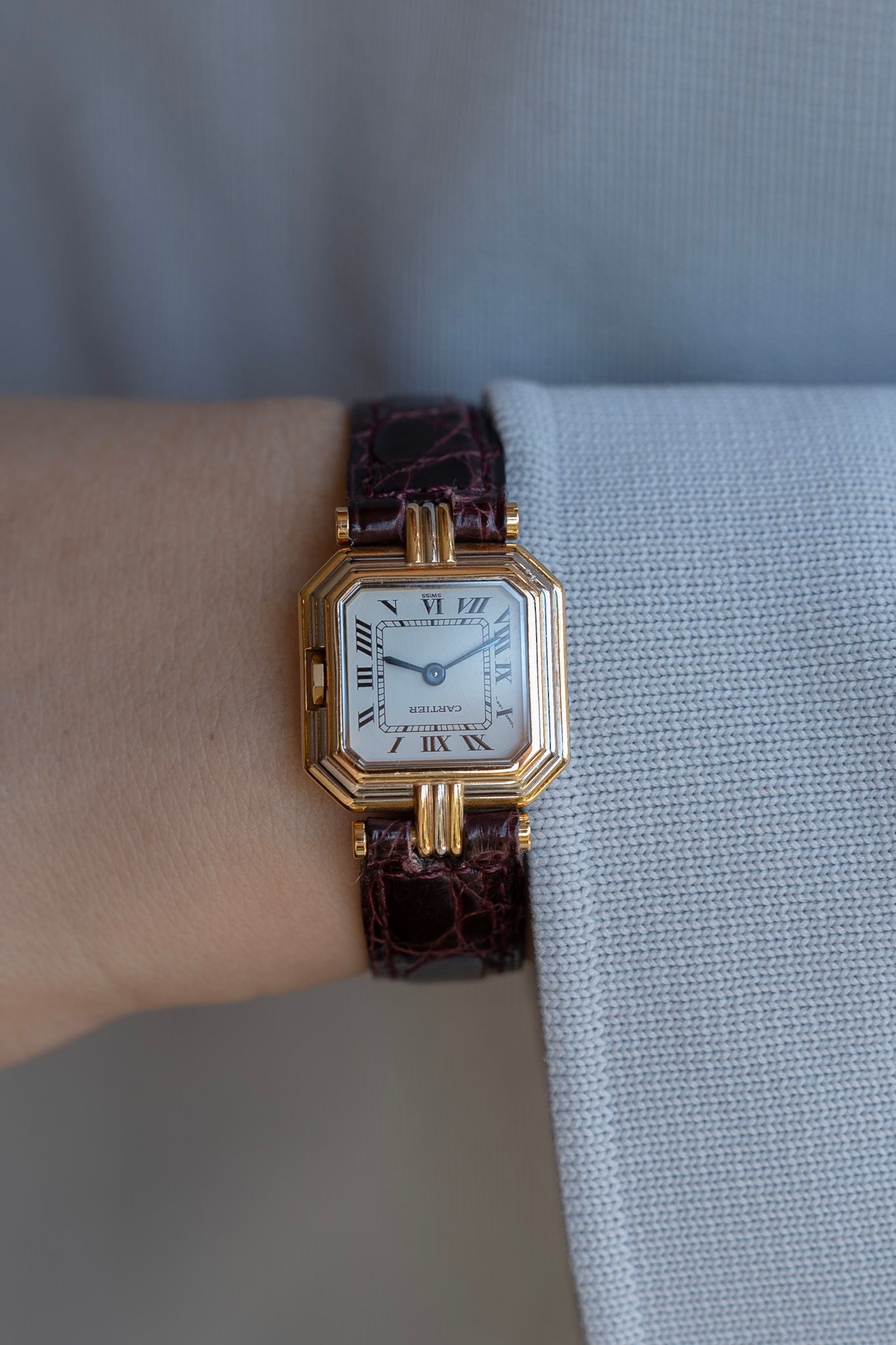 The Ceinture was originally introduced by Cartier in 1927. Over 50 years later, during the early 1970's, Cartier reintroduced the Ceinture as one of 12 special "shaped" watches that formed part of the “Louis Cartier Collection”. The word Ceinture in French translates to "belt", and the watch was named as such given its resemblance to the buckle of a belt. The Ceinture in the 70's was produced either in white gold, yellow gold, or a combination of white gold and yellow gold. However, in the 80's, Cartier introduced additional Ceinture variants powered by a quartz movement. One of these variants was the Ceinture Trinity which used a combination of yellow, white, and rose gold for each of its triple stepped octagonal case. The Trinity Ceinture produced for women's, came in the SM size with a hidden ribbed lug design. The Ceinture stands as a perfect example of why Cartier is often referred to as the "master of shapes". The maison's astonishing talent lies in crafting refreshingly unique designs that defy the traditional norms of their era, leaving us truly amazed.