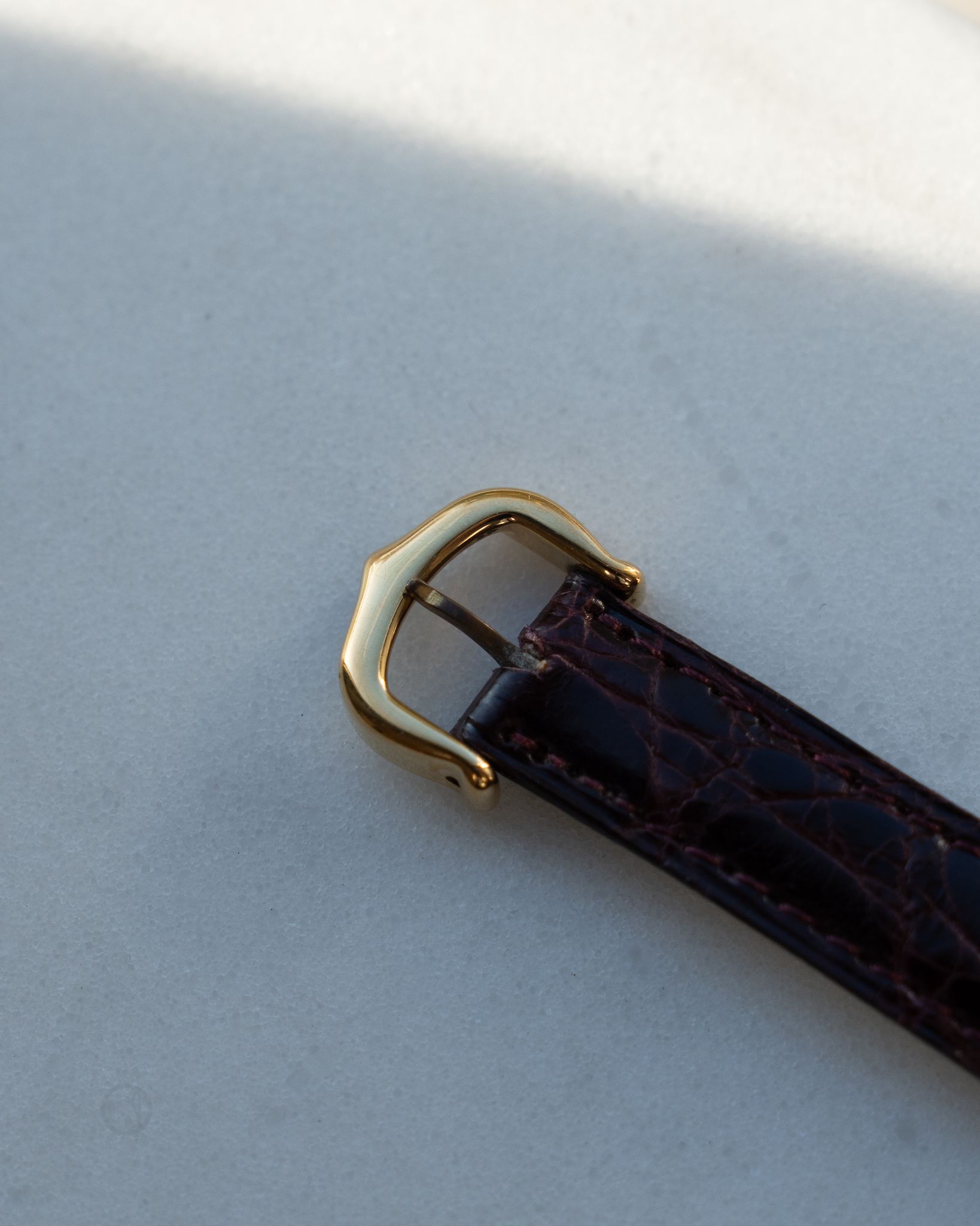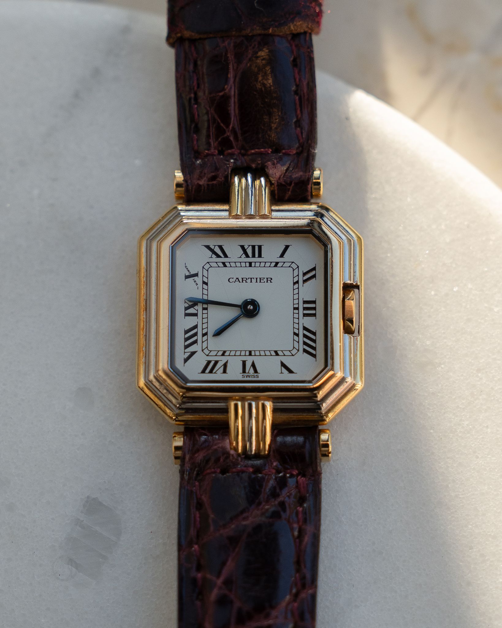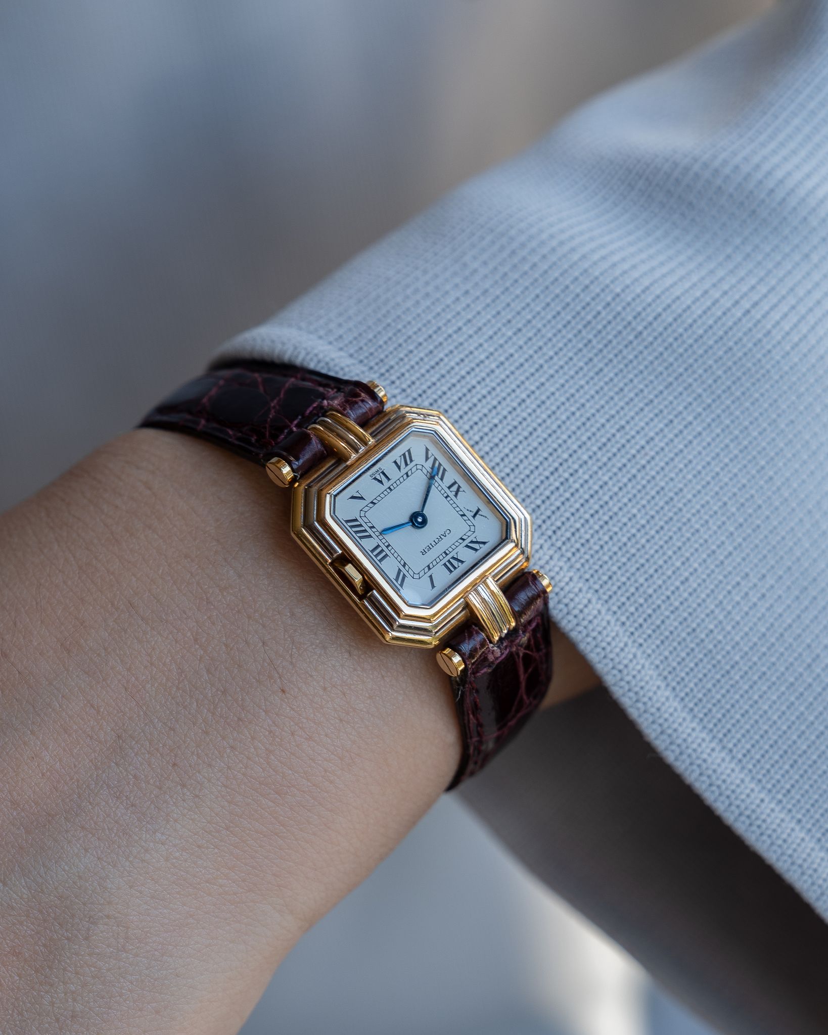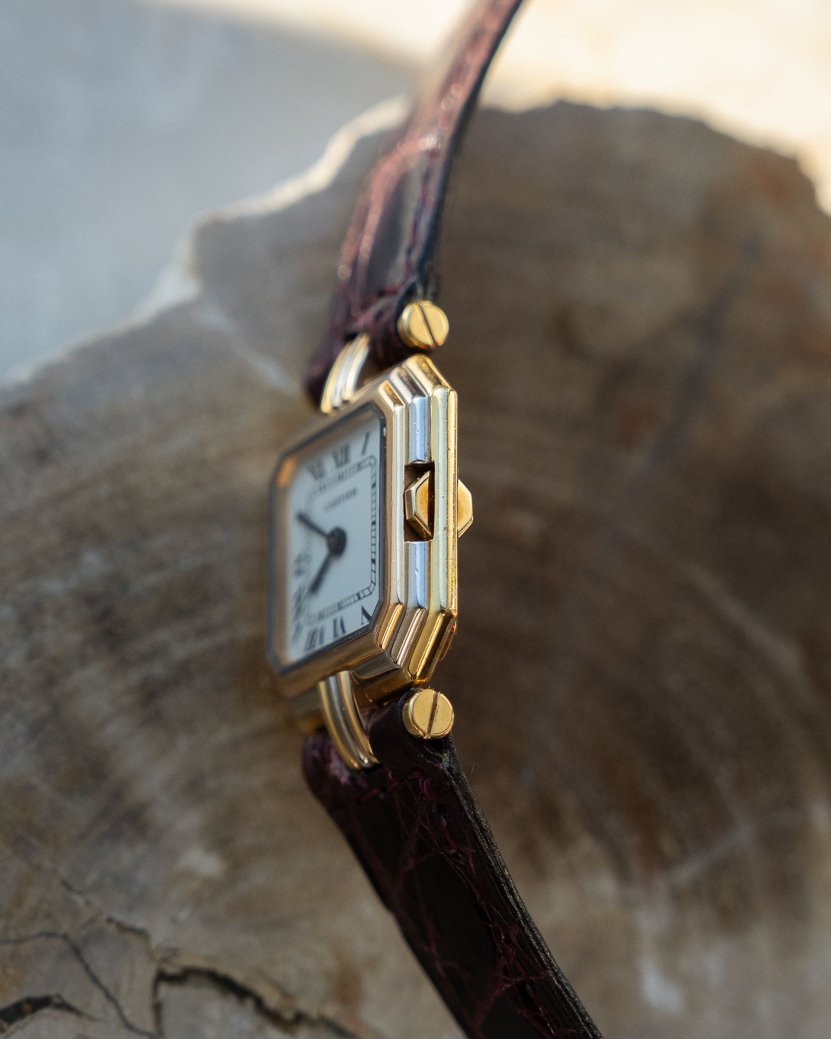 The Ceinture was originally introduced by Cartier in 1927. Over 50 years later, during the early 1970's, Cartier reintroduced the Ceinture as one of 12 special "shaped" watches that formed part of the “Louis Cartier Collection”. The word Ceinture in French translates to "belt", and the watch was named as such given its resemblance to the buckle of a belt. The Ceinture in the 70's was produced either in white gold, yellow gold, or a combination of white gold and yellow gold. However, in the 80's, Cartier introduced additional Ceinture variants powered by a quartz movement. One of these variants was the Ceinture Trinity which used a combination of yellow, white, and rose gold for each of its triple stepped octagonal case. The Trinity Ceinture produced for women's, came in the SM size with a hidden ribbed lug design. The Ceinture stands as a perfect example of why Cartier is often referred to as the "master of shapes". The maison's astonishing talent lies in crafting refreshingly unique designs that defy the traditional norms of their era, leaving us truly amazed.