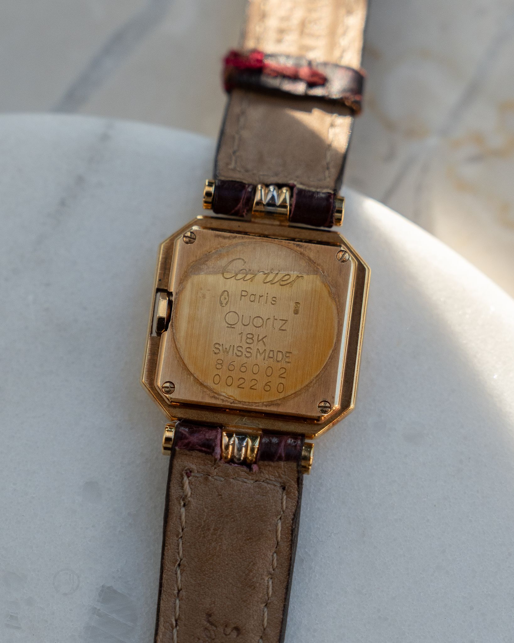 Bracelet/Strap: original Cartier leather strap (worn condition). Comes also with Cartier gold plated tang buckle