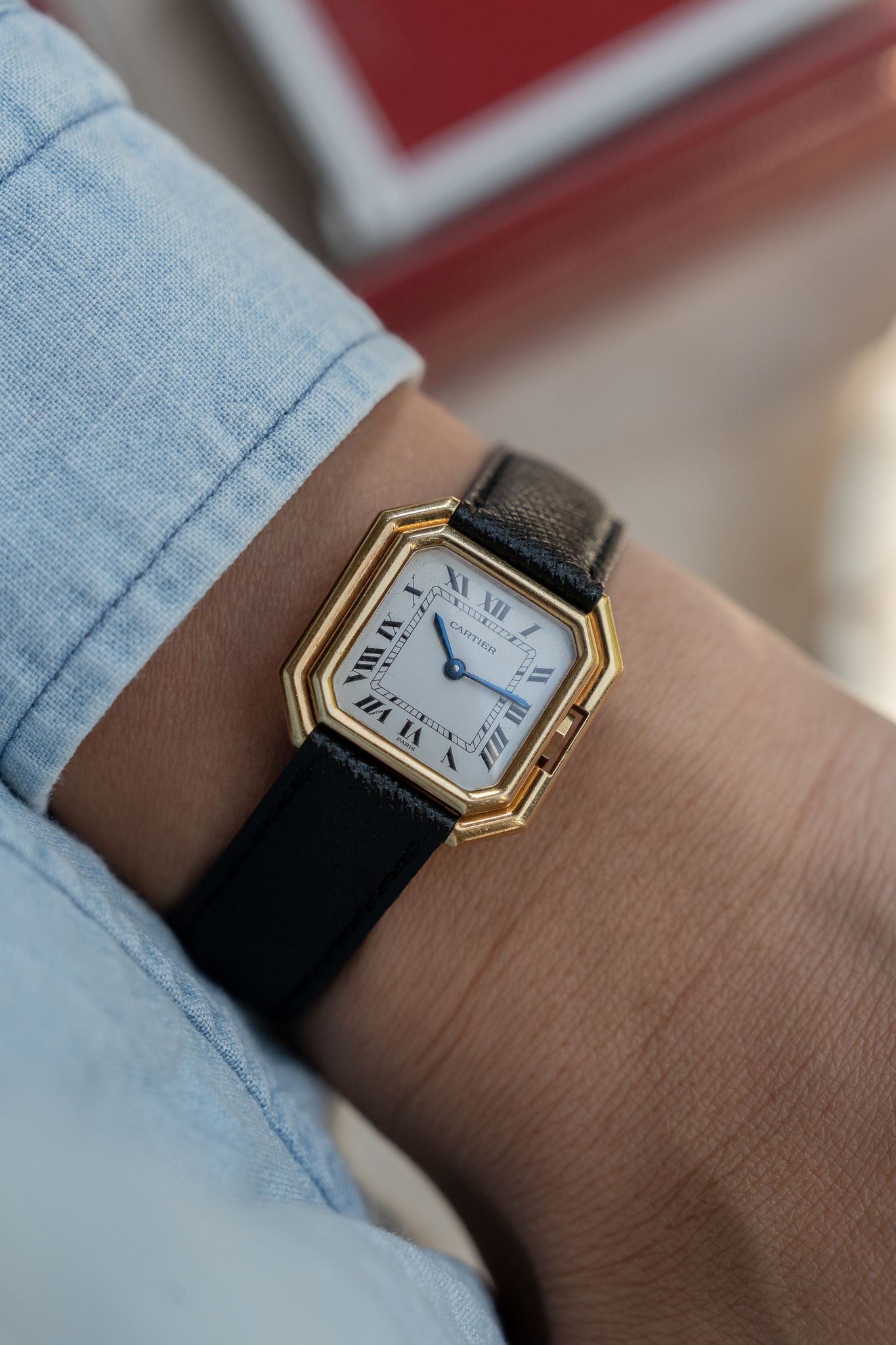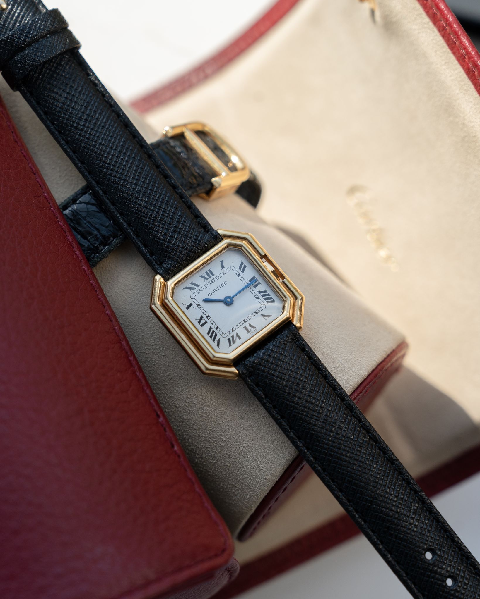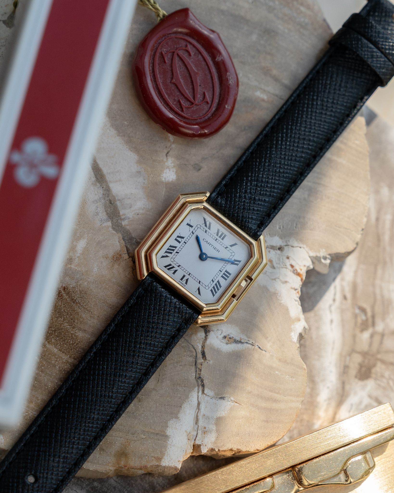 The Ceinture was originally introduced by Cartier in 1927. Over 50 years later, during the early 1970's, Cartier reintroduced the Ceinture as one of 12 special "shaped" watches that formed part of the “Louis Cartier Collection”. This 12 shape collection included familiar models such as the Ellipse, Cristallor, Gondollo, and Stepped Tank. The word Ceinture in French translates to "belt", and the watch was named as such given its resemblance to the buckle of a belt. The Ceinture in this era was produced either in white gold, yellow gold, or a combination of white gold and yellow gold. The octagonal case has a beautiful double stepped bezel and the manual wind 78-1 caliber can be wound by a flat octagonal crown. The present example here is the Ceinture in the SM size which was produced for women's. At 24.5mm x 25mm and 6.6mm thick, the case on this Ceinture is made of yellow gold. The Ceinture stands as a perfect example of why Cartier is often referred to as the "master of shapes". The maison's astonishing talent lies in crafting refreshingly unique designs that defy the traditional norms of their era, leaving us truly amazed.