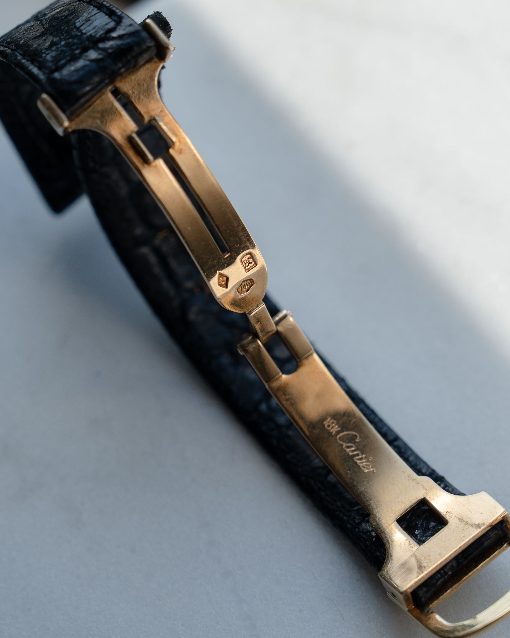 Bracelet/Strap: original 18k yellow gold Cartier deployant buckle, generic epsom black leather strap.