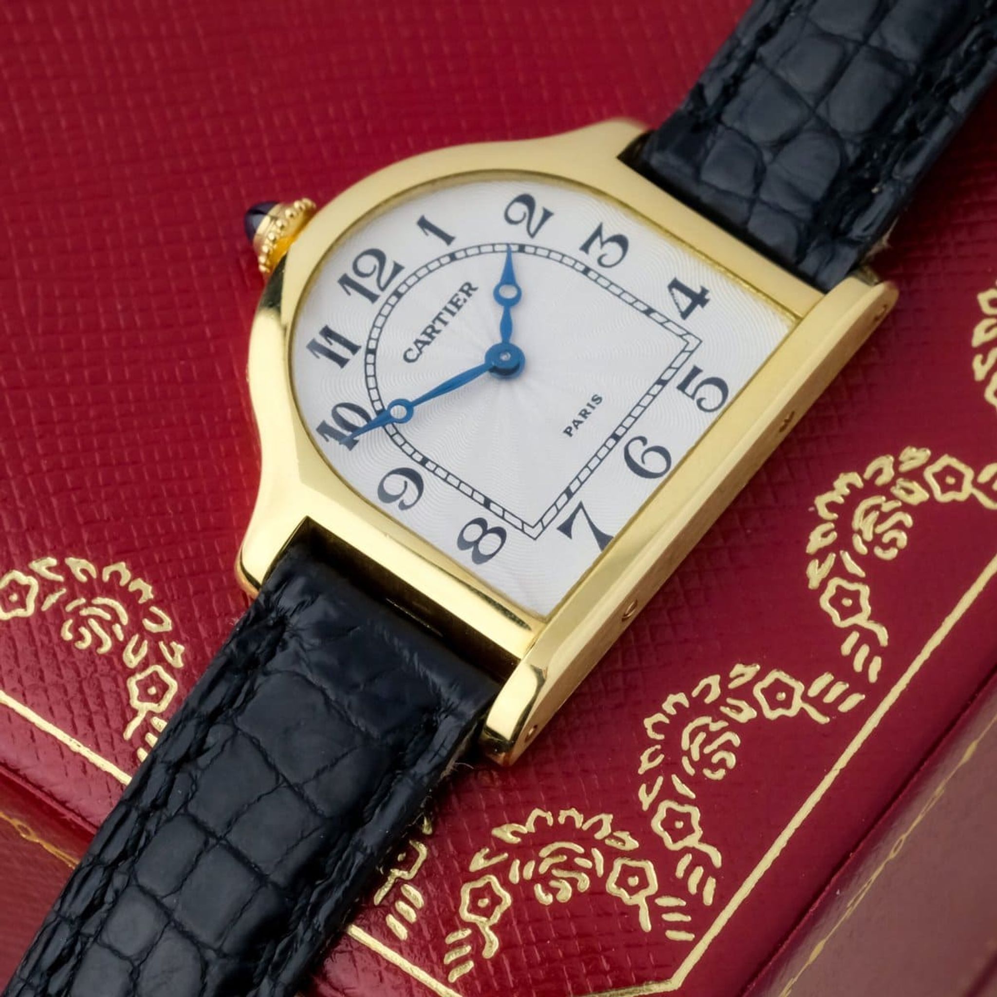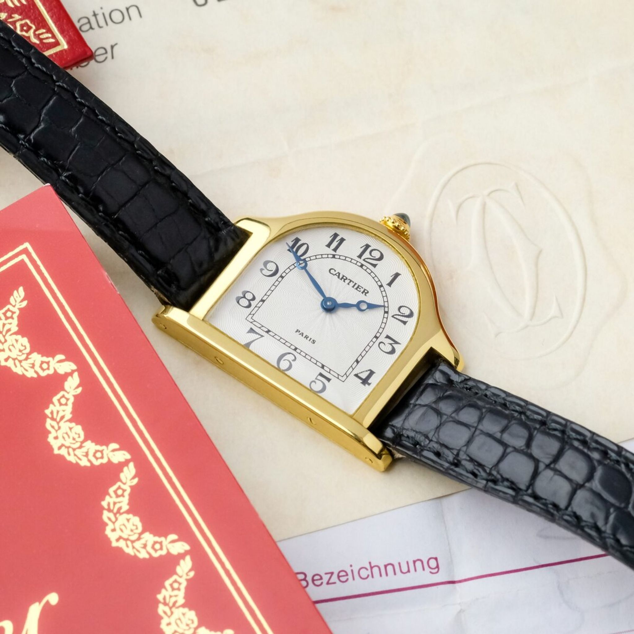 This example is preserved in very good overall condition with only the most minimal signs of wear. The case remains sharp and beautifully finished, accompanied by its original box, papers, Cartier service documentation and import receipts. The Cloche de Cartier reference 8876 stands as one of the most distinctive and collectible expressions of Cartier’s creative watchmaking heritage, combining rarity, design ingenuity and impeccable provenance.
