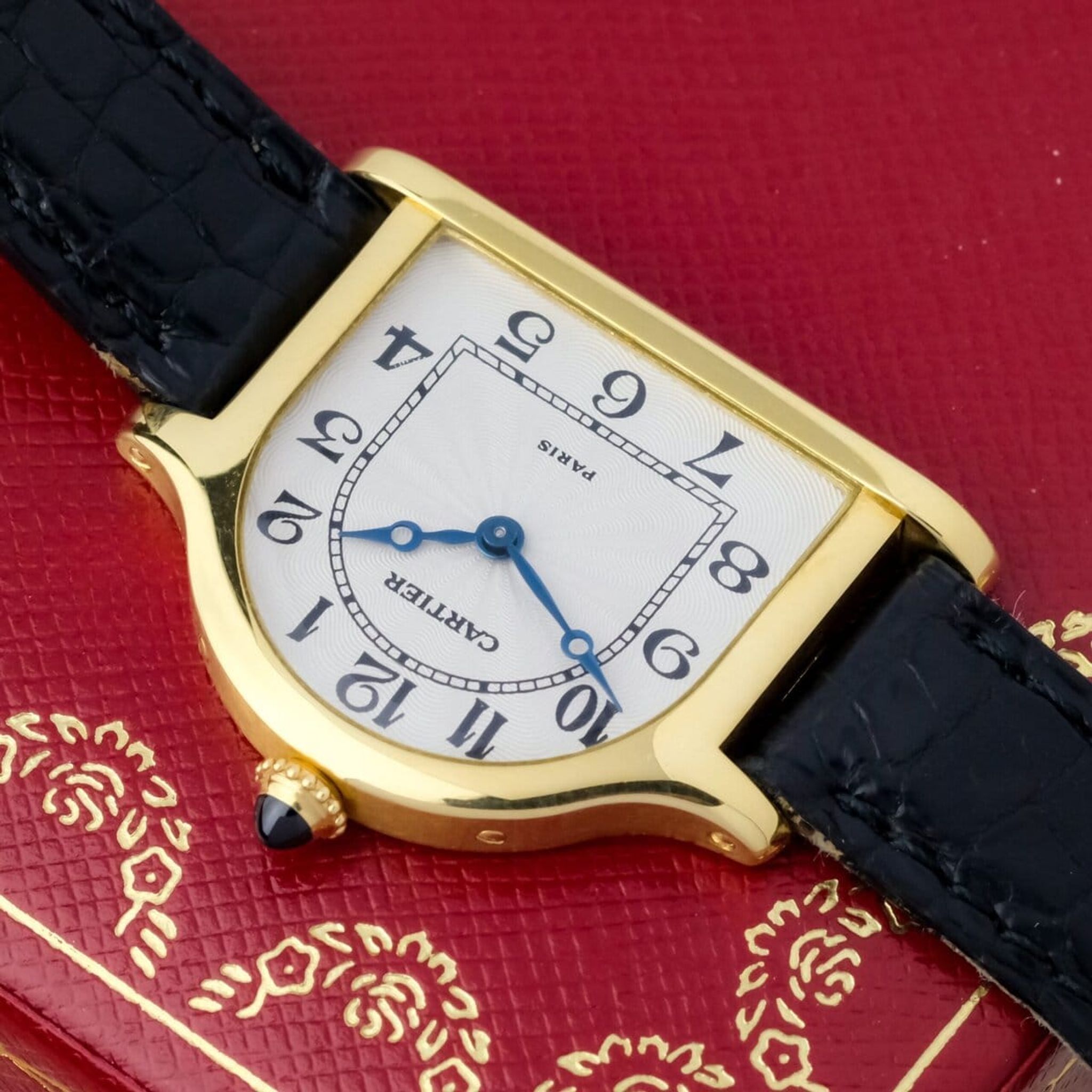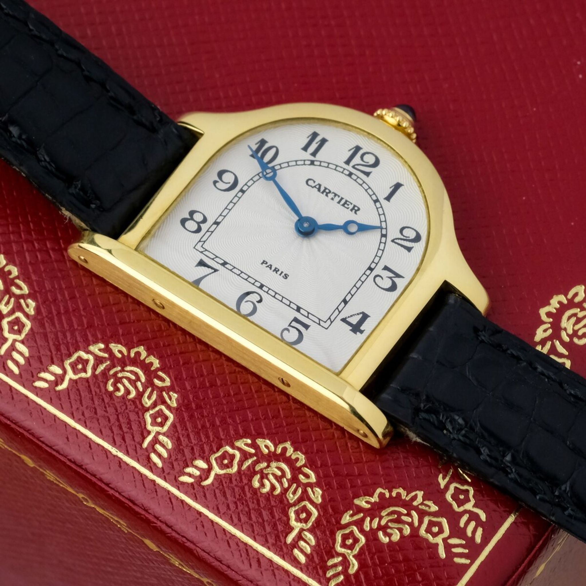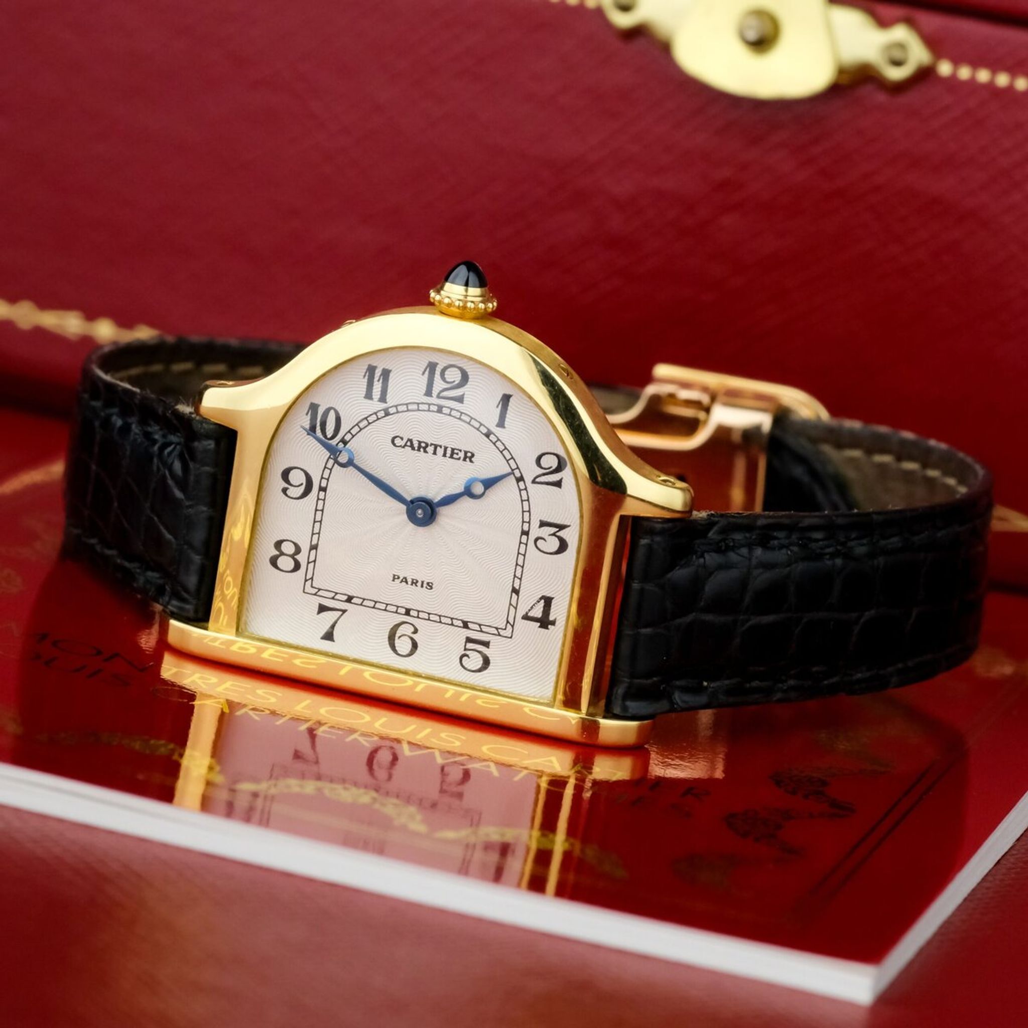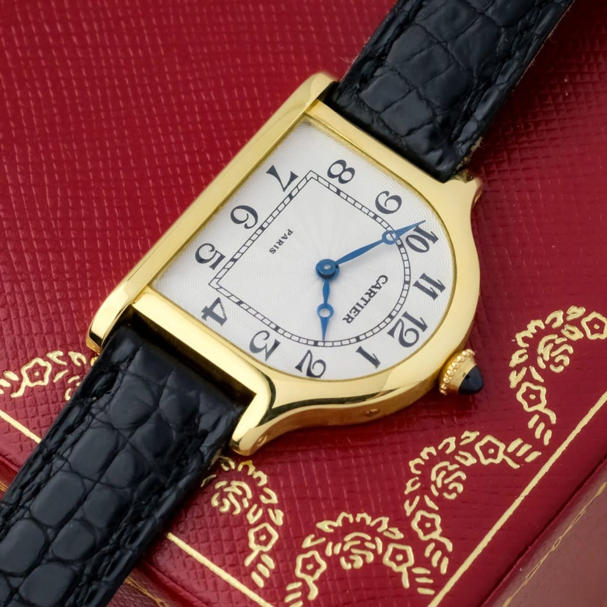 This Cartier Cloche de Cartier reference 8876 is an exceptionally rare and historically significant creation, limited to just 200 pieces and produced in 1995 as a precursor to the celebrated CPCP collection. Crafted in 18k yellow gold, the case takes the distinctive bell shaped form that gives the model its name, executed with perfect symmetry and Cartier’s unmistakable design finesse.