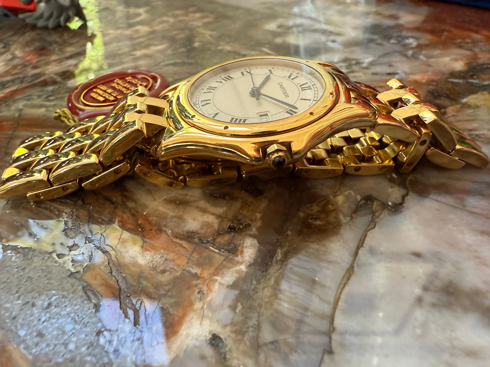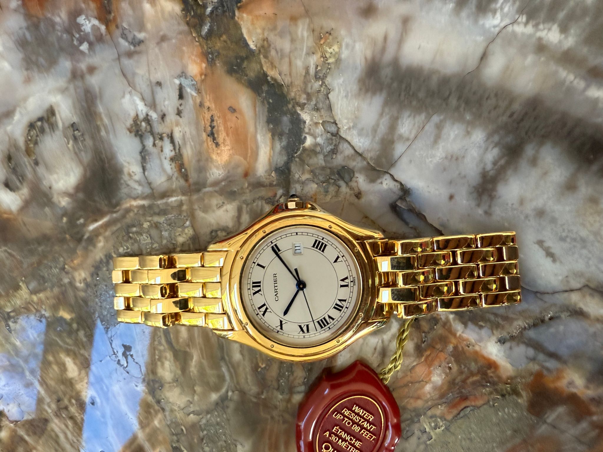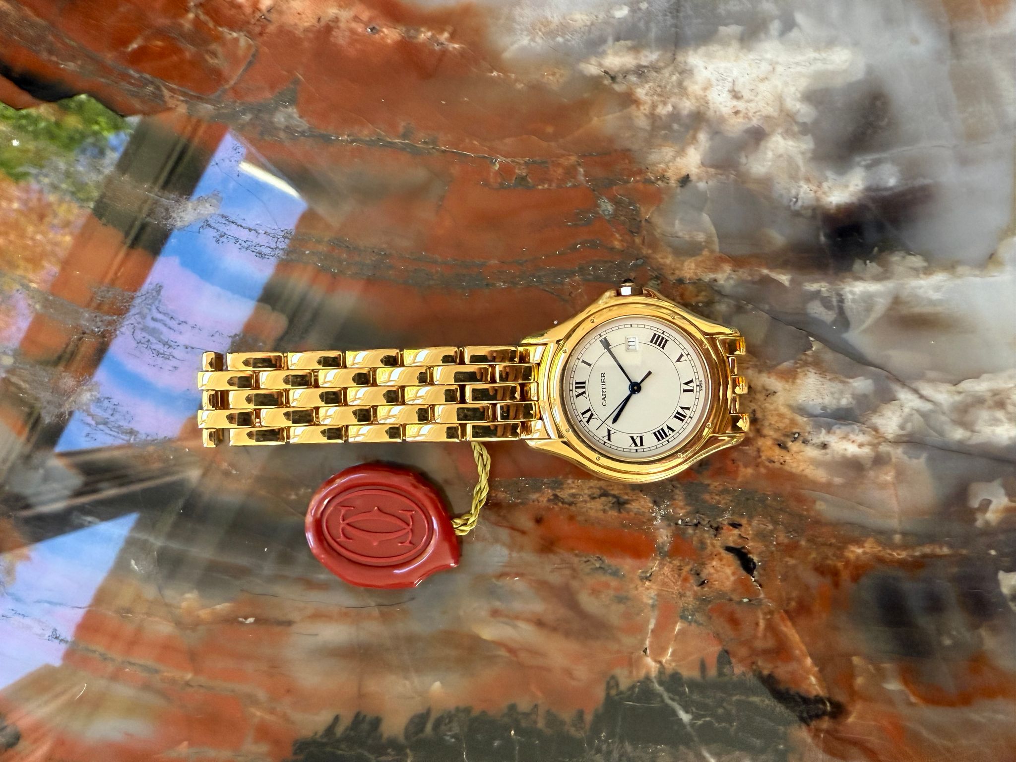 The Cartier 18K Yellow Gold Cougar is a classic statement piece. It captivates and draws you in at first glance. Perhaps it is the huge gold presence or the contrast in the decoration of the bracelet. Measuring 33mm this watch has some real wrist presence and is perfect for any wearer looking to make a bold statement. The watch features a Cartier quartz movement, so no need to worry about winding or setting the time. The watch fits a 7.50 wrist and can be adjusted to fit a range of wrist sizes. The watch is in pristine condition and includes original papers.