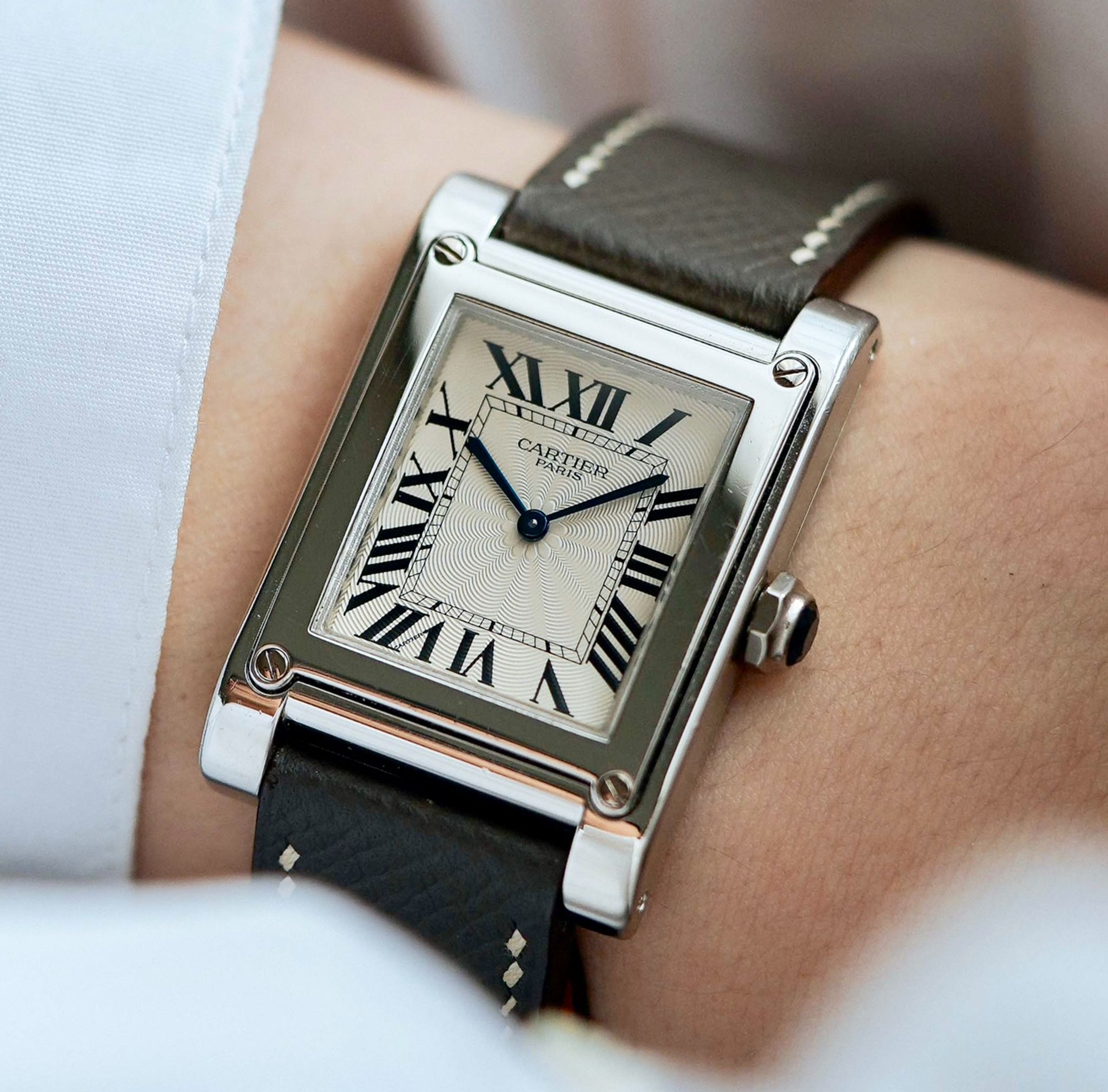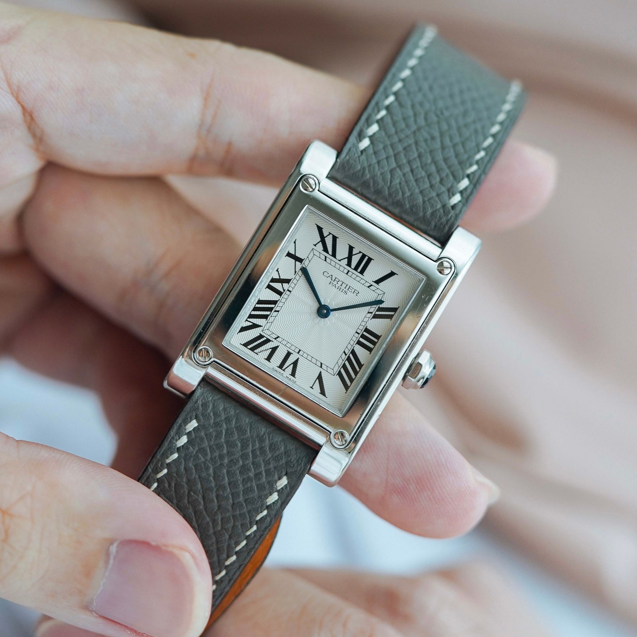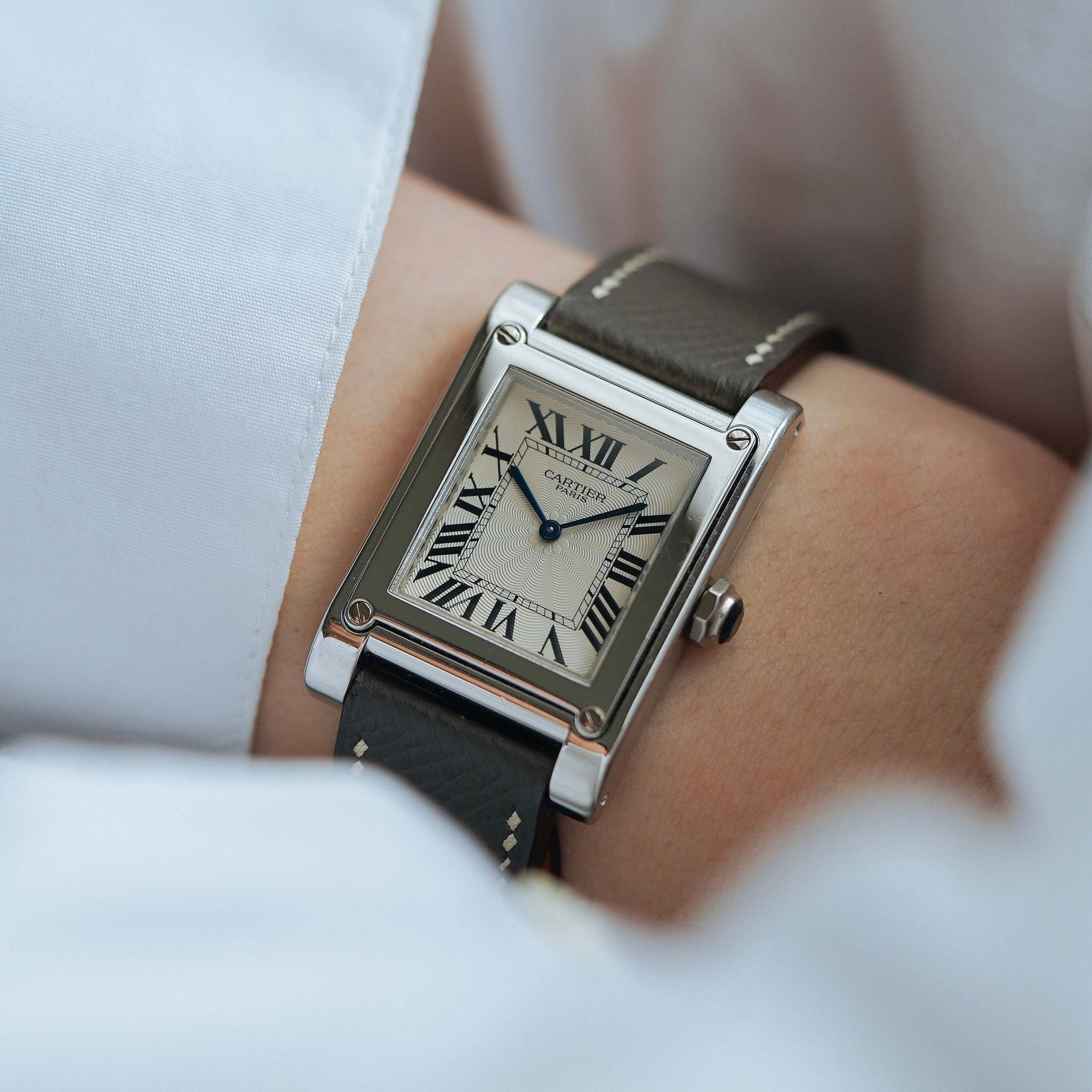 The case is 27 mm x 39 mm and just 8mm thin; elegant yet modern. Polished on the bezel and the down to the base of each lug with brushed sides and a closed back, the watch includes a 'water resistant' engraving in keeping with its rich history. As with its all CPCP models, the dial is incredible: solid 18k white gold with hand-engraved rosette guilloché, inspired by Cartier’s vintage clocks.