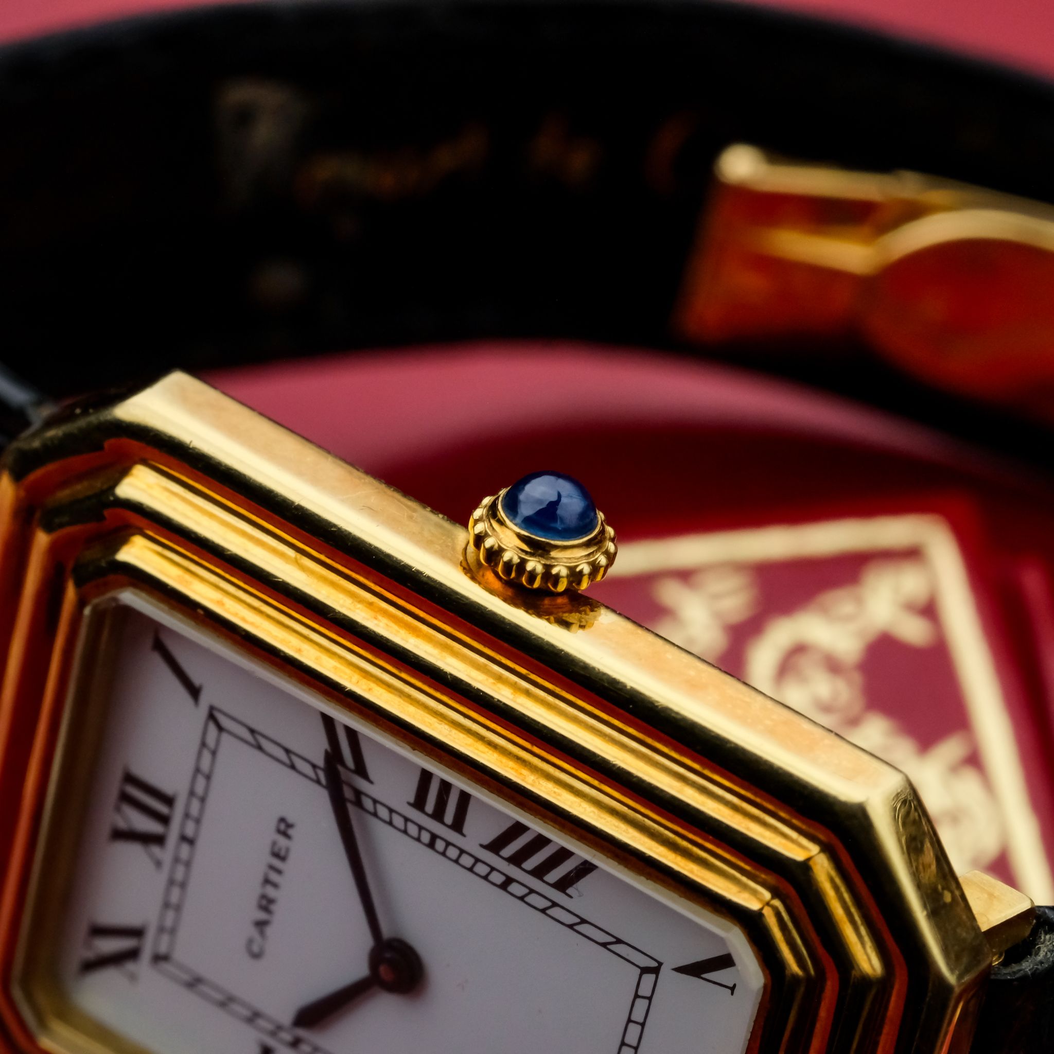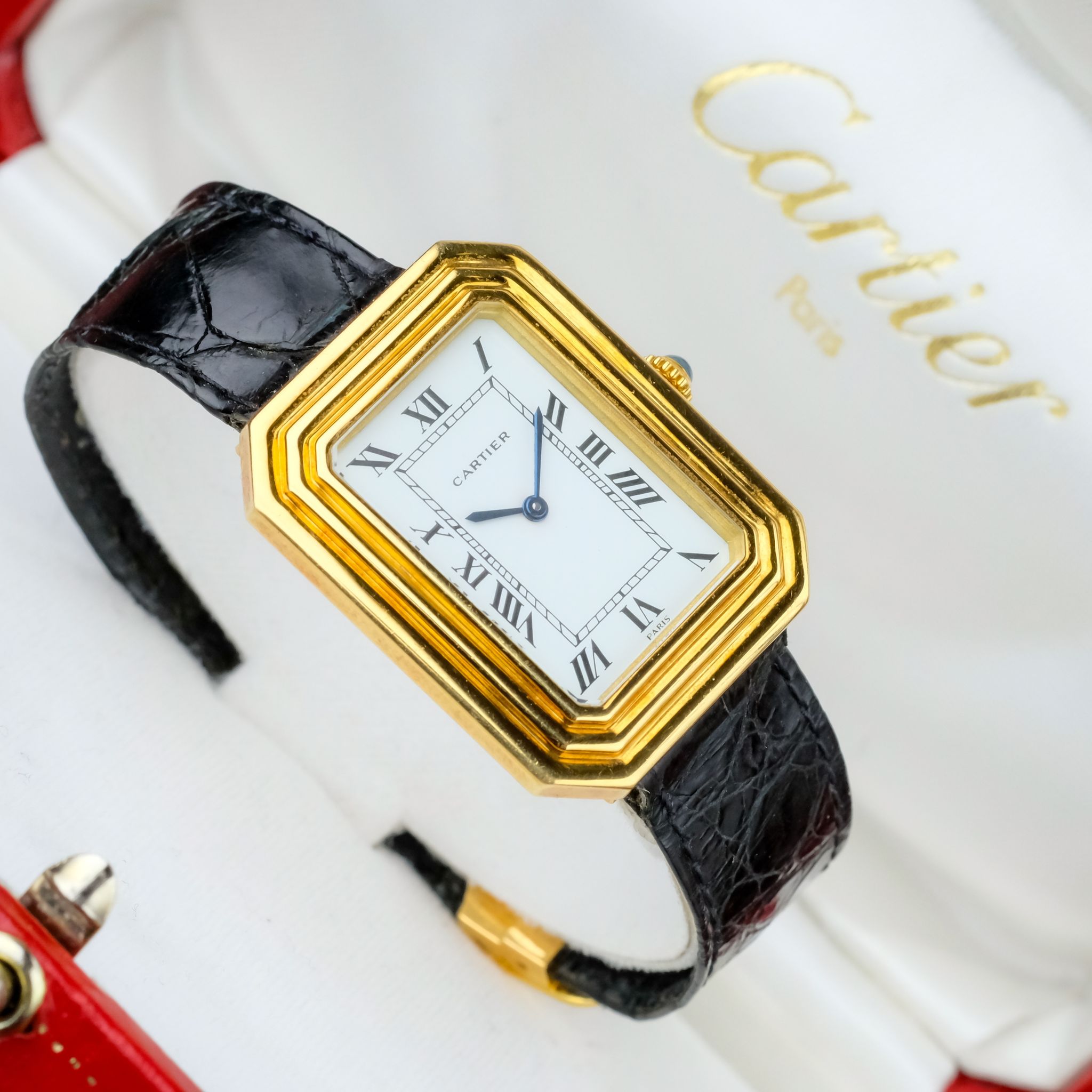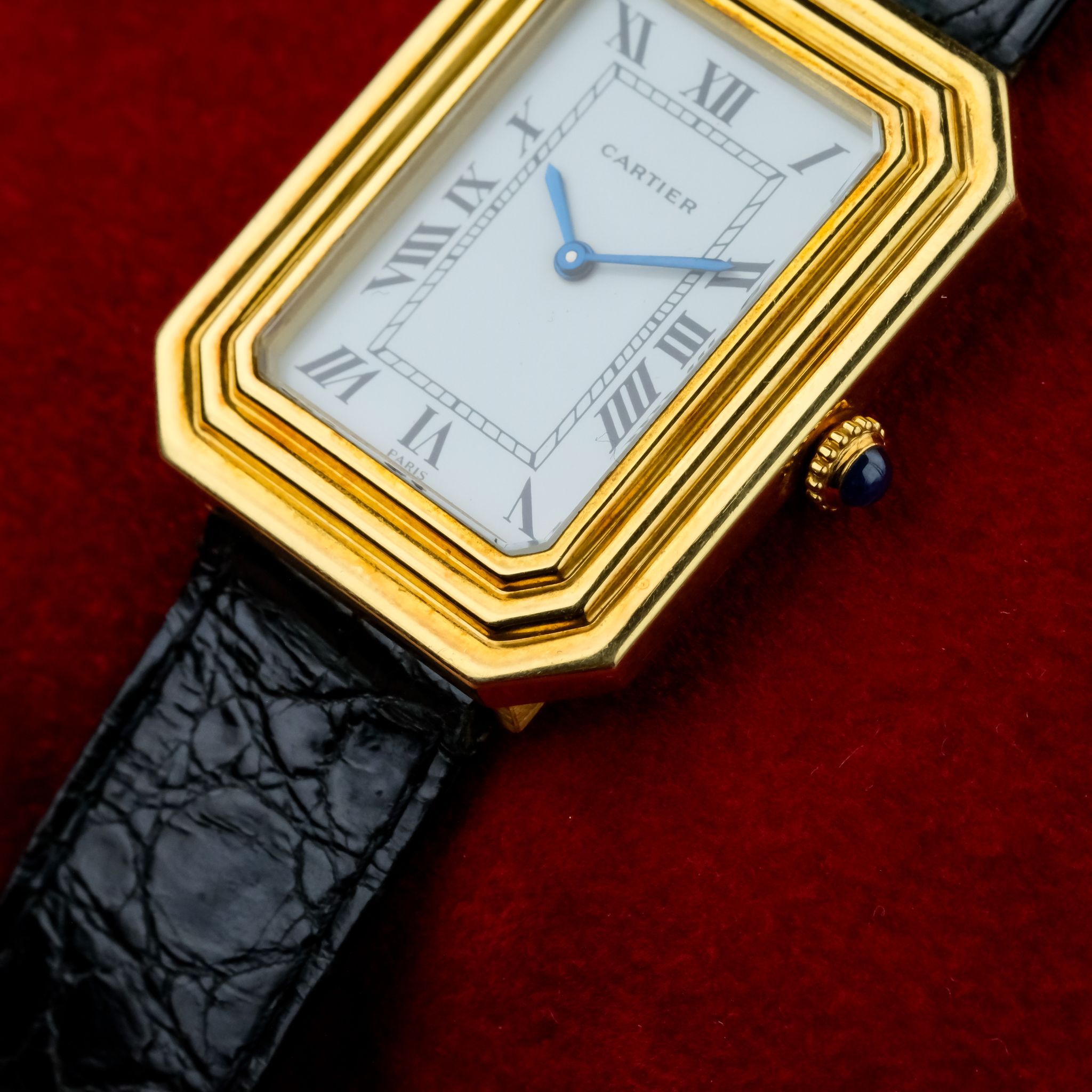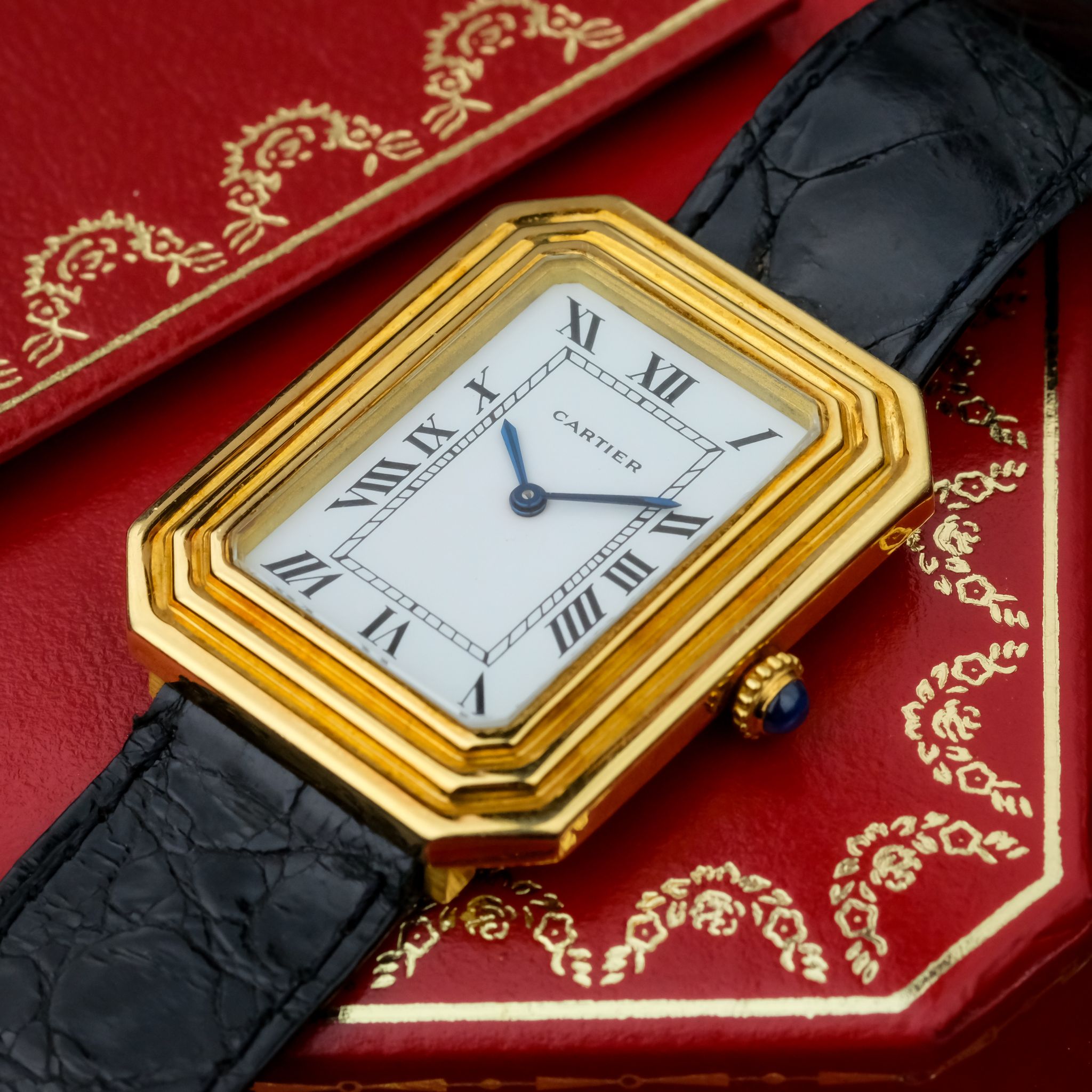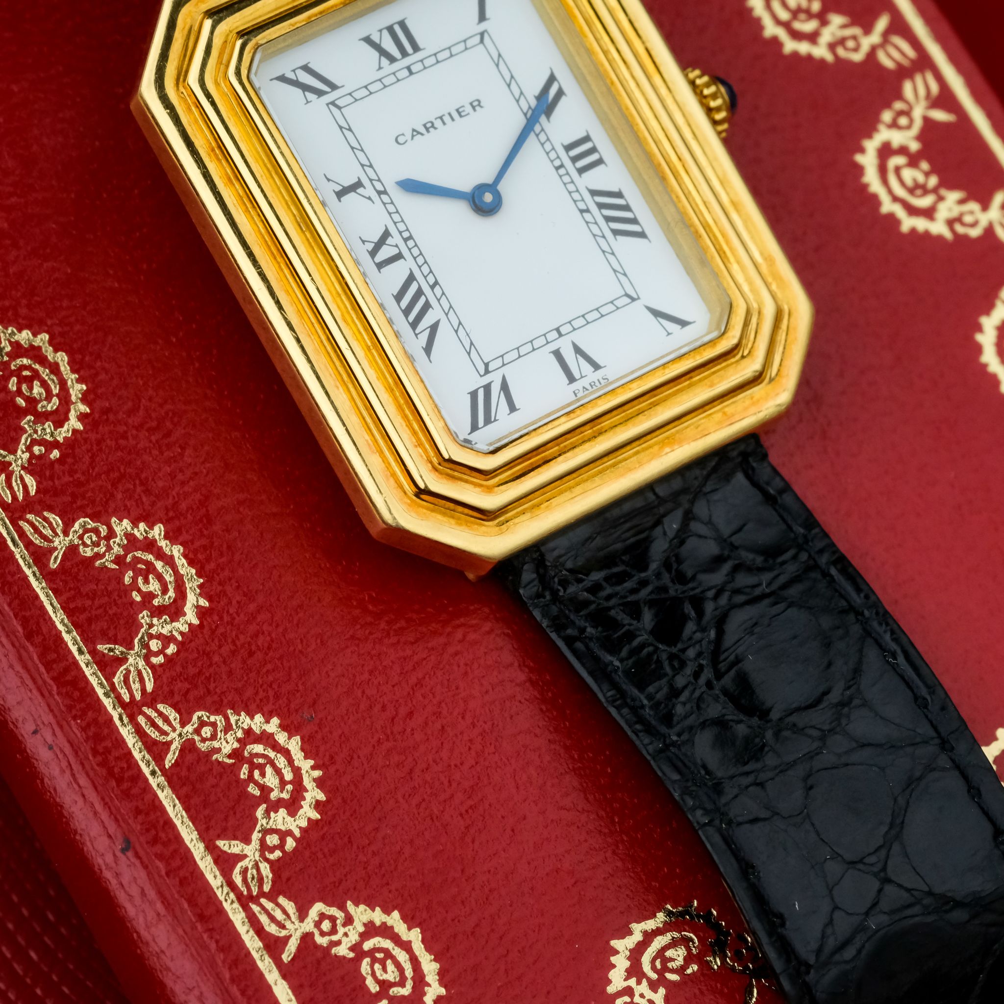 Impressive and increasingly rare to get Cartier Cristallor "jumbo" ref. 78096 in only very rarely worn condition, original "Paris dial without any hairlines. It appears like after only very few wears it was placed in a drawer (*head upwards hence the clasps marks on the caseback) because of the incredible condition and the original strap lightly worn still mounted.
