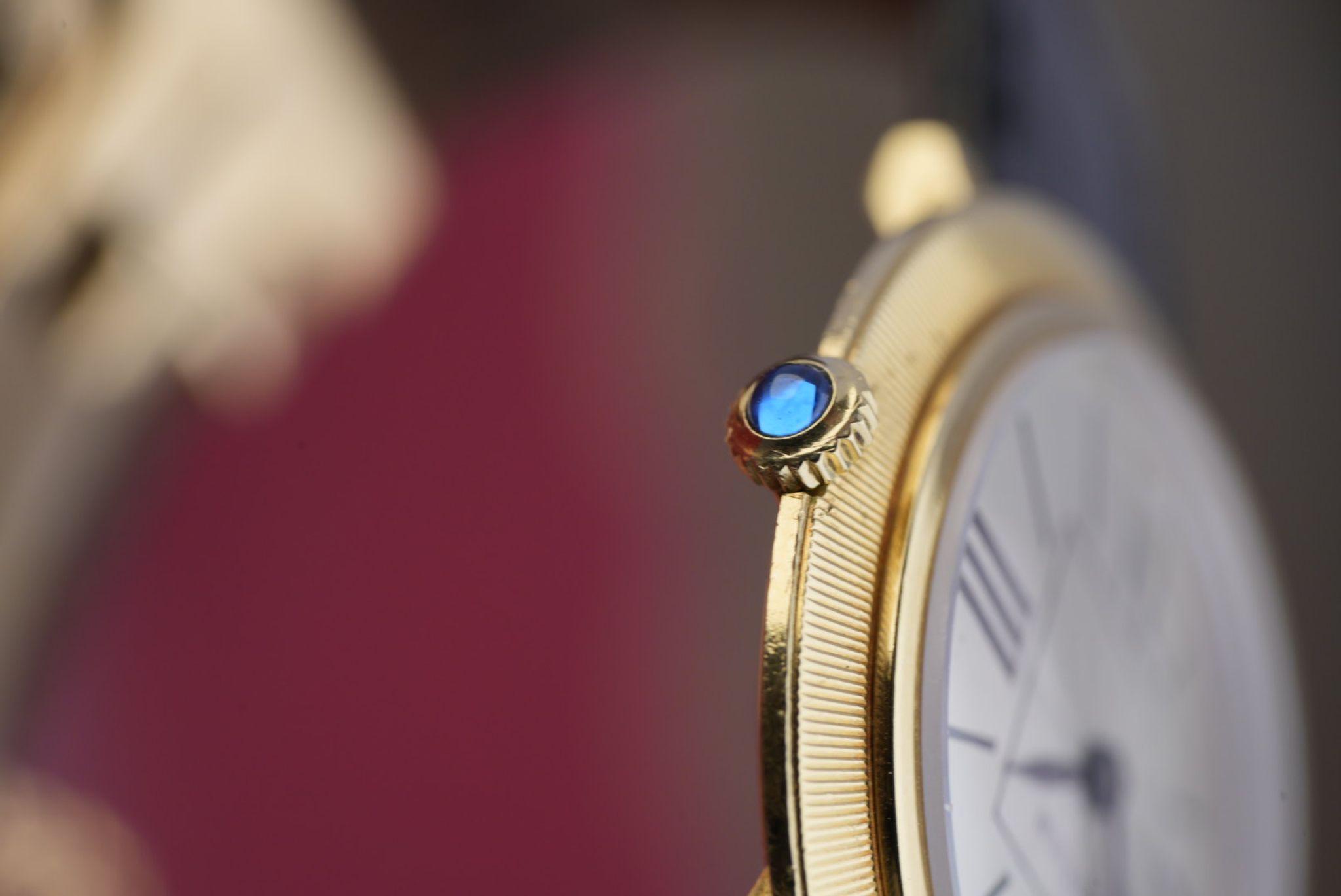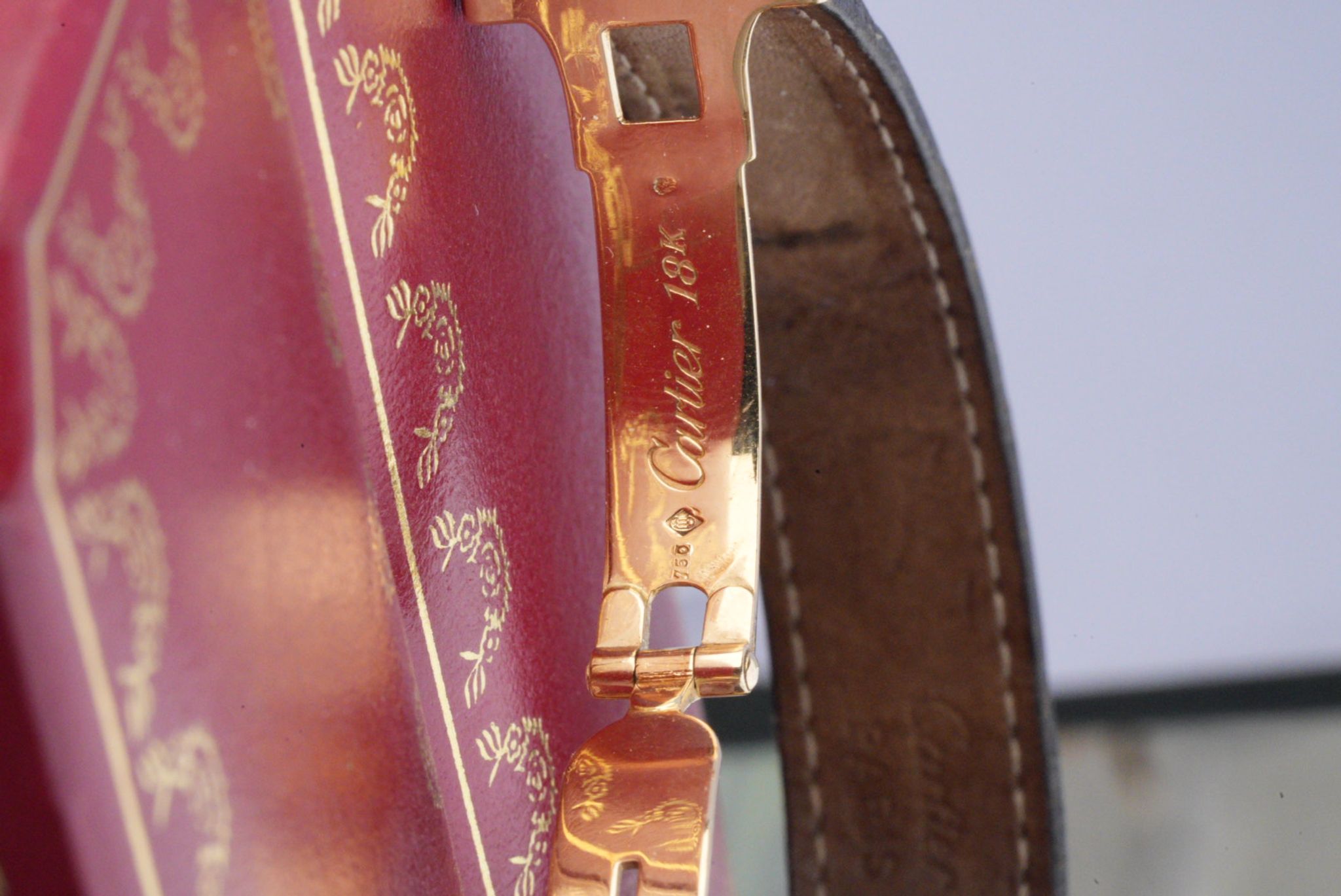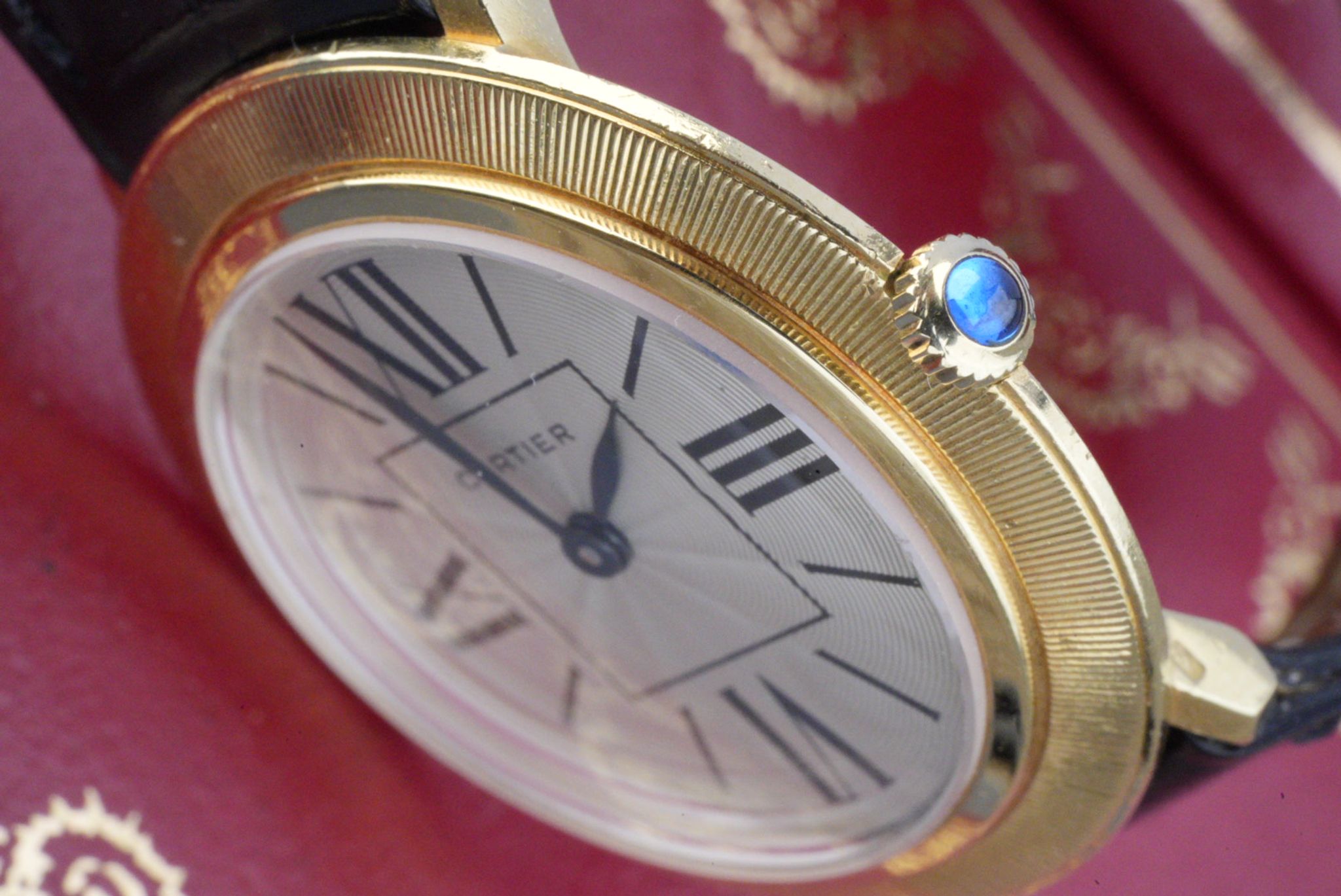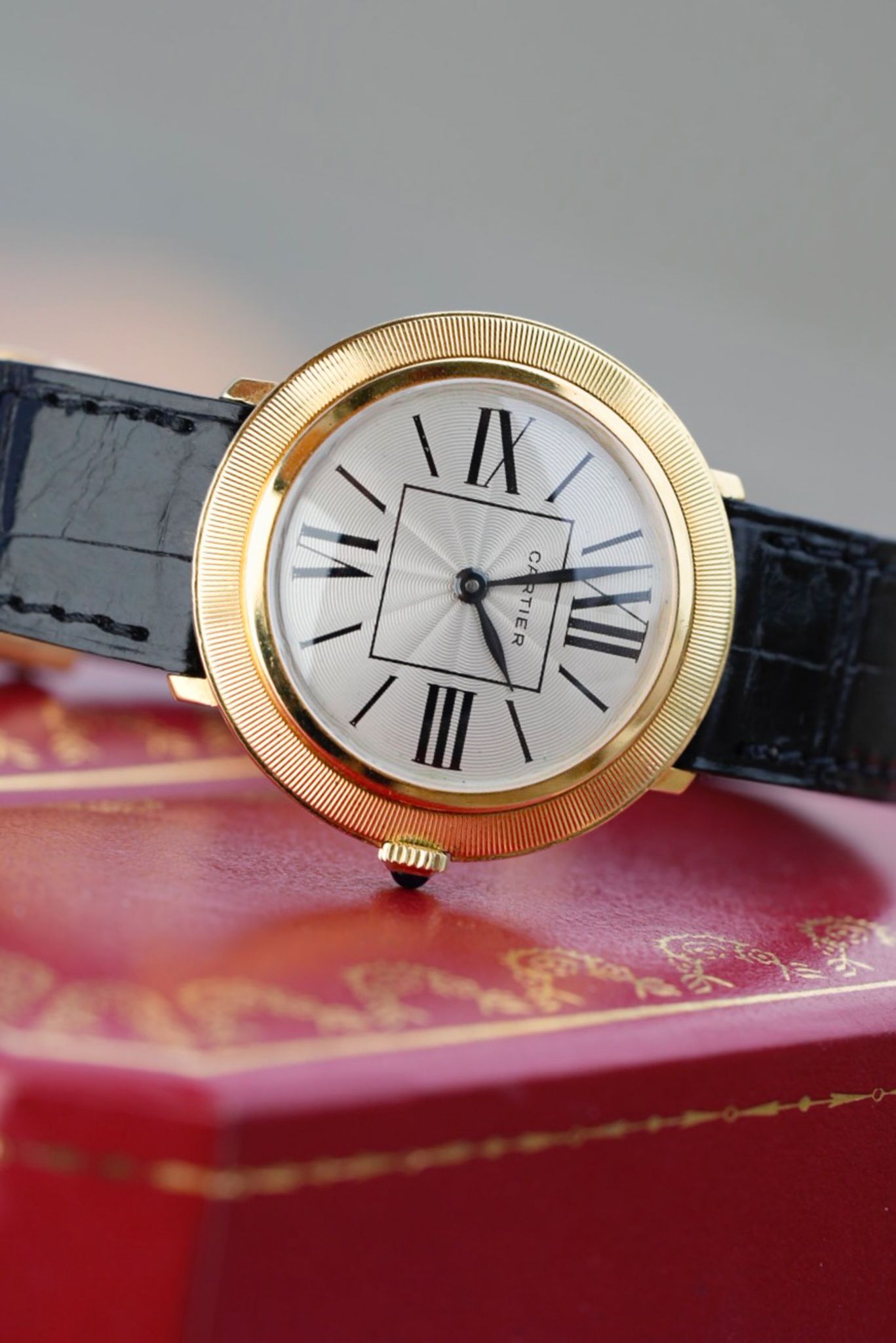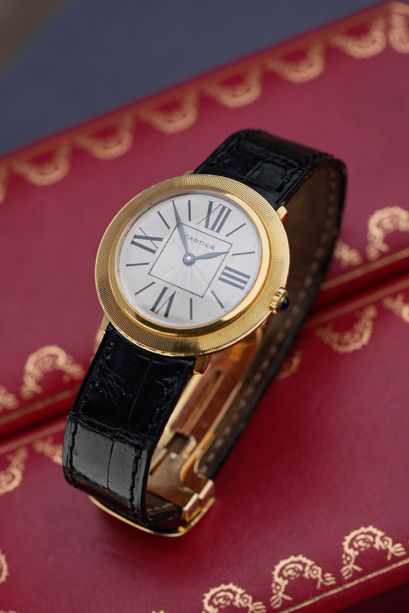 Rare and well-preserved Cartier Disco Volante wristwatch in 18K yellow gold from the 1970s, powered by a manual winding movement signed by Cartier. The 32 mm round case features a fluted bezel, is individually numbered, and fitted with a cabochon sapphire crown. The dial displays a finely executed guilloché pattern radiating from the center, framed by a square cartouche with the Cartier signature. Oversized Roman numerals gently follow the curvature of the dial, complemented by blued steel hands. Presented on a leather strap with a Cartier-signed deployant buckle.