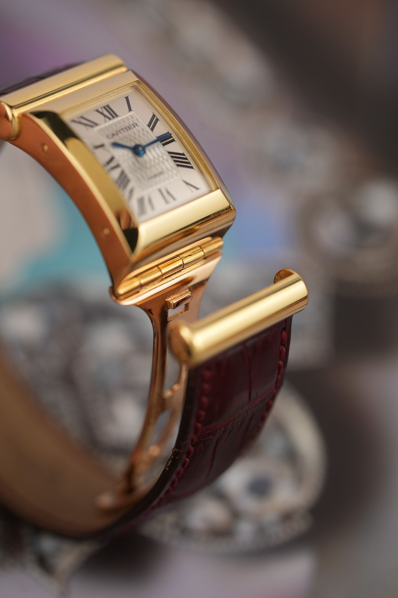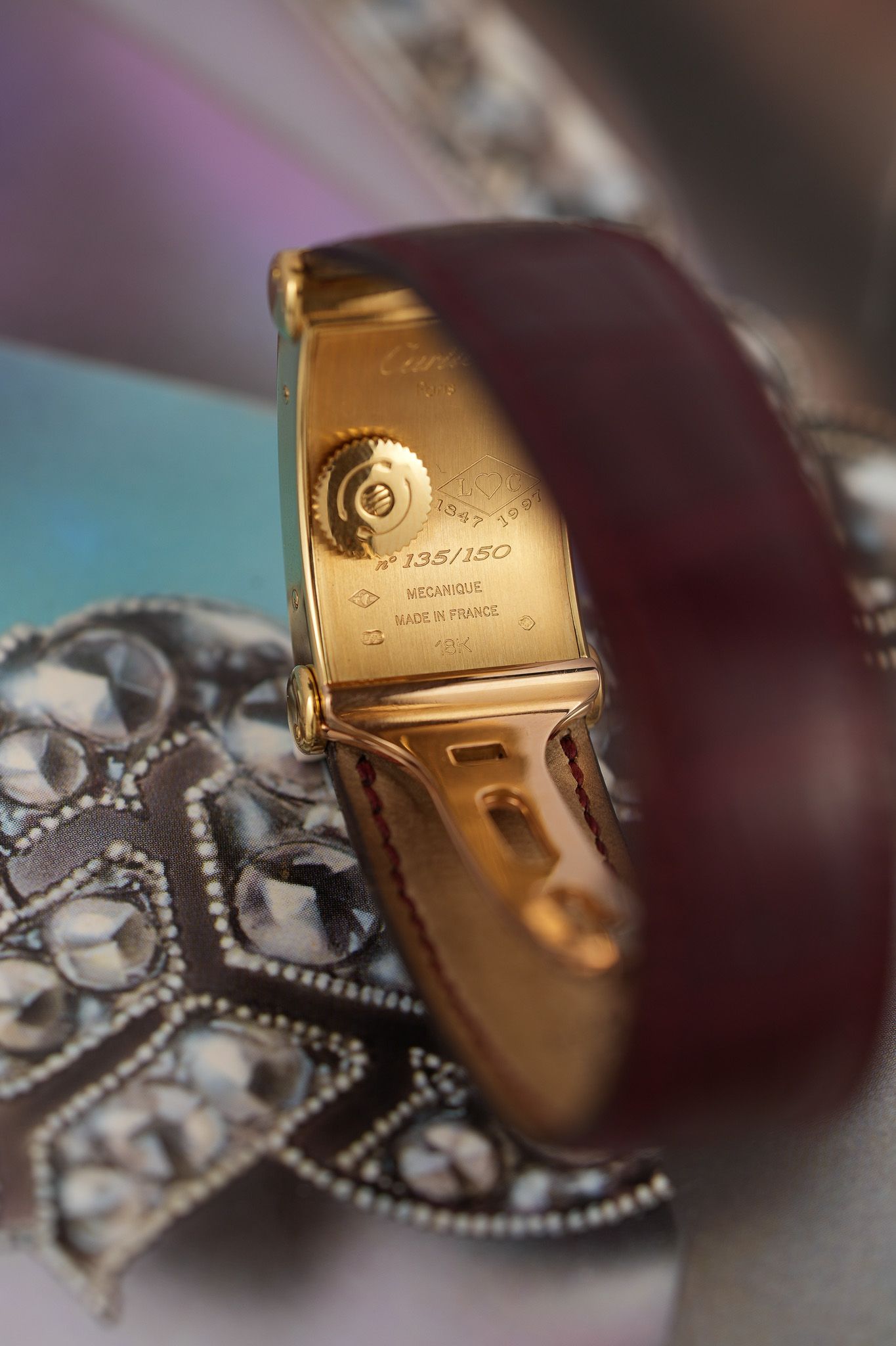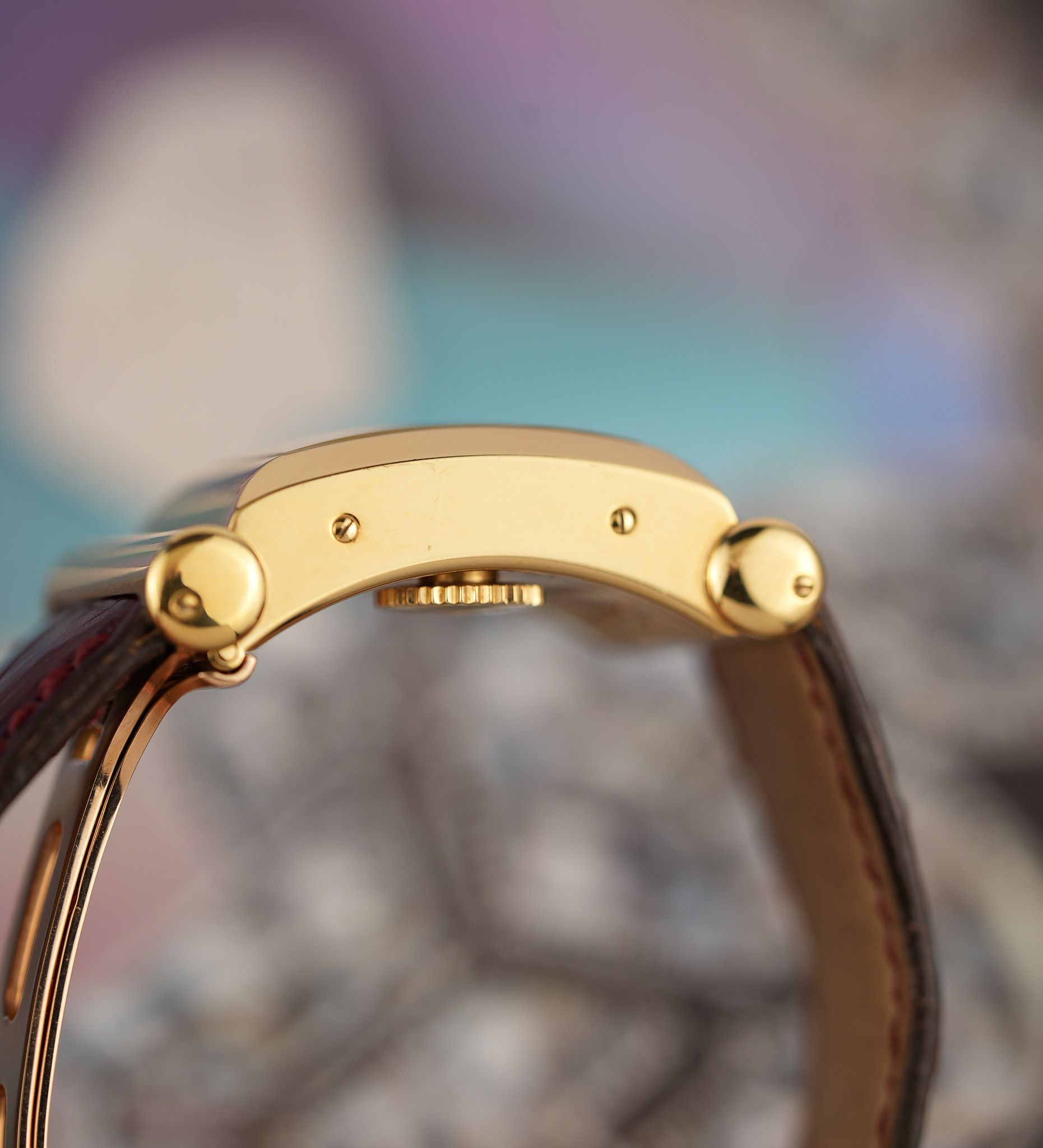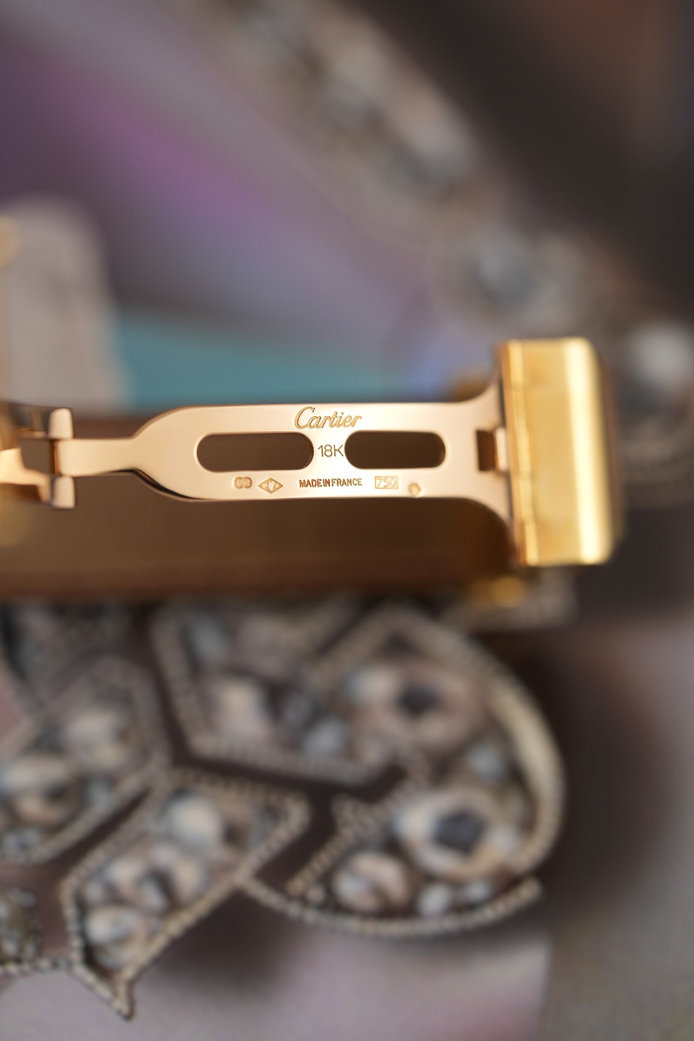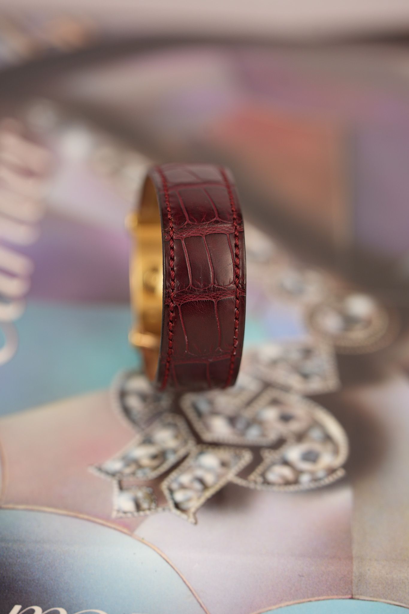The strap? Original Cartier burgundy alligator. Deep maroon, stitched tight, and completely continuous—because here’s the kicker: the deployant buckle is hidden inside the lower “leg” of the case. No obvious hinge. No pin buckle in sight. Just a seamless wrap of leather that fastens like magic. Cartier even snuck in a two-tone twist: the deployant’s interior clasp is made of rose gold, likely for structural integrity (rose gold’s copper content makes it tougher). But also? It just looks cool.