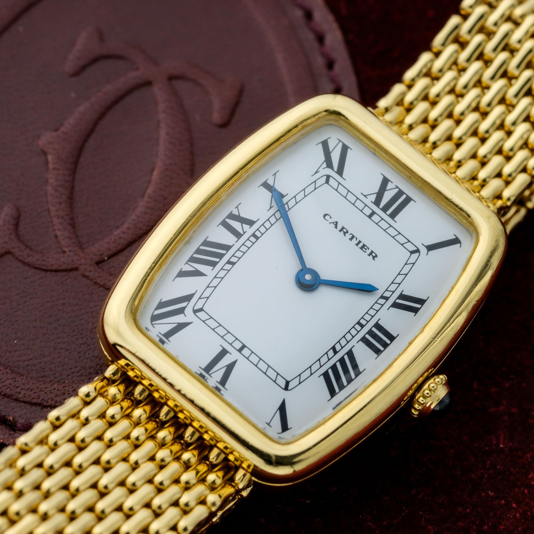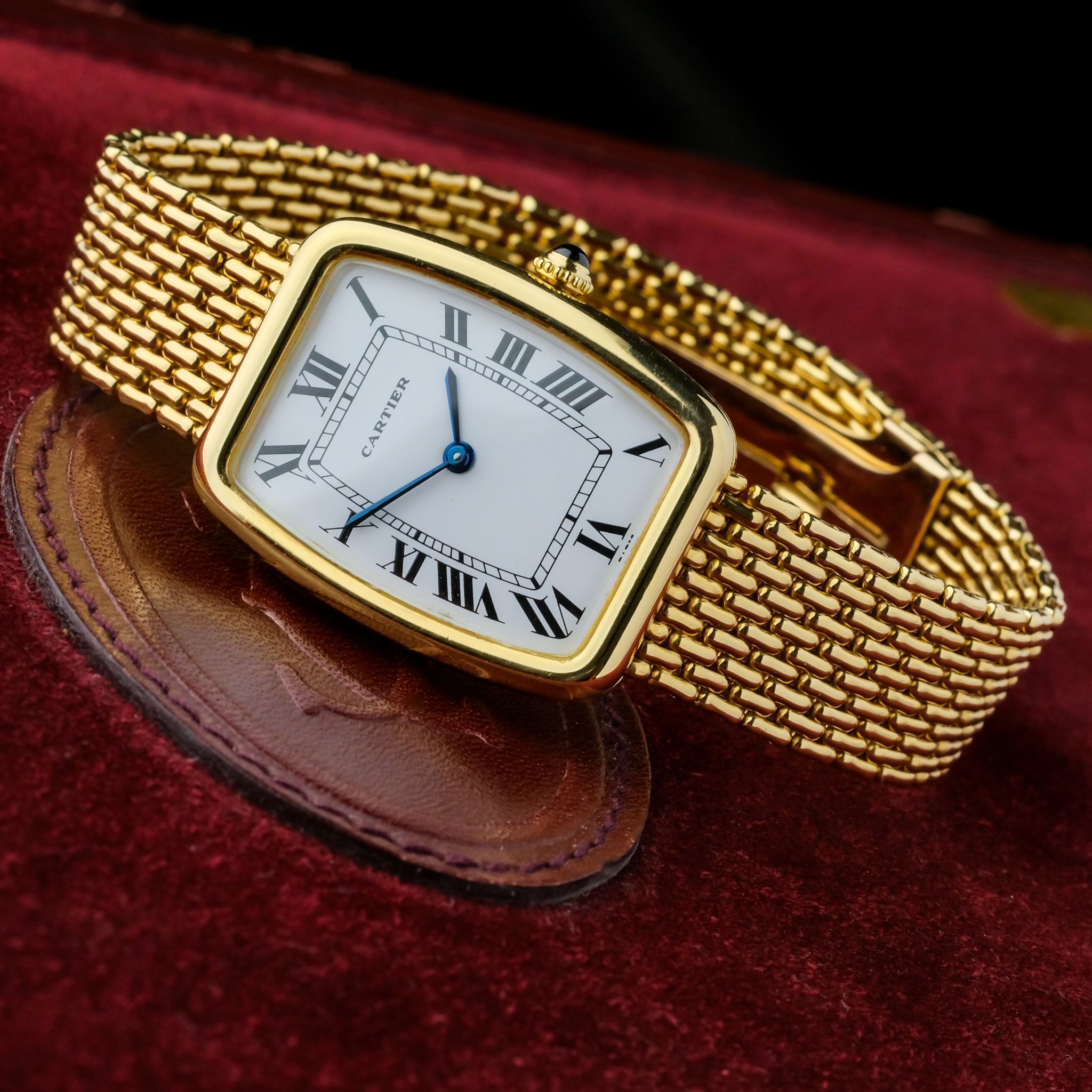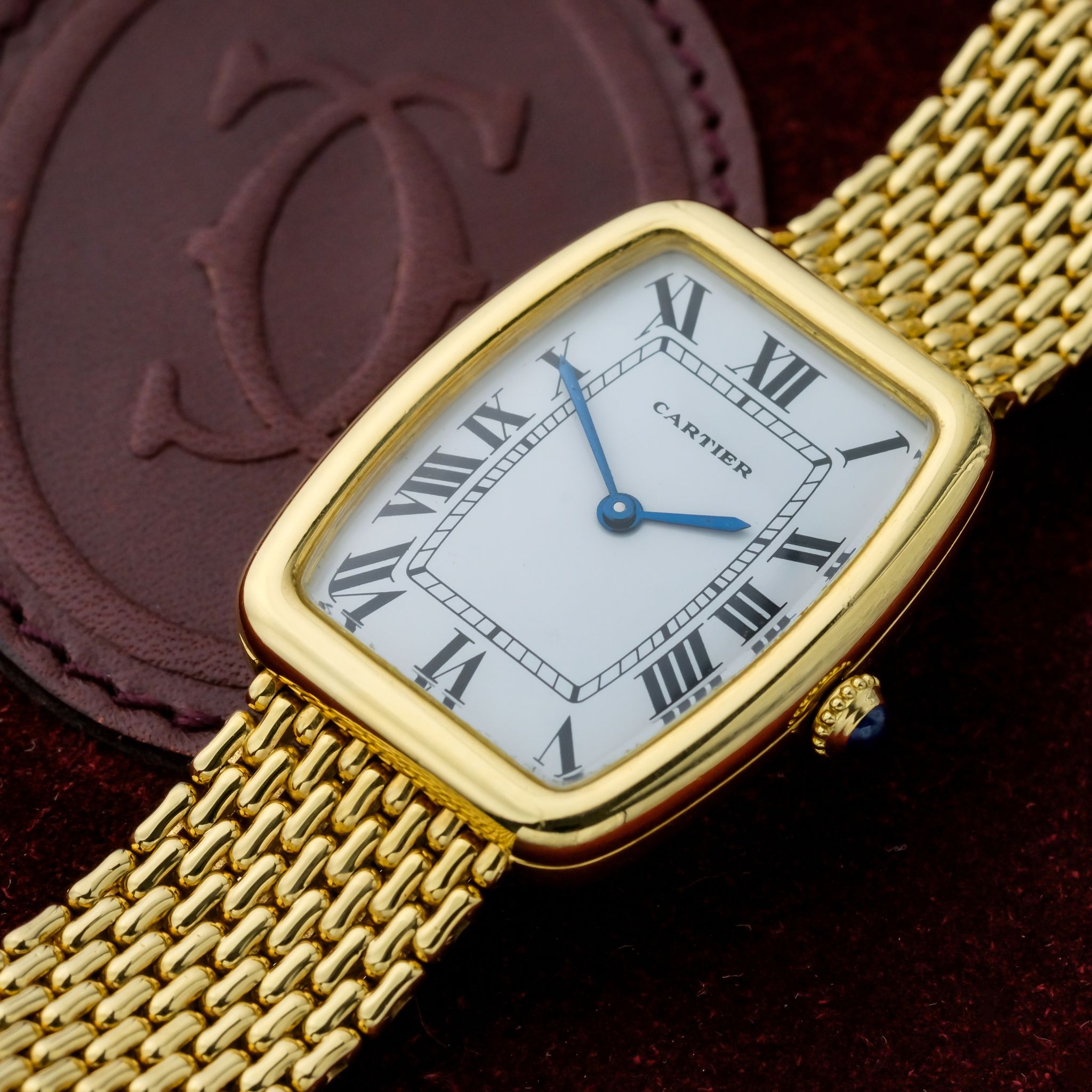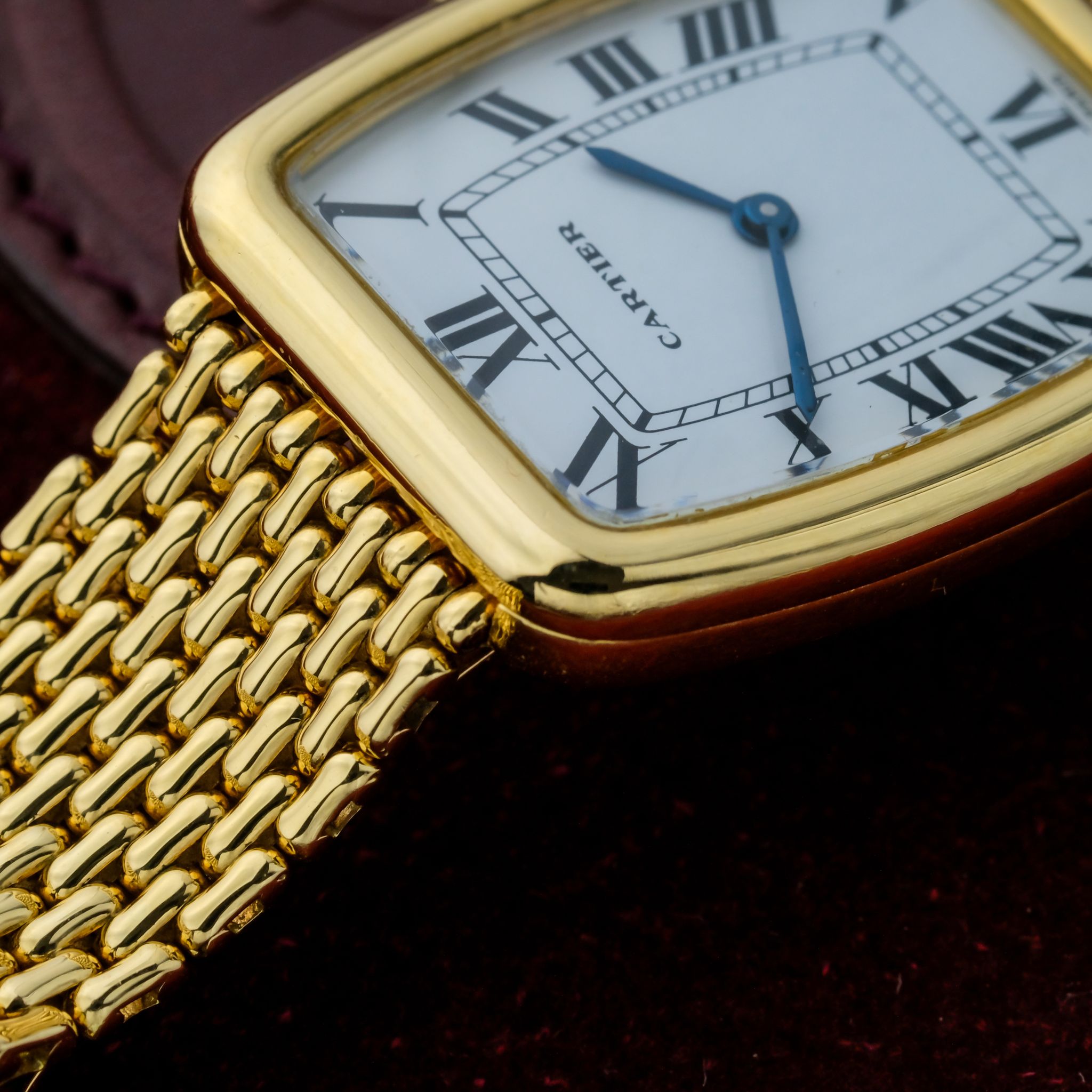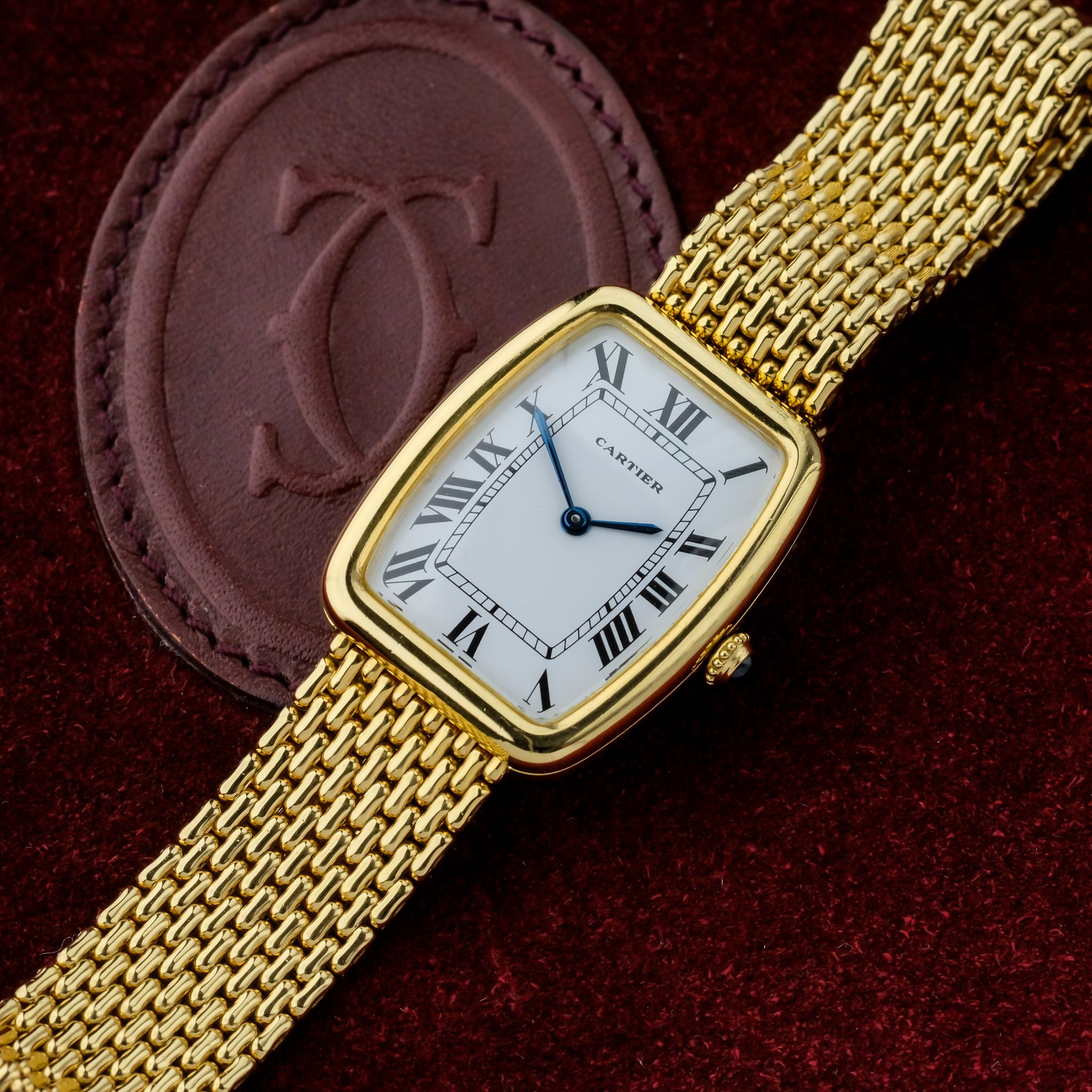 Beautiful and very rare Cartier Fabergé or Square Incurvée reference 78101 in very good, unpolished condition. The model is part of the Louis Cartier Collection of the 1970s and is one of the more exotic variants. The case of the watch is in good condition. The white Paris dial is very well preserved and shows hardly any patina. A paris dial from this period without cracks in the clear lacquer or discoloration is something very special. It’s the first watch of that model with the grain de riz bracelet to appear. It’s in very good condition, has no more than light stretch and is long enough for a wristsize of 18cm. The manual wind movement has recently been checked and runs properly.