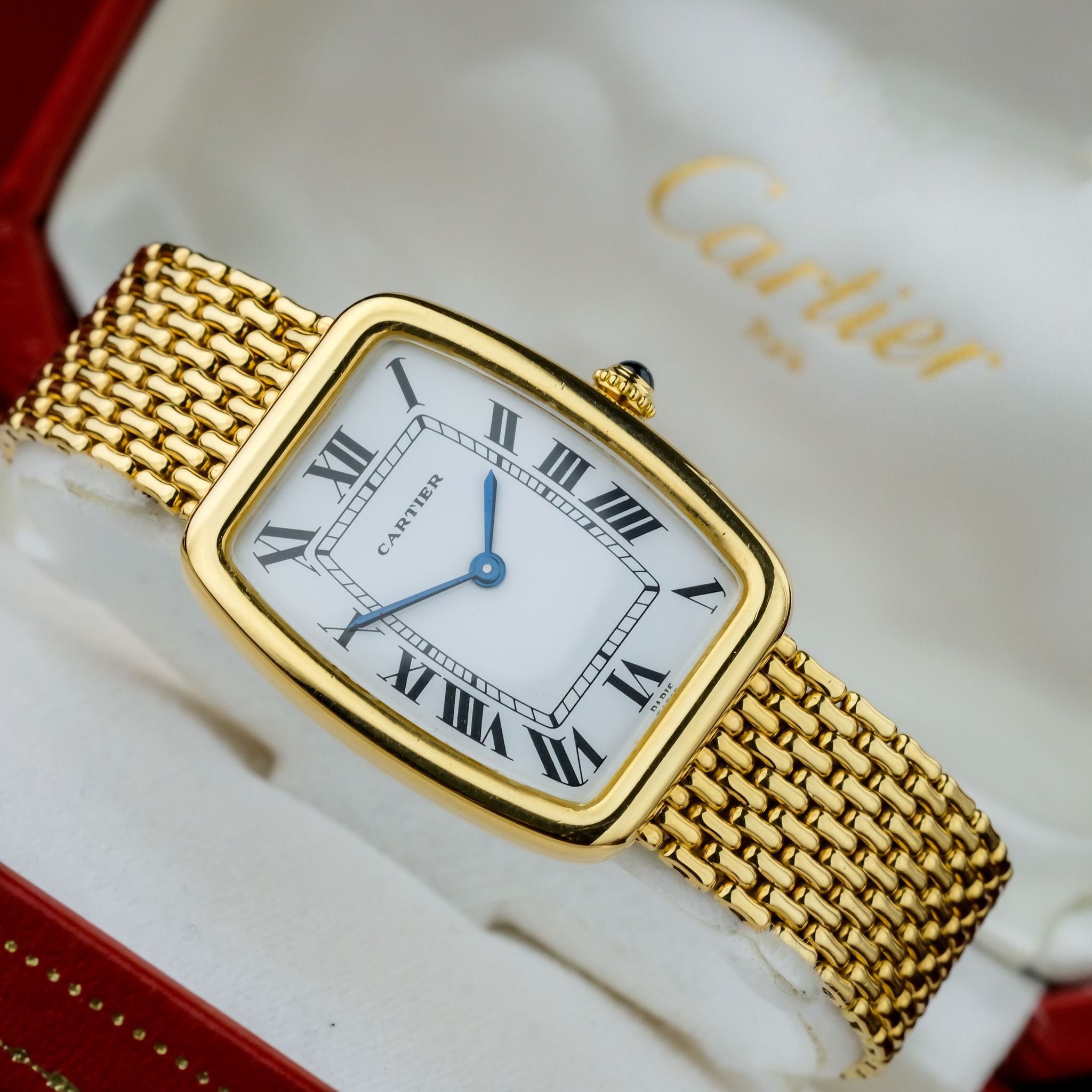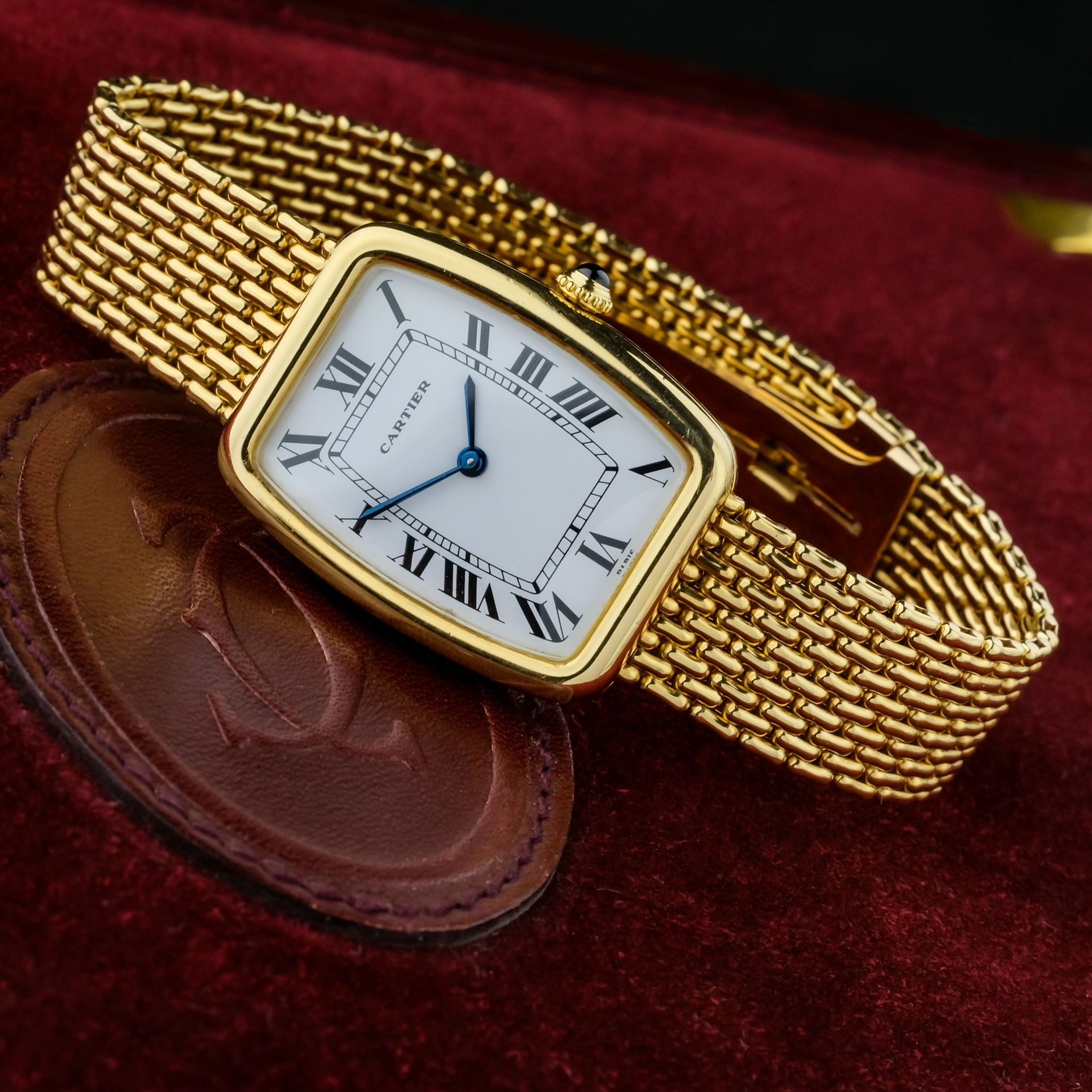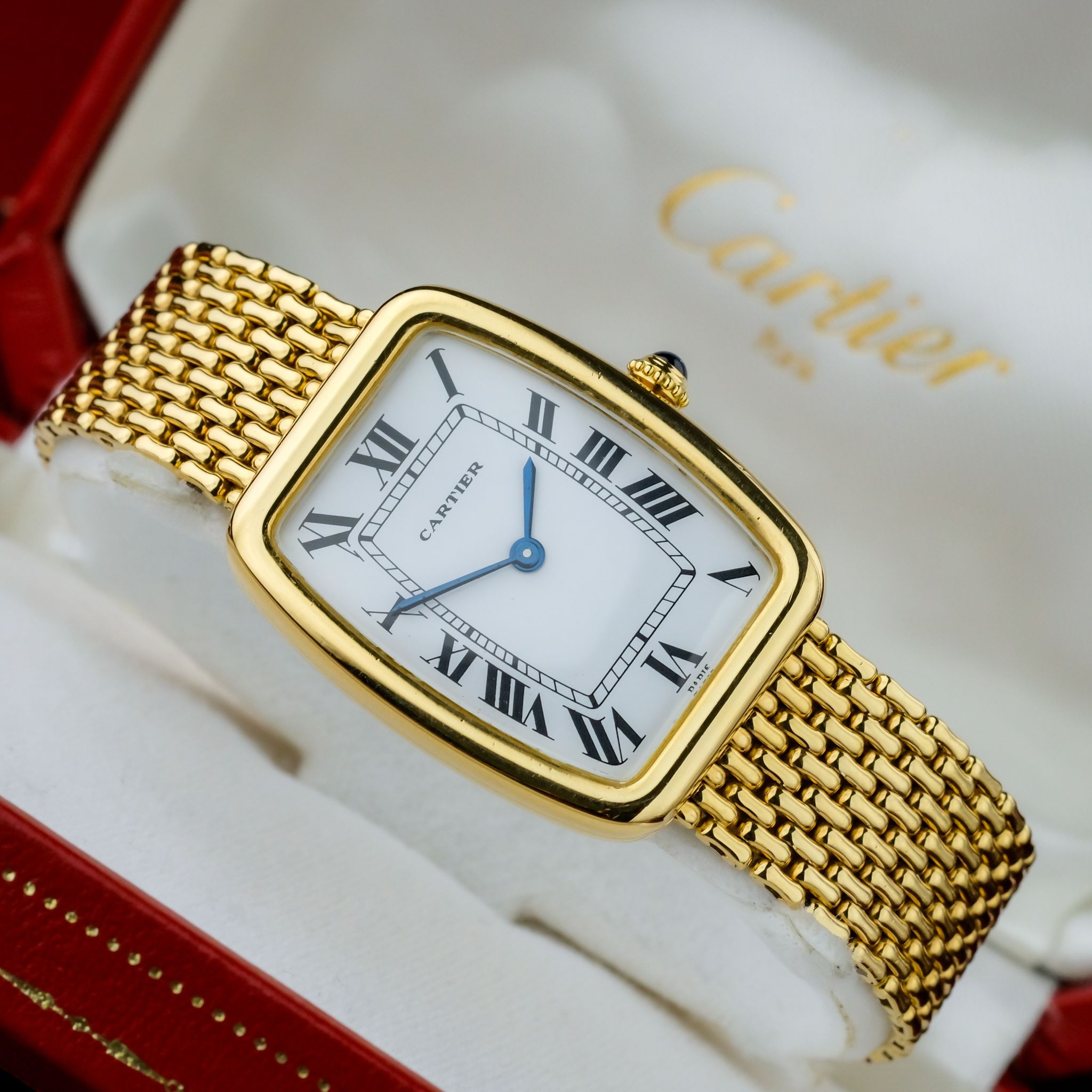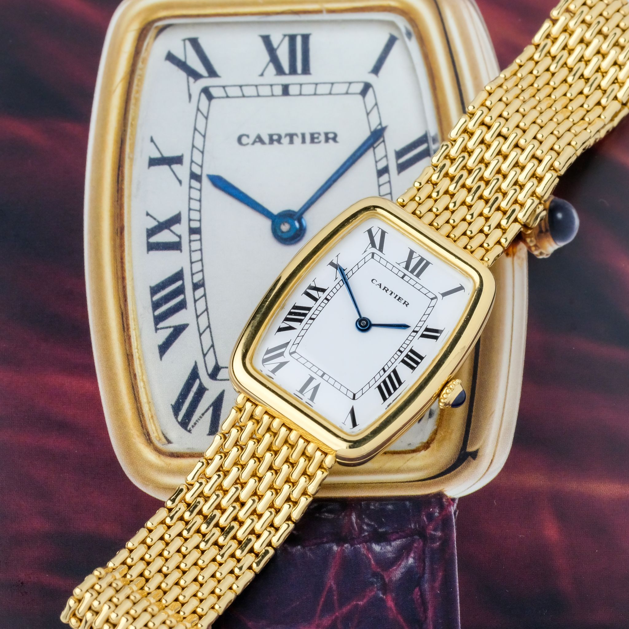 Beautiful and very rare Cartier Fabergé or Square Incurvée reference 78101 in very good, unpolished condition. The model is part of the Louis Cartier Collection of the 1970s and is one of the more exotic variants. The case of the watch is in good condition. The white Paris dial is very well preserved and shows hardly any patina. A paris dial from this period without cracks in the clear lacquer or discoloration is something very special. It’s the first watch of that model with the grain de riz bracelet to appear. It’s in very good condition, has no more than light stretch and is long enough for a wristsize of 18cm. The manual wind movement has recently been checked and runs properly.