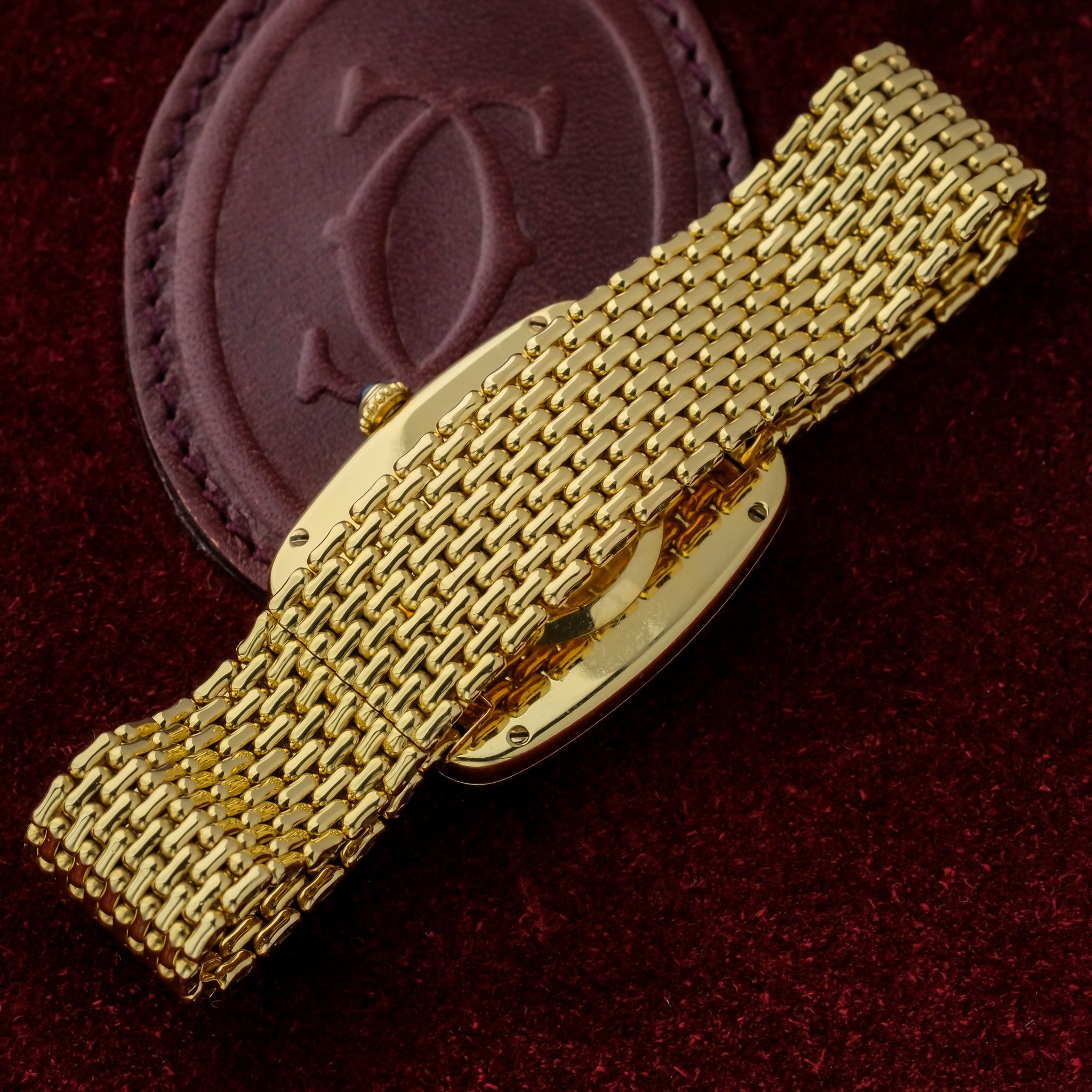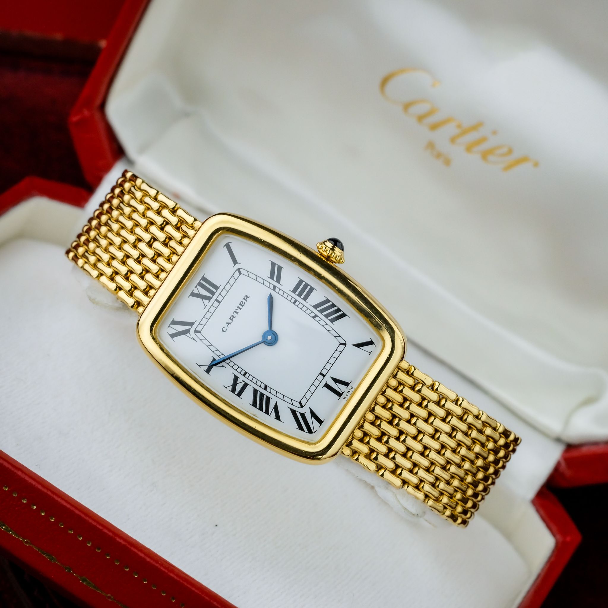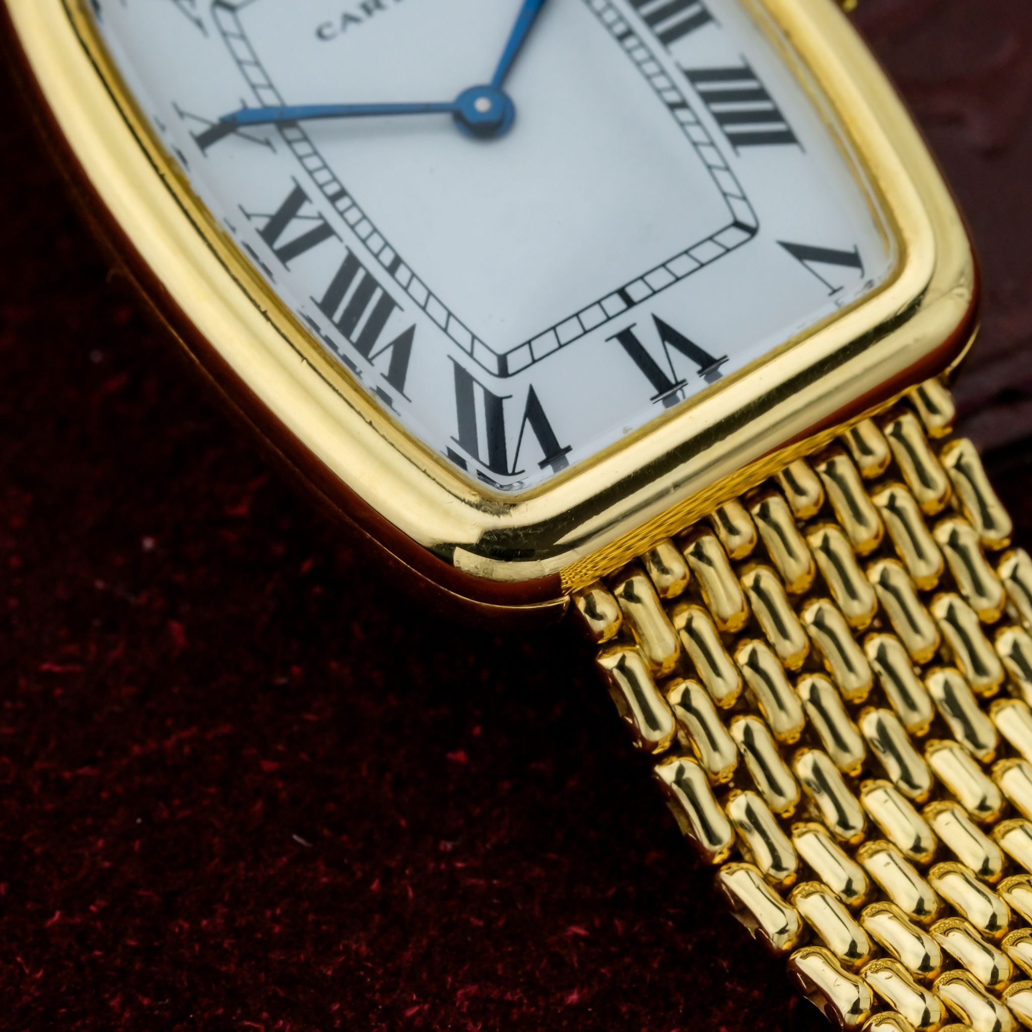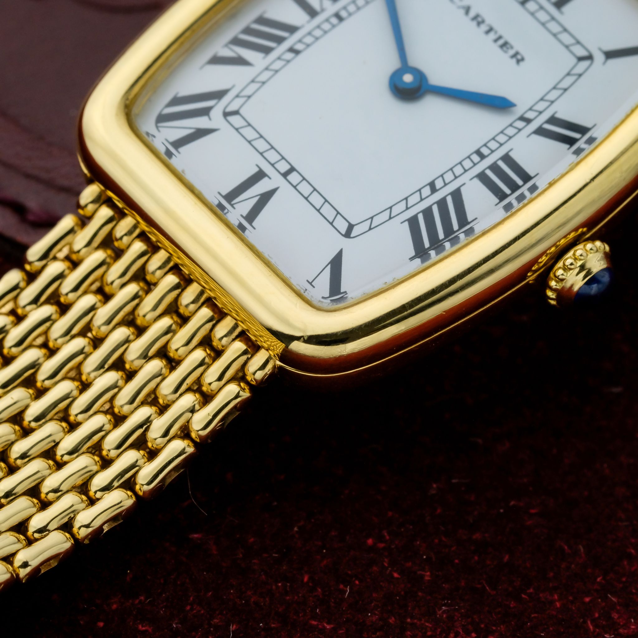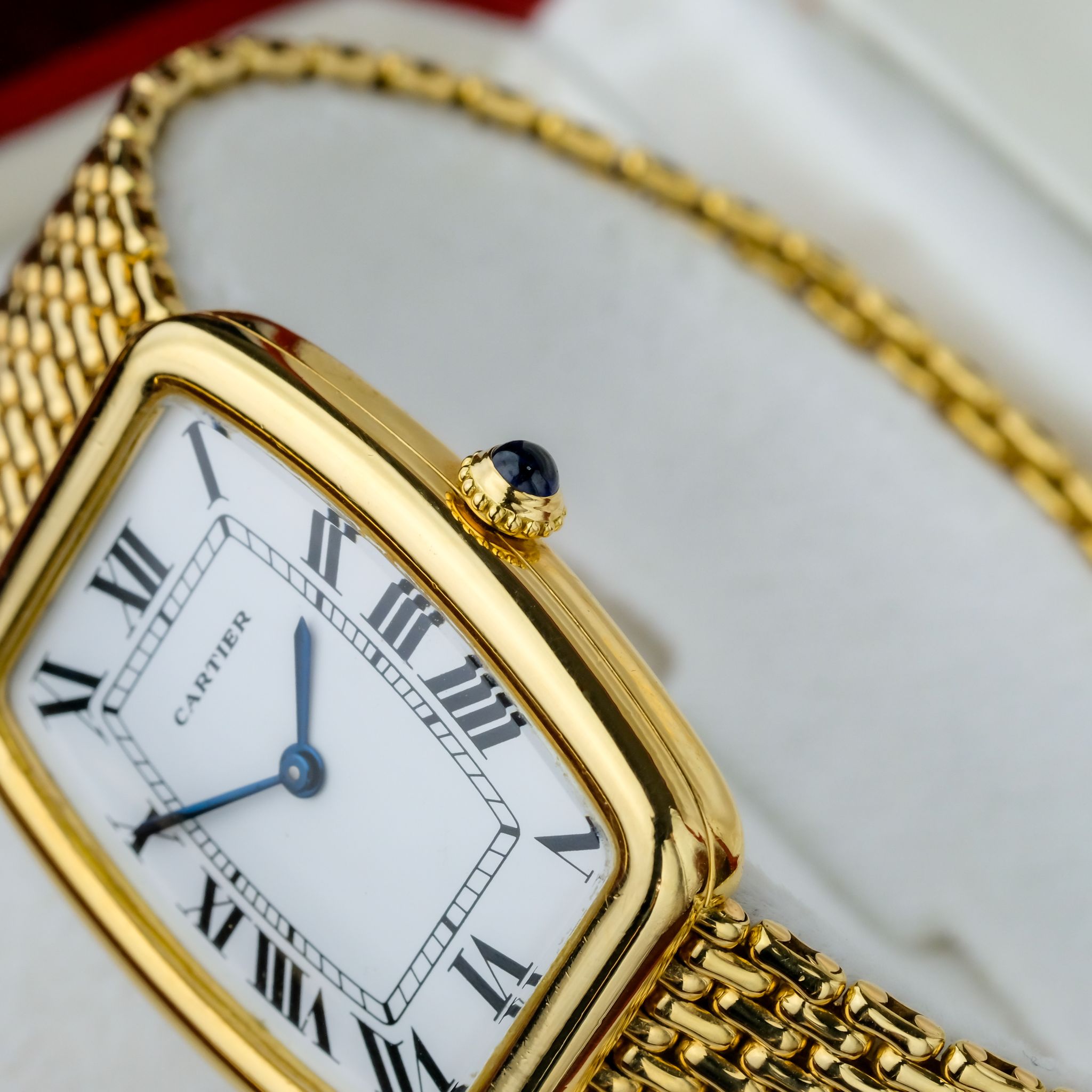 Beautiful and very rare Cartier Fabergé or Square Incurvée reference 78101 in very good, unpolished condition. The model is part of the Louis Cartier Collection of the 1970s and is one of the more exotic variants. The case of the watch is in good condition. The white Paris dial is very well preserved and shows hardly any patina. A paris dial from this period without cracks in the clear lacquer or discoloration is something very special. It’s the first watch of that model with the grain de riz bracelet to appear. It’s in very good condition, has no more than light stretch and is long enough for a wristsize of 18cm. The manual wind movement has recently been checked and runs properly.