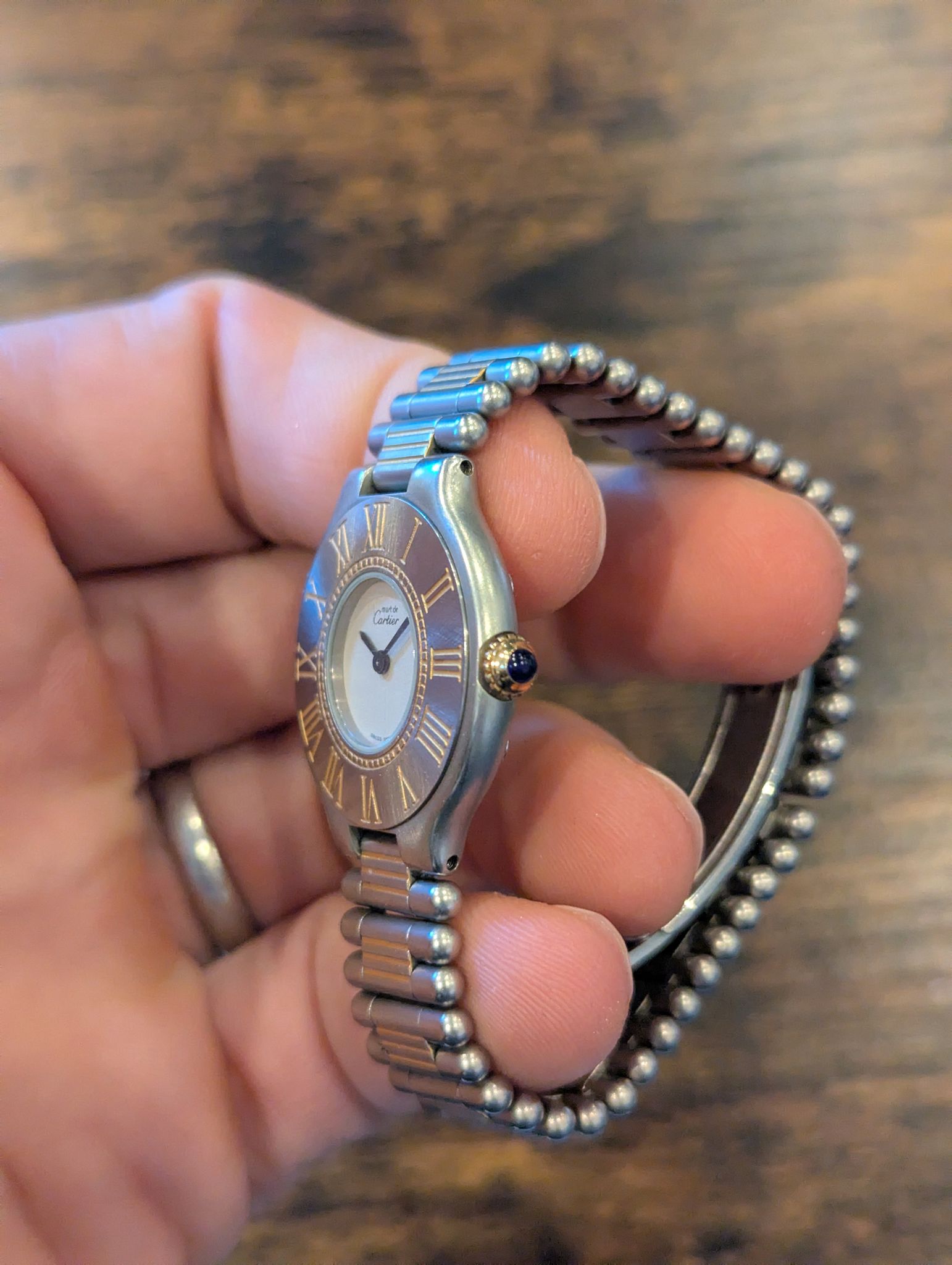 The Must 21 also stands out with its use of quartz movements, making it both reliable and practical for everyday wear. The signature Cartier blue sapphire cabochon crown and the minimalist dial with sword-shaped hands add to its refined appeal. Over the years, the Must 21 has become a symbol of timeless style, perfect for those seeking both luxury and functionality in a watch.