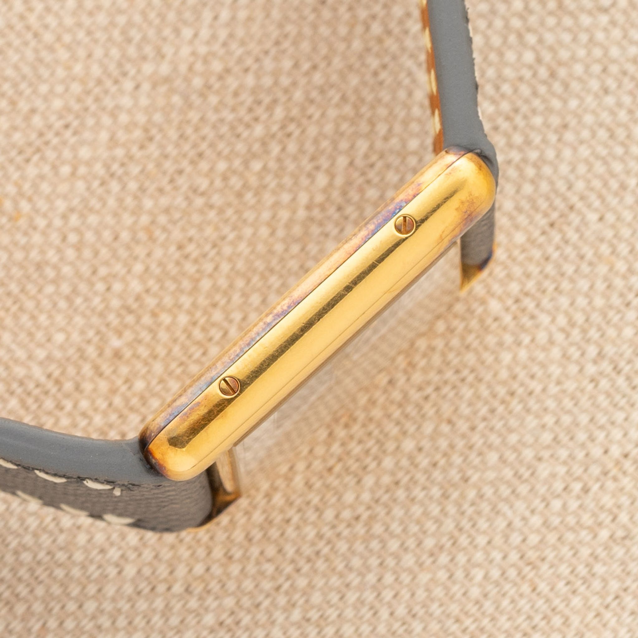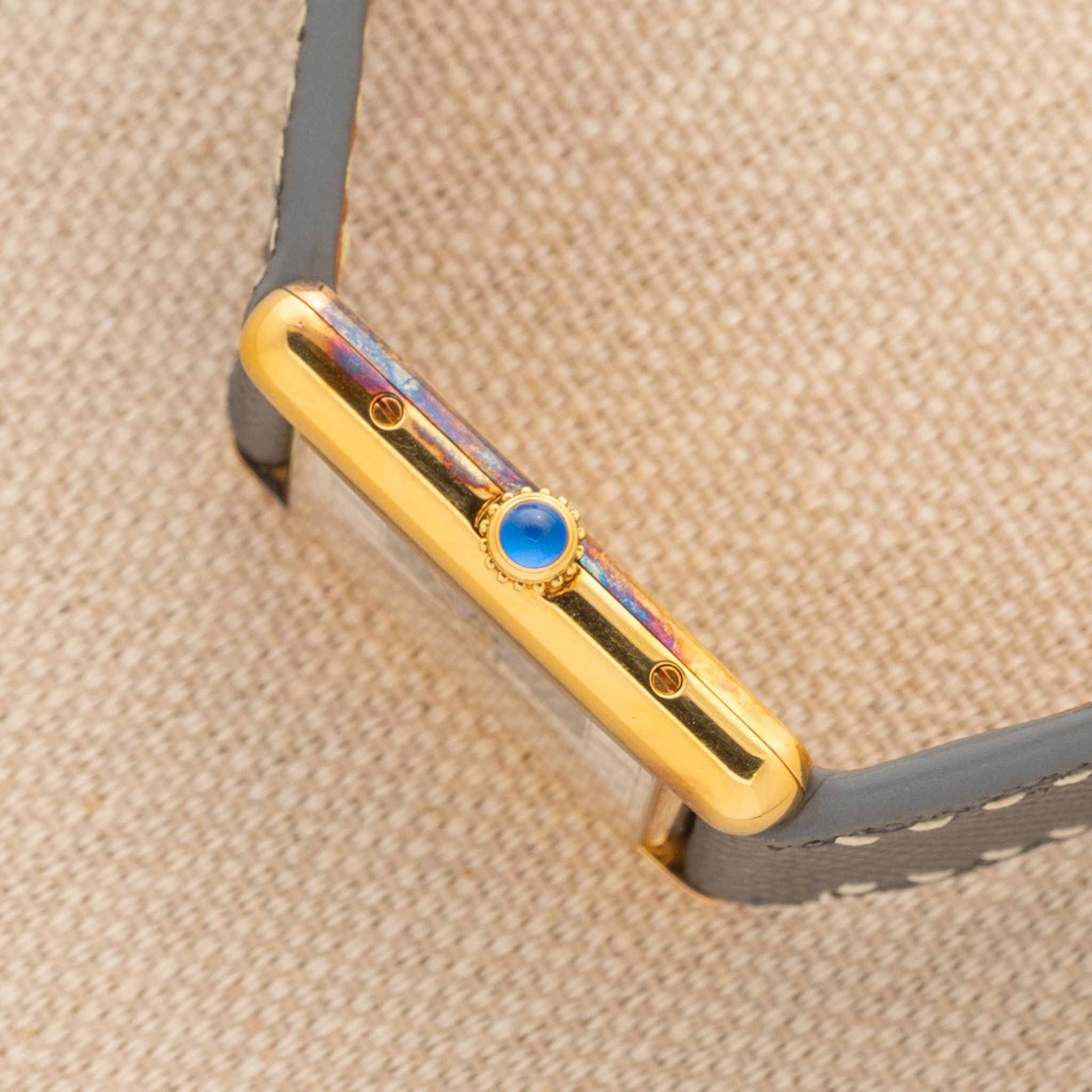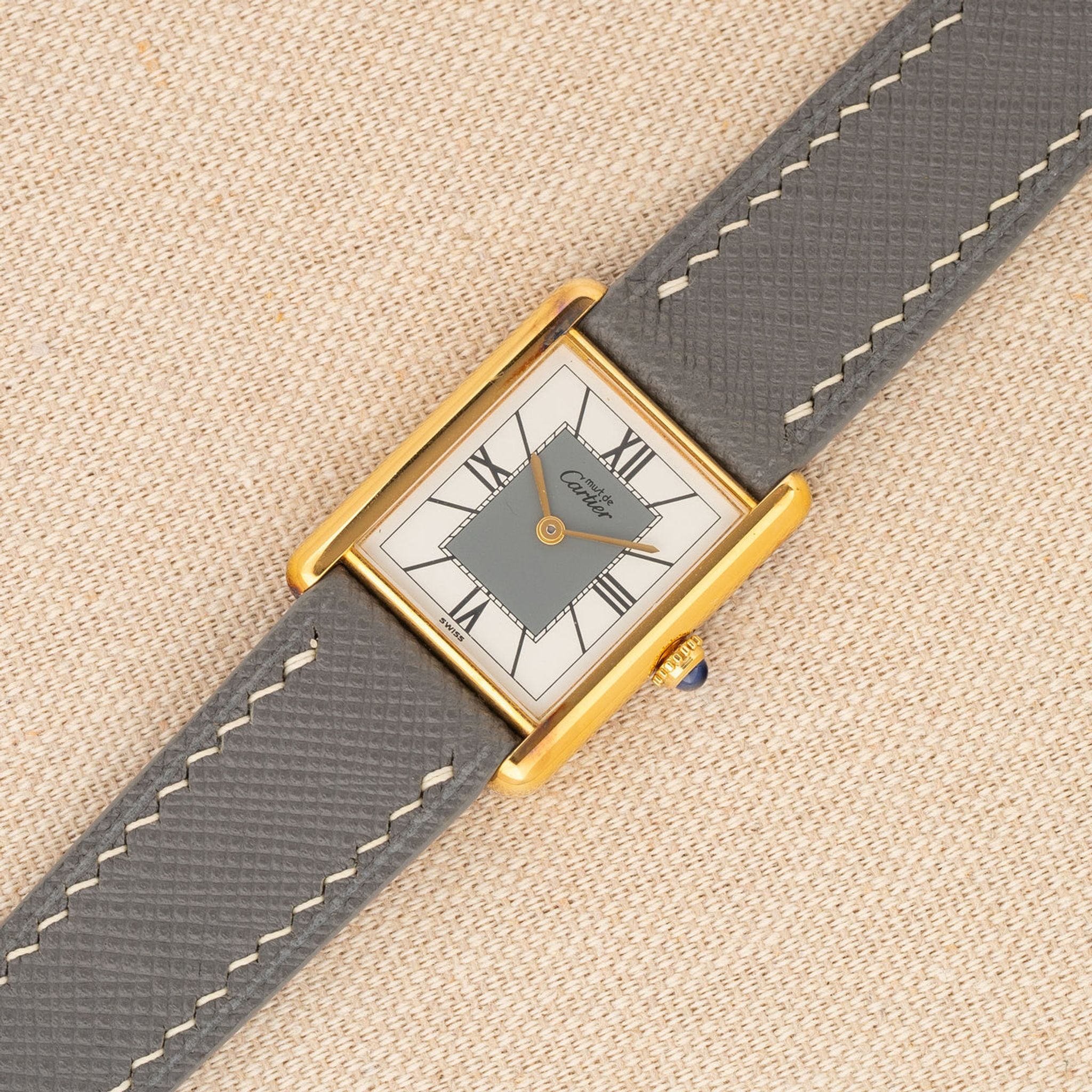 The Must De Cartier line was brought to market in the 1970s as a more accessible price point. This was done with the use of electroplating cases vs using solid gold as well as by leveraging quartz movements for the most part, however, some pieces were also produced with mechanical movements. This particular quartz piece features a rare dial variant with beautiful grey/white motif and Roman numerals. We paired it with a perfectly matching leather strap with Cartier buckle and believe it makes for the perfect conversations piece for dress, casual or anything in between.