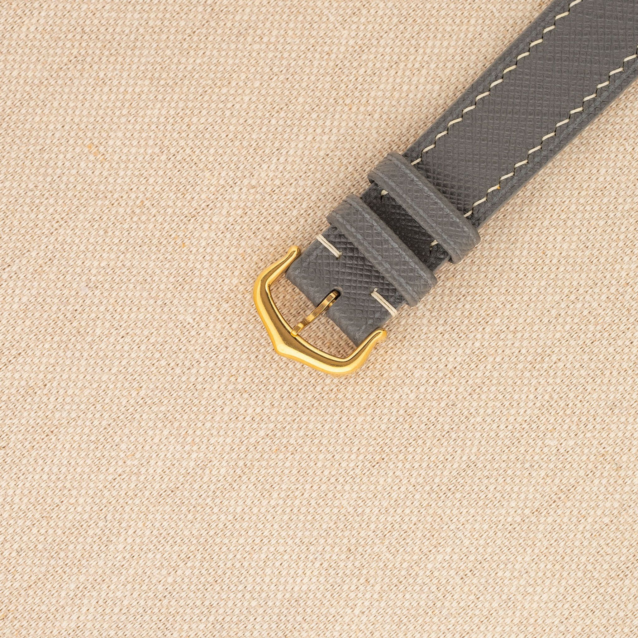 Bracelet: Two piece and supple pebbled leather strap in grey with plated Cartier buckle.