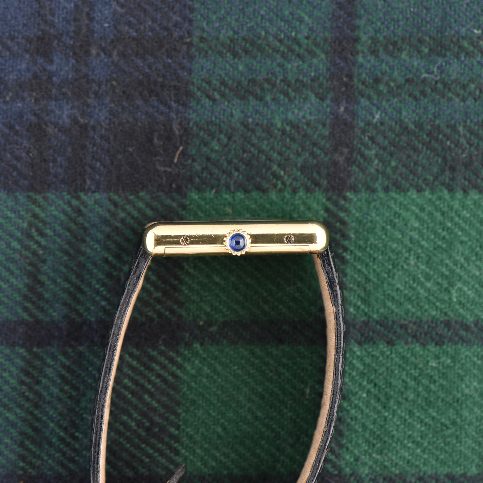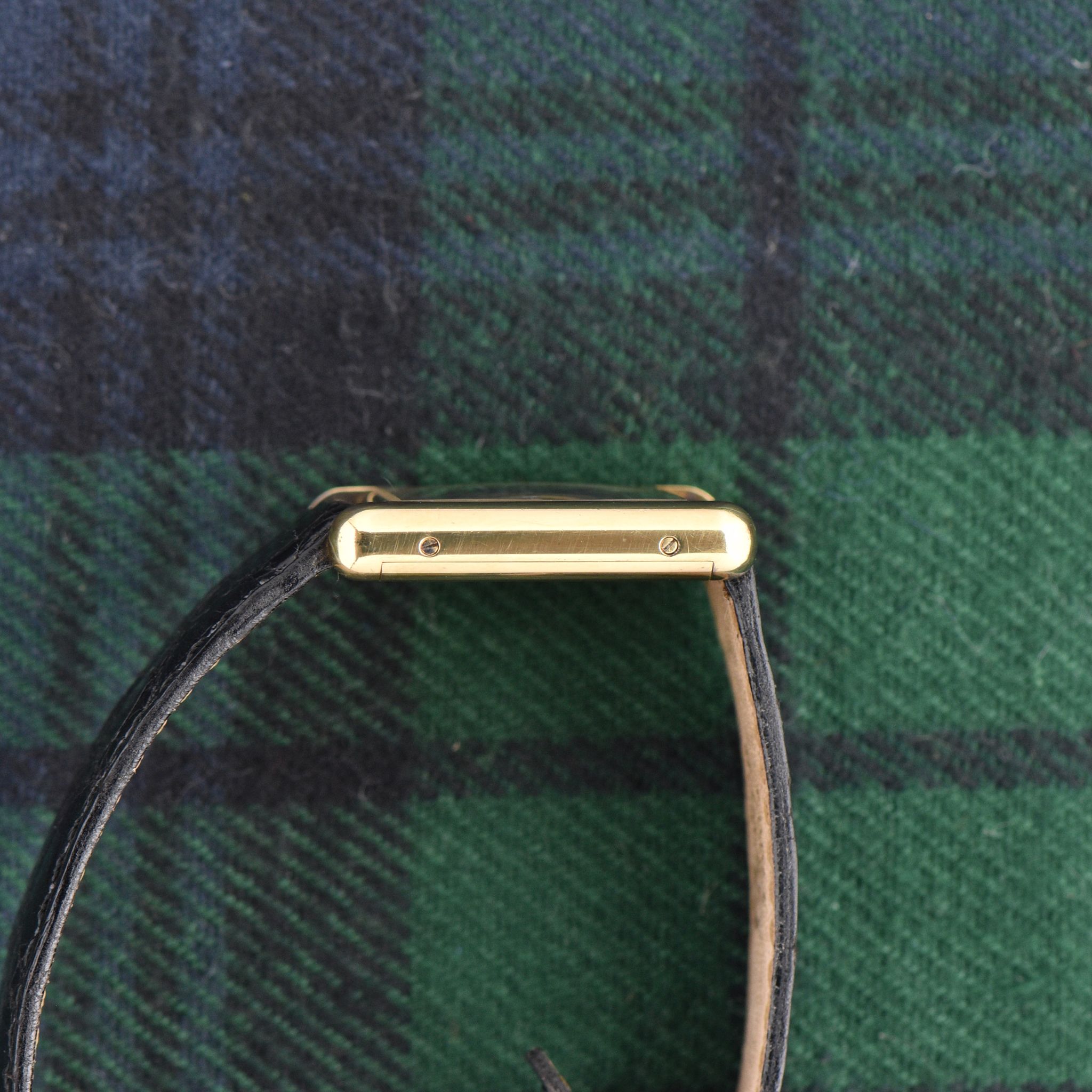Case: The large size Tank case is 23x30mm. The case is in fantastic condition. The gold plating is thick and even.