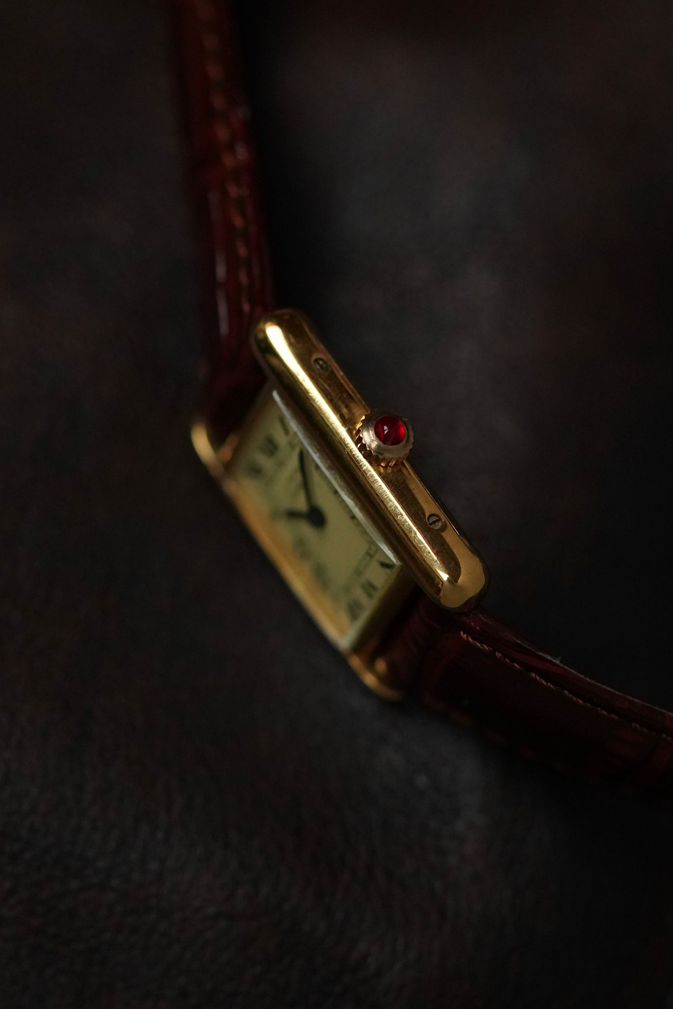 Must de Cartier 20x28 mechanical in lovely condition. Red ruby cabochon.
