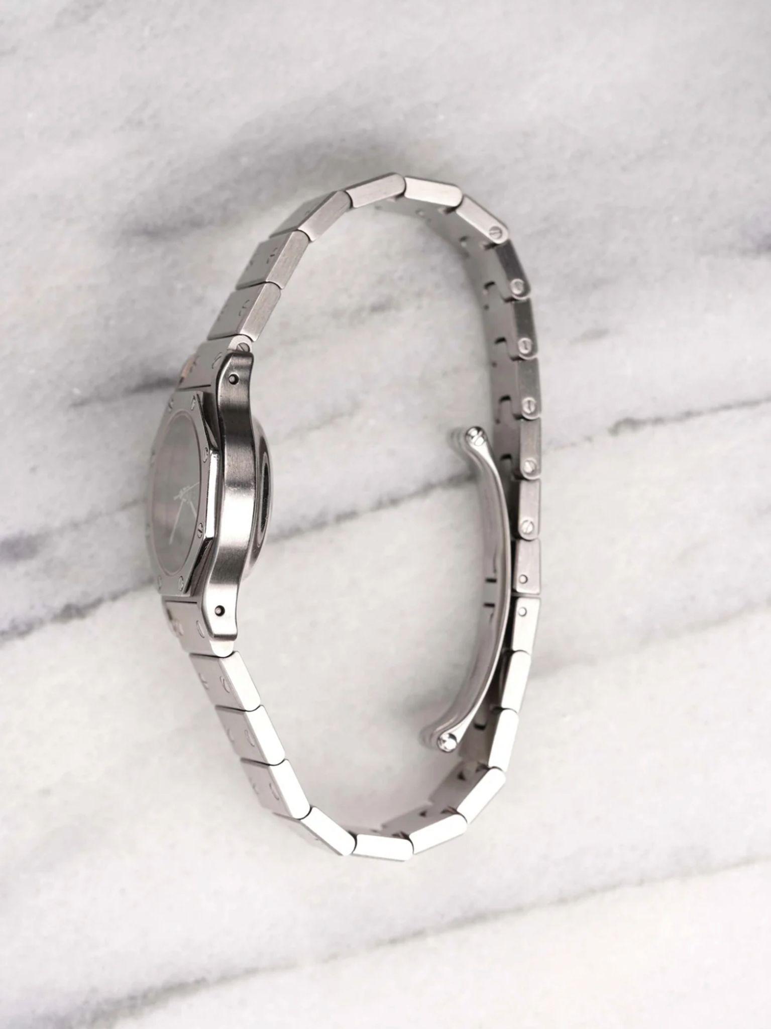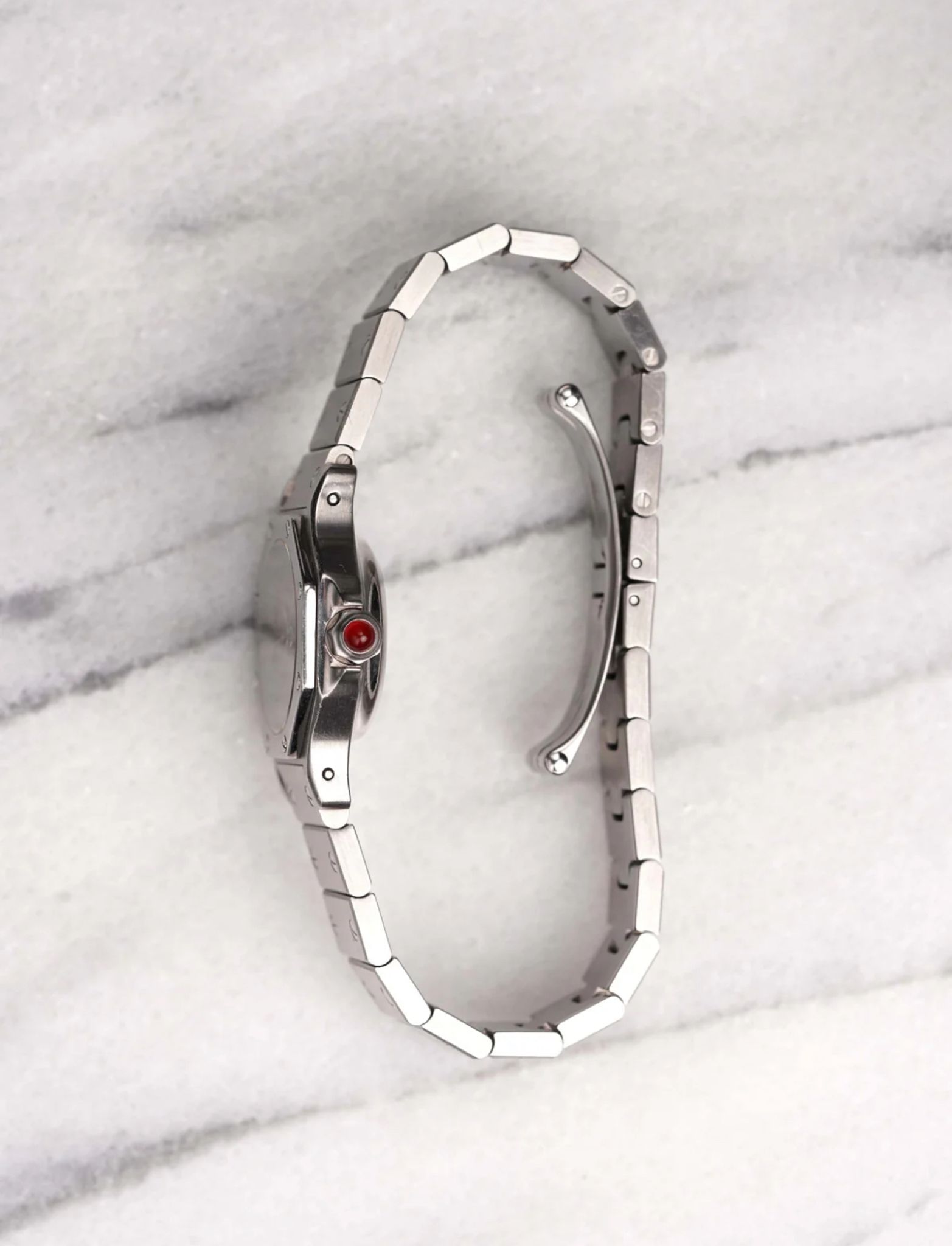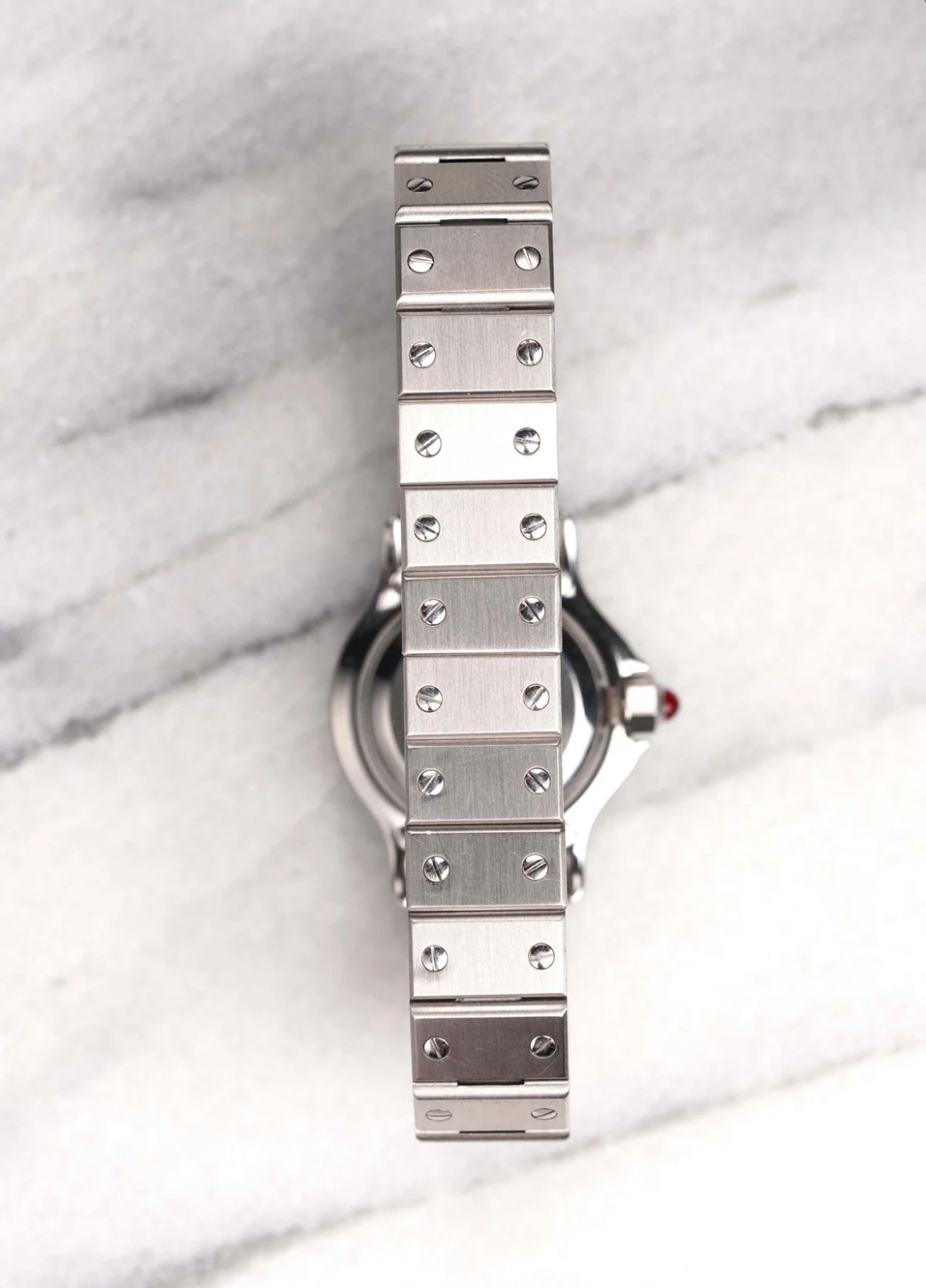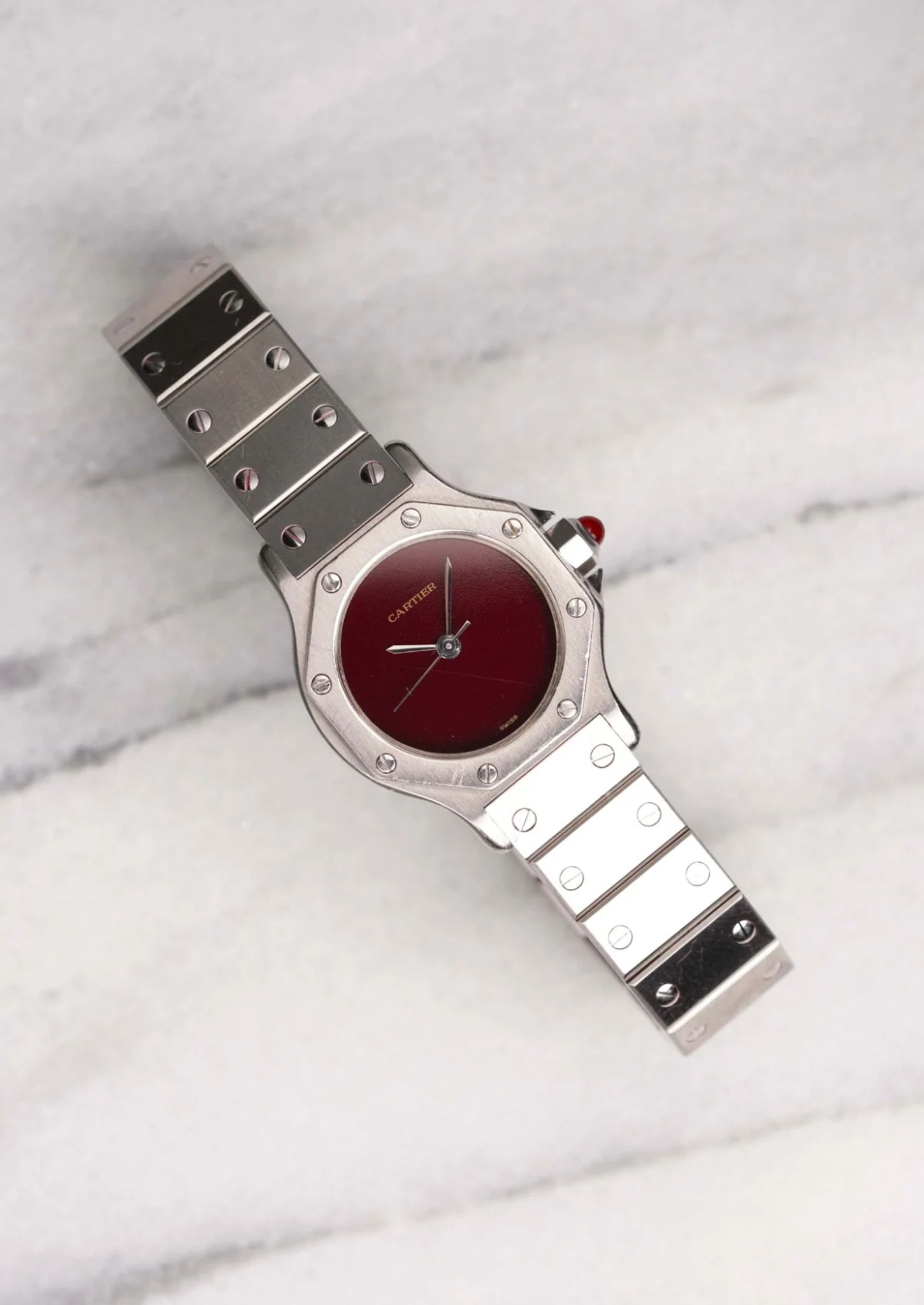 Here's a vintage Cartier steel automatic octagon with a rare burgundy dial from the late 80s, early 90s. Keeps great time and is fully functional. Measurements include a 24mm case size. Integrated bracelet with screws that fit up to a 6.75 inch wrist (butterfly clasp) Bracelet is in really great shape for its age. It's almost unworn and unpolished. Blue cabochon crown. Matching silver hands. Quickset date function at 3 a clock. Stainless steel case and caseback. Brushed finishing on the case and polished finishing on the bracelet. The bracelet and case shimmer, depending on the light. Getting difficult to find examples with these colors! Matching screws on the bezel and bracelet. A nice thin profile. All the parts are original including the crown, dial, movement, and caseback. Both the dial and case are in great cosmetic, untouched condition.