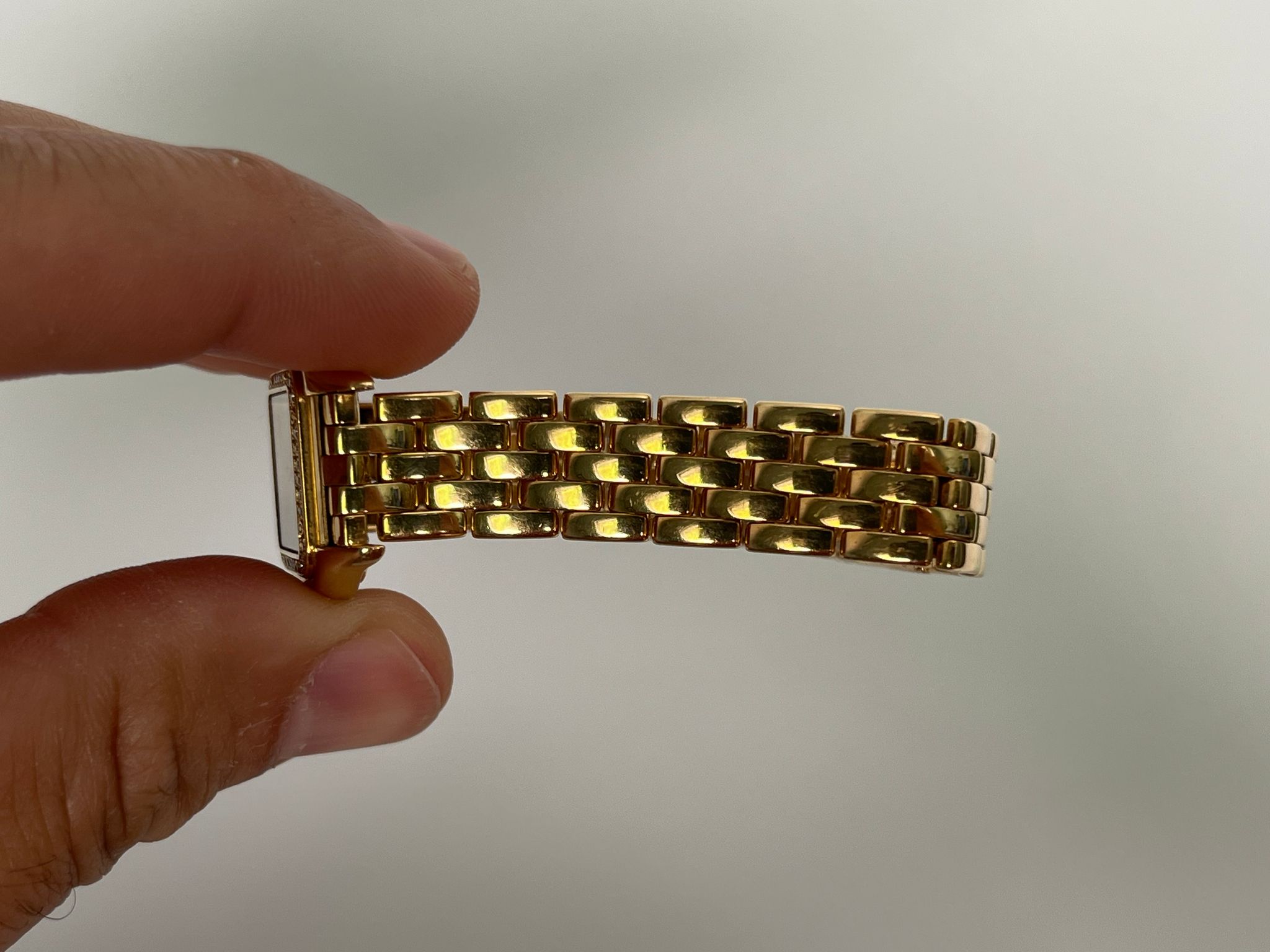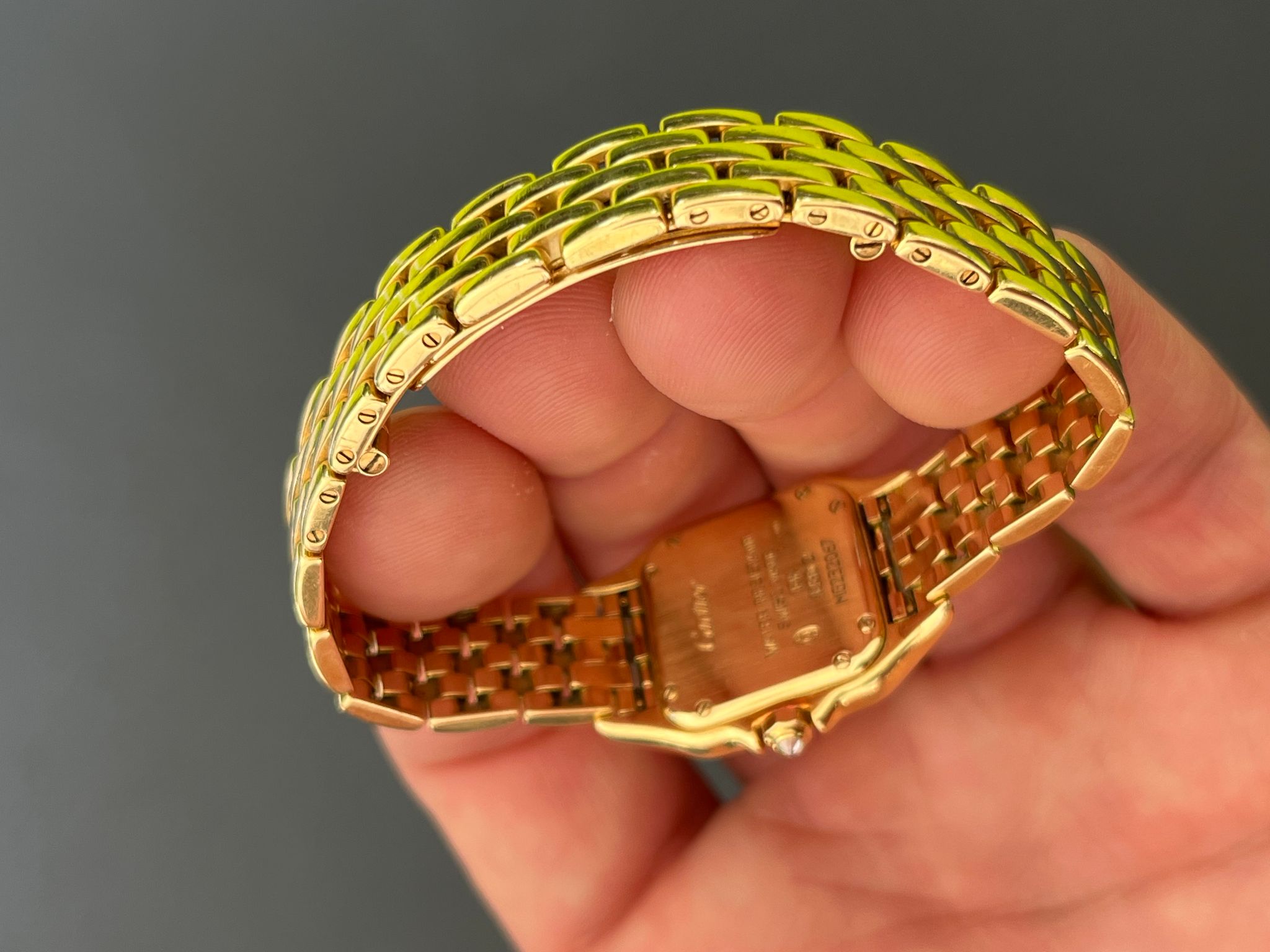 The Cartier Panthère Reference 1280 is an iconic symbol of elegance and luxury, capturing the essence of Cartier's timeless design philosophy. This exquisite timepiece features factory diamonds and a petite 22mm 18ct yellow gold case, embodying a refined and delicate aesthetic. The square white dial is accented by bold Roman numerals and blued steel hands, a signature of Cartier's classic style. Powered by a reliable quartz movement, the Panthère ensures precise and hassle-free timekeeping. The 18ct yellow gold link bracelet, known for its supple and flexible design, provides exceptional comfort and seamlessly complements the case. The Cartier Panthère Reference 1280 is a true masterpiece of horological artistry, perfect for those who appreciate the blend of traditional elegance and contemporary sophistication in a luxury watch.