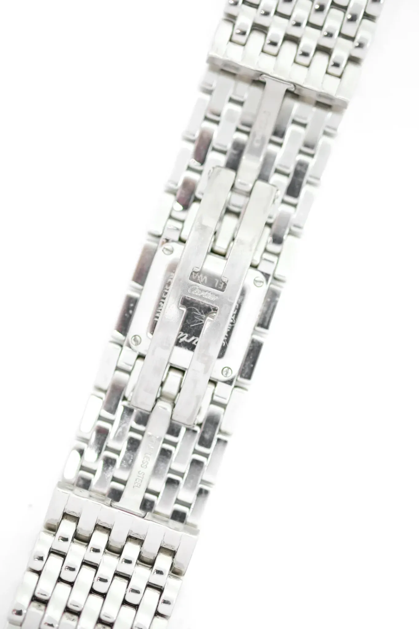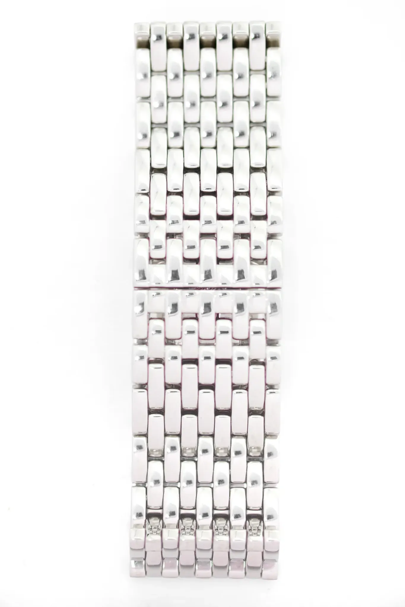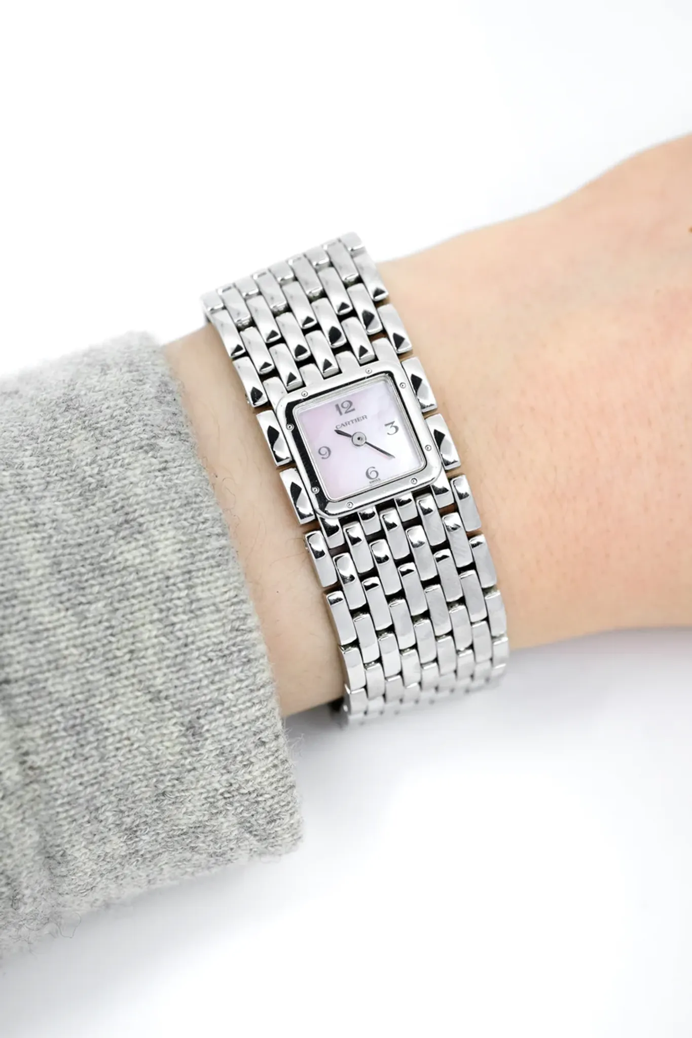 The watch strap, all in steel, of course takes up the emblematic motif of the more classic Panthère composed of 5 rows but this time wider. This watch passes itself off as a cuff, the pink mother-of-pearl dial being integrated into the strap. All these elements underline its jewelery anchoring. The invisible clasp, the absence of a crown (the time is set by a press stud on the back of the dial) and the contained size of the dial allow the harmony of the cuff to be perfectly preserved.