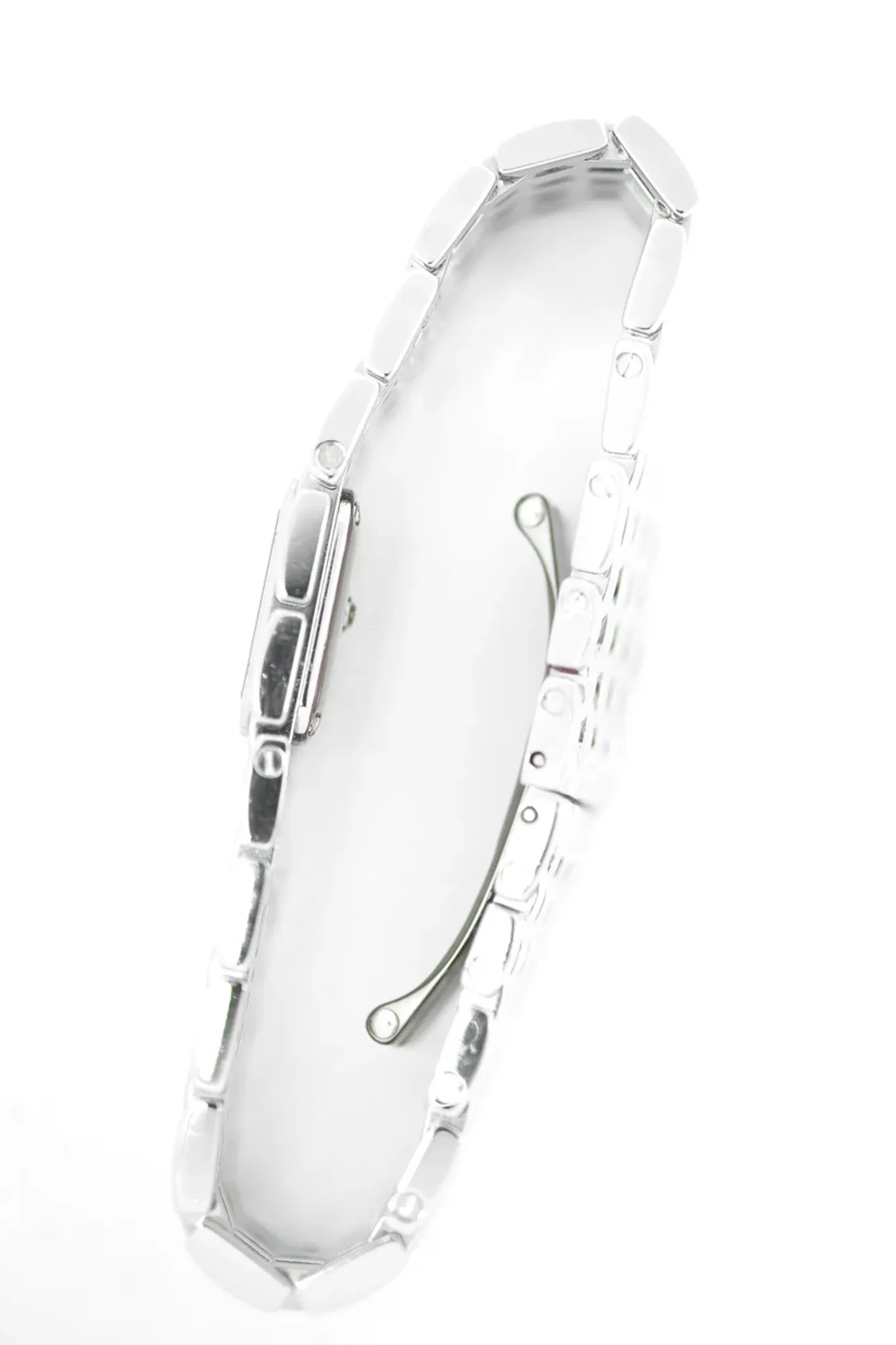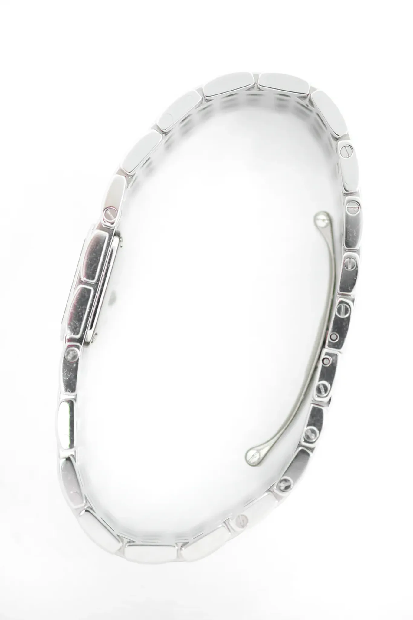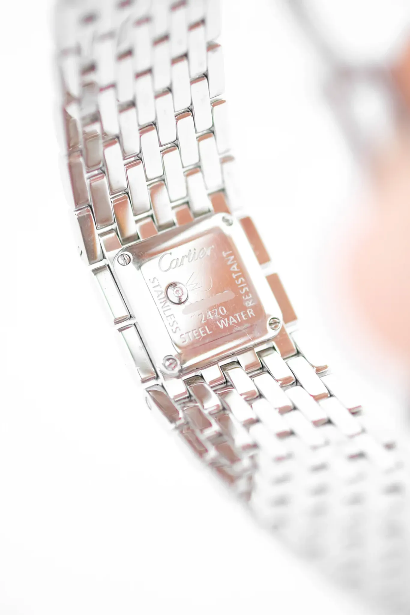 The watch strap, all in steel, of course takes up the emblematic motif of the more classic Panthère composed of 5 rows but this time wider. This watch passes itself off as a cuff, the pink mother-of-pearl dial being integrated into the strap. All these elements underline its jewelery anchoring. The invisible clasp, the absence of a crown (the time is set by a press stud on the back of the dial) and the contained size of the dial allow the harmony of the cuff to be perfectly preserved.