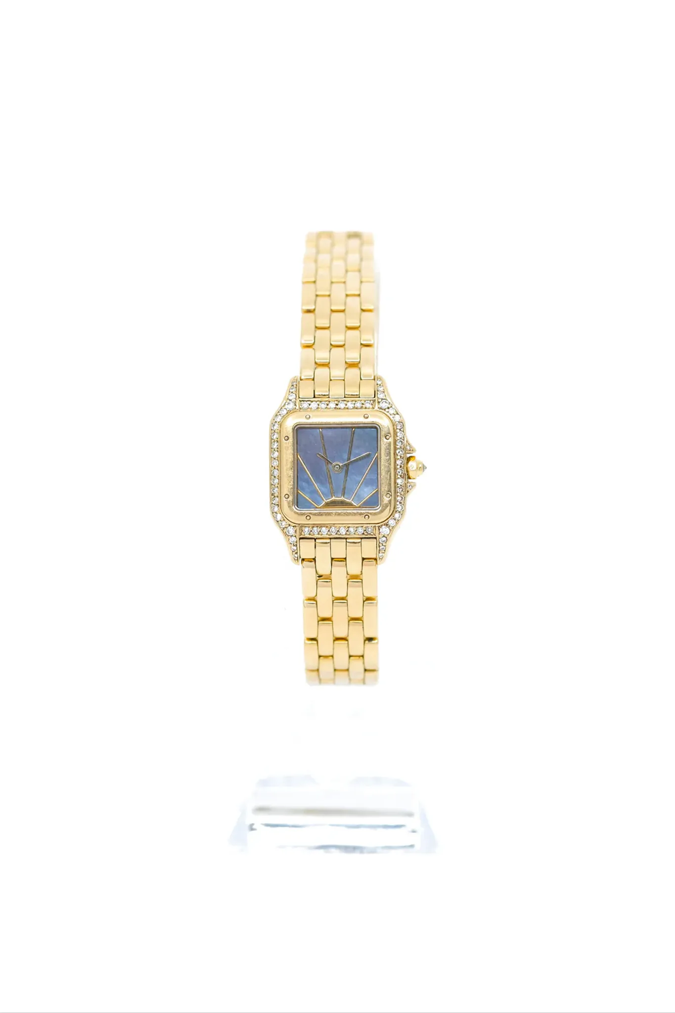 This version is far from resembling its sisters. A rather unique model. This all-yellow gold Cartier Panthère takes its name from its dial which takes up the motif of a sunrise. Rays of gold embellish a blue mother-of-pearl dial, the whole being set with diamonds.