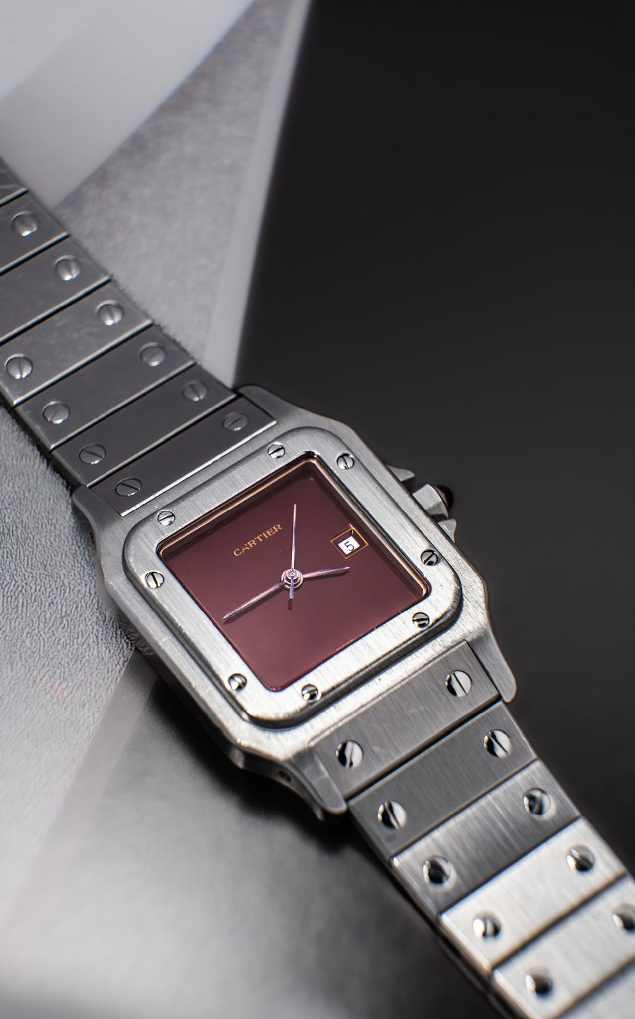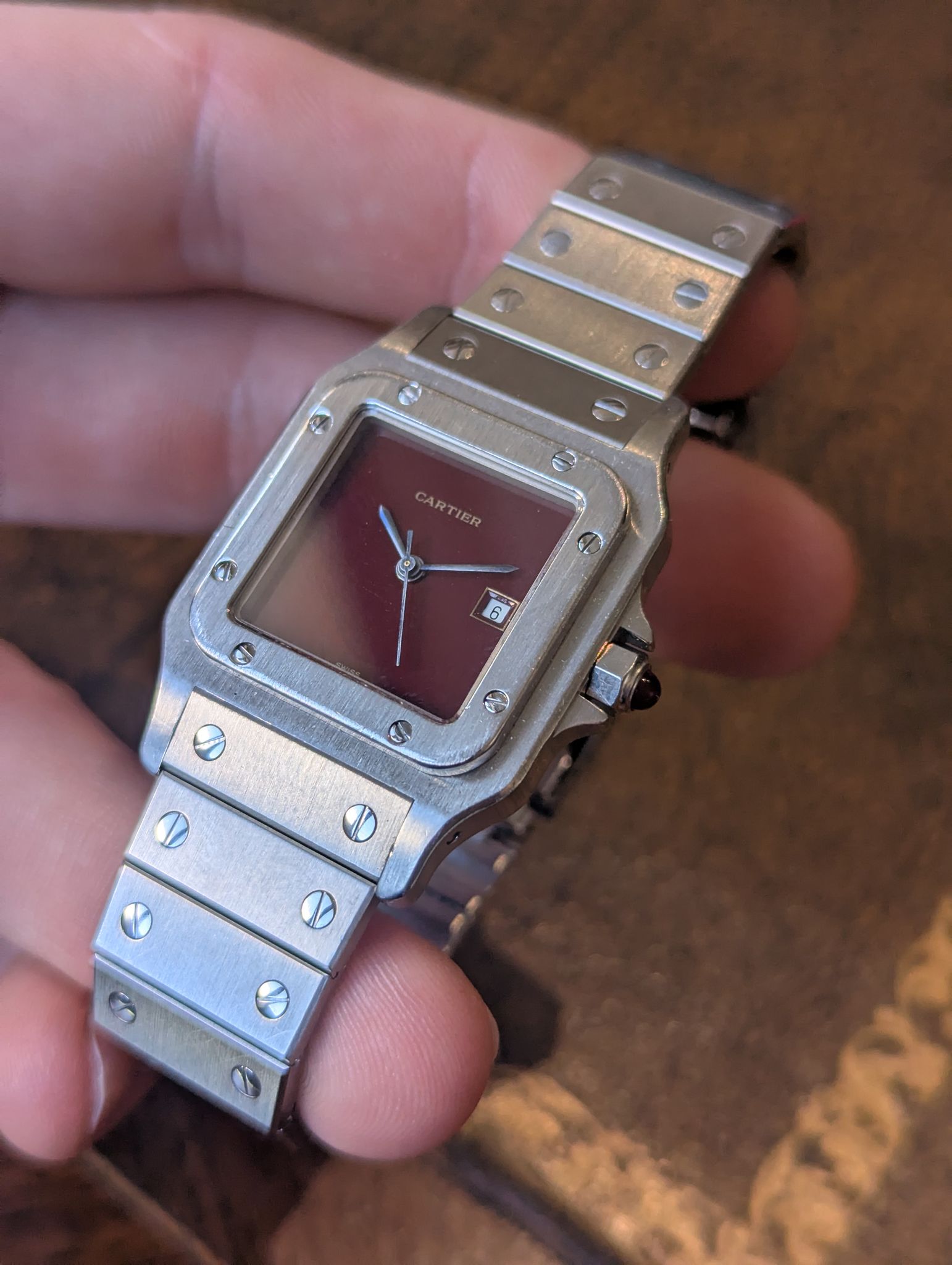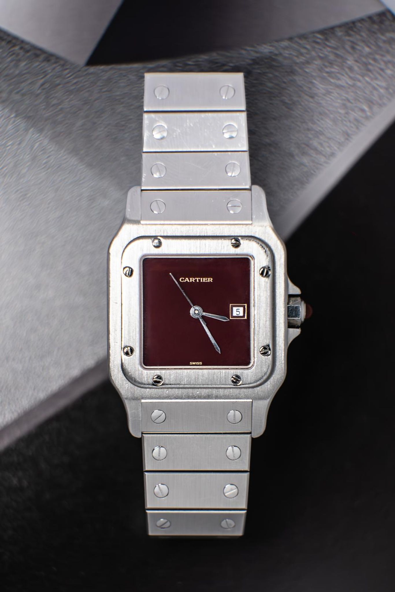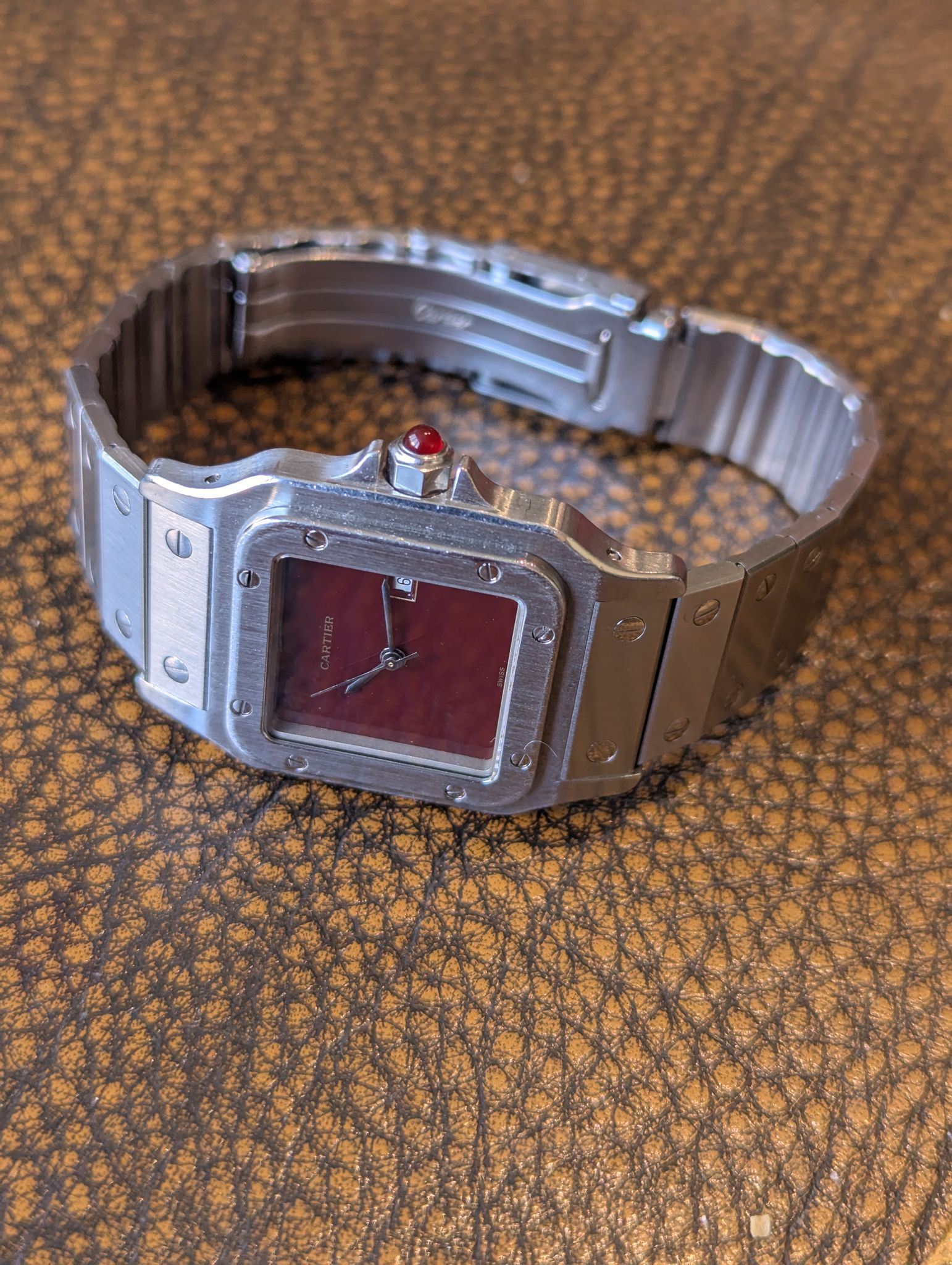 You are looking at a beautiful all steel Santos ref. 2960 with a striking Swiss only burgundy dial. Probably the nicest version of the vintage automatic Santos to get, this one is in great condition.