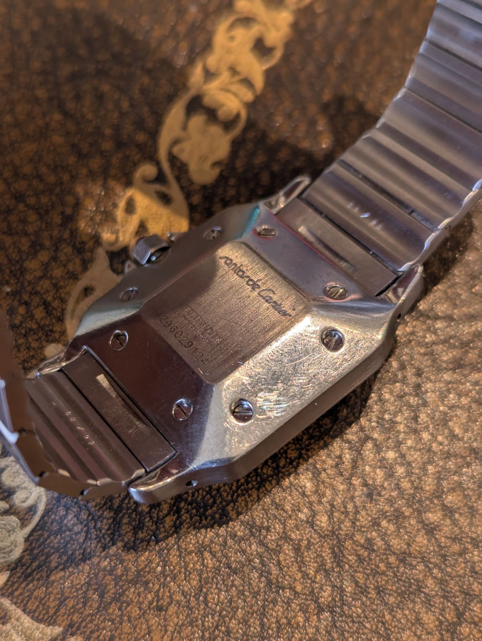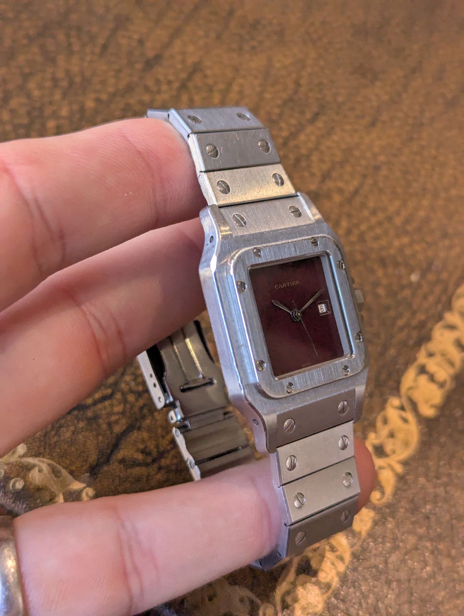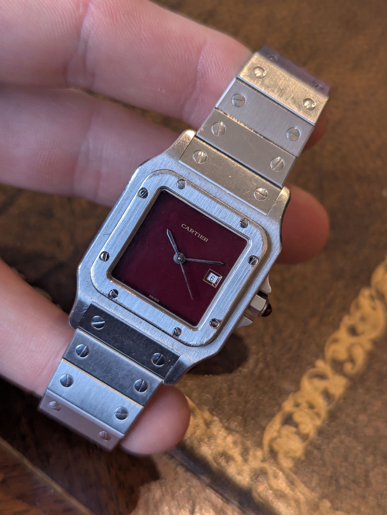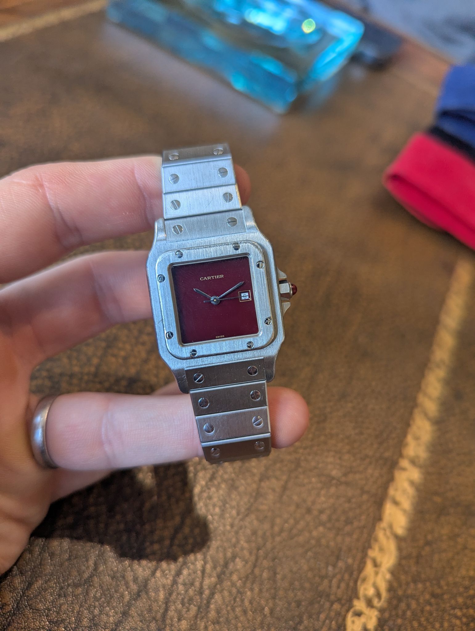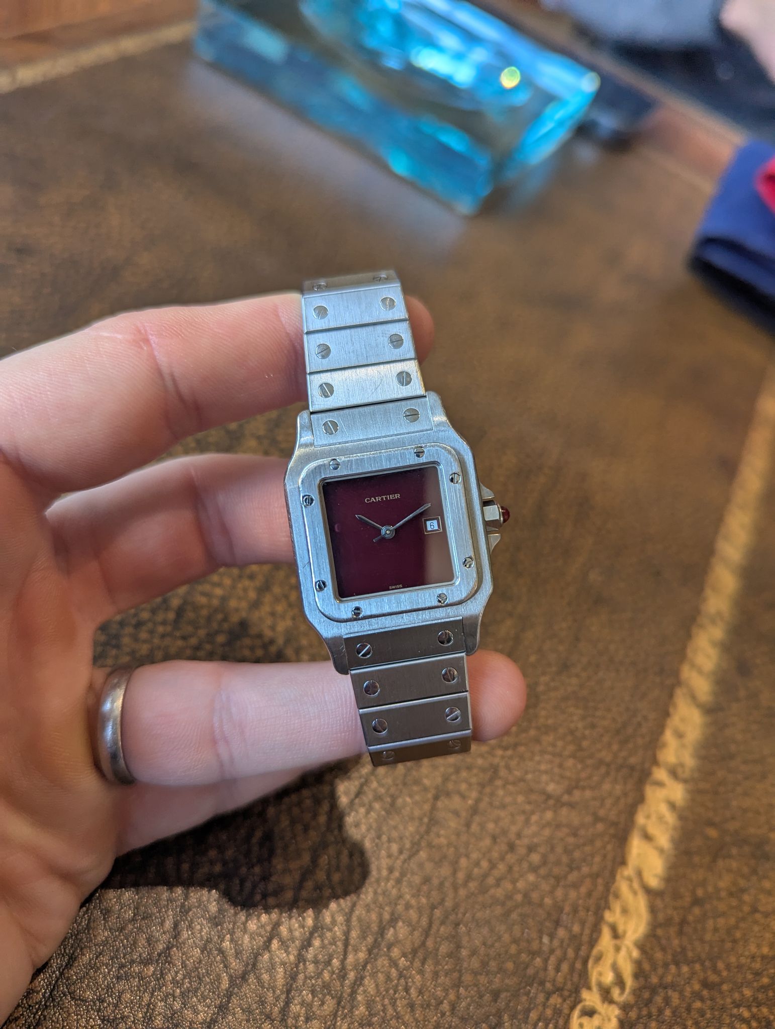 You are looking at a beautiful all steel Santos ref. 2960 with a striking Swiss only burgundy dial. Probably the nicest version of the vintage automatic Santos to get, this one is in great condition.