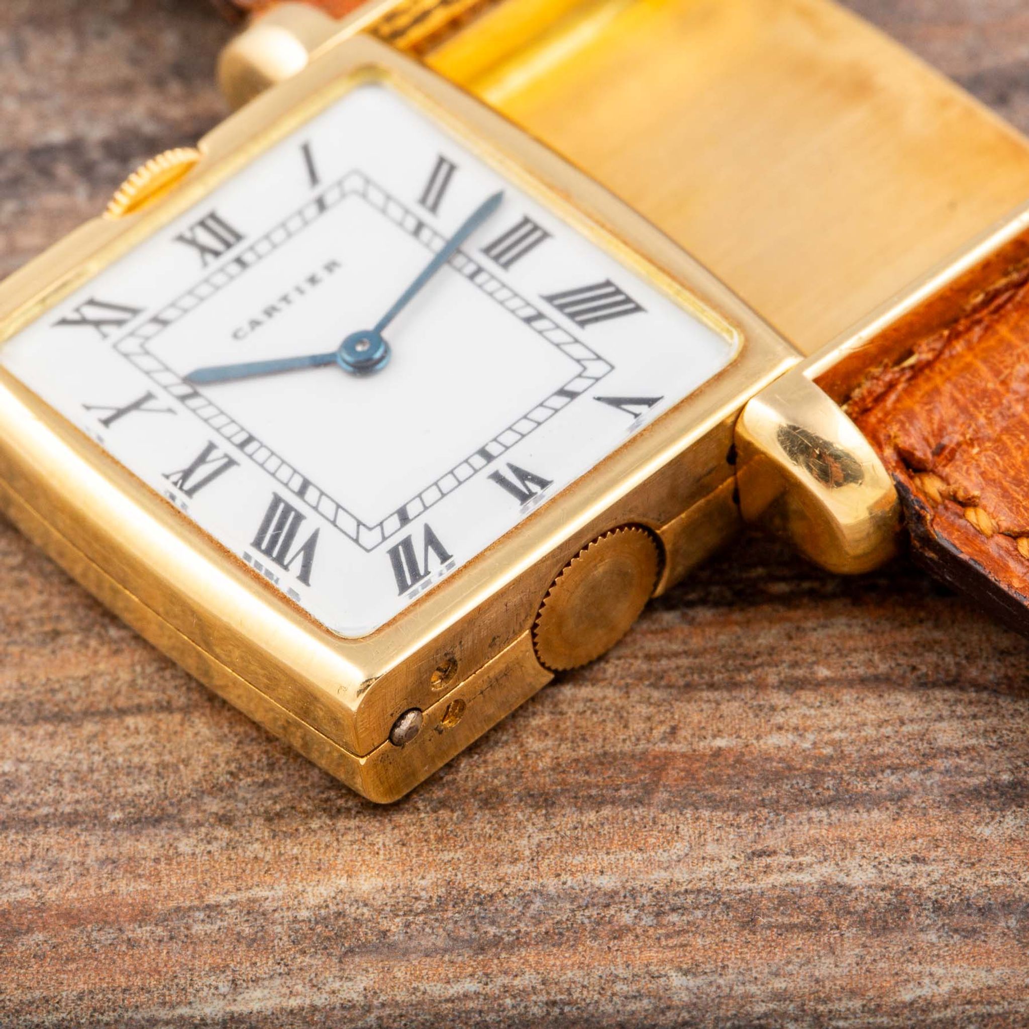 he Cartier Tank Reverso presented here holds particular fascination. It features a Paris dial, clearly establishing its association with Cartier Paris—a fact that gains further authentication through the presence of French hallmarks on the caseback. The desirability and collectibility of this Cartier Reverso are heightened by its unique characteristics. Notably, it boasts two distinct dials, each powered by separate calibers, affording the watch the ability to indicate two different time zones. What sets it apart even more is the crown attached to the case, differing from the traditional and more common cabochon-operated mechanism found in other Cartier Reverso models.