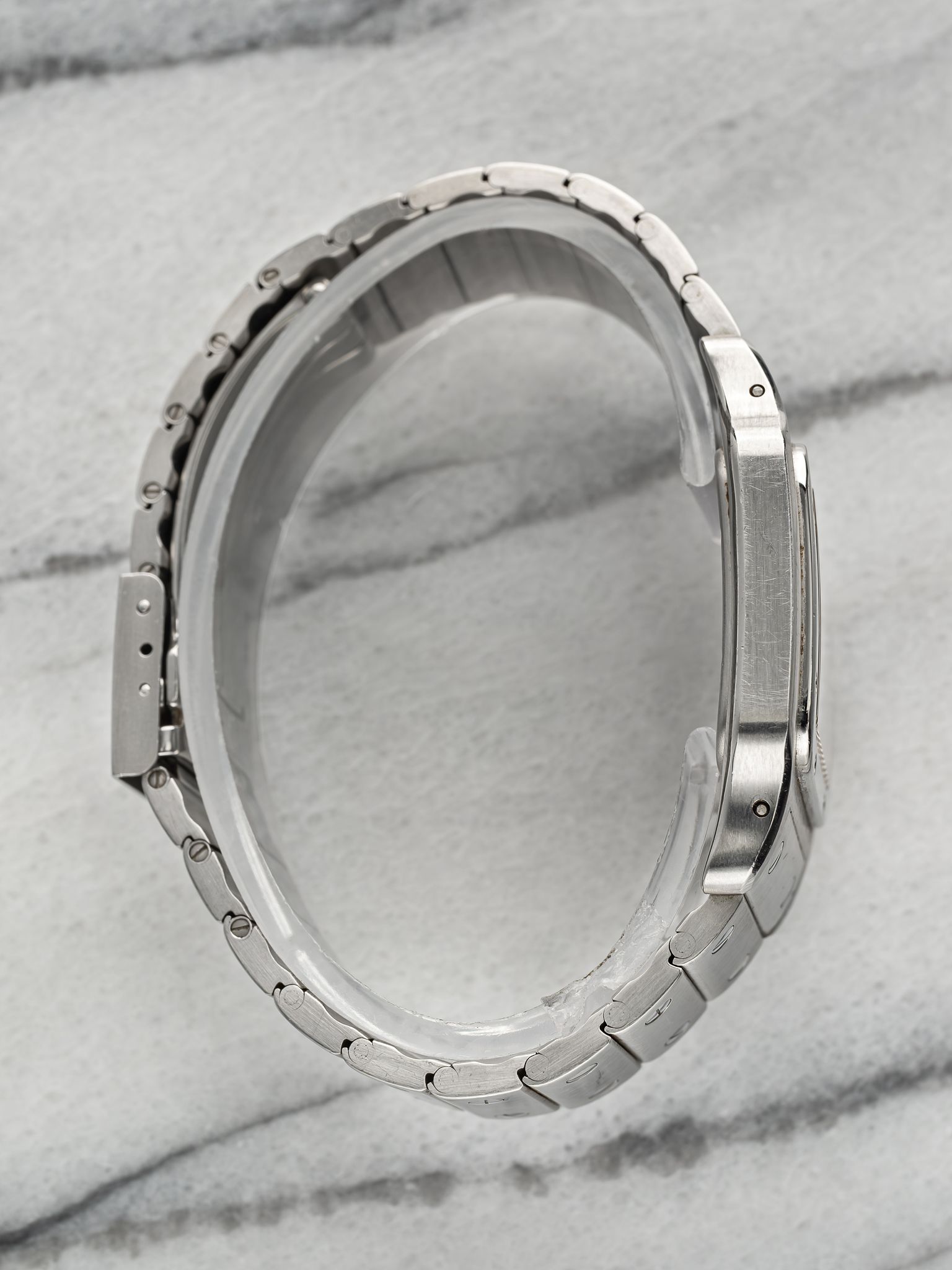 Here's a vintage Cartier Santos Galbee reference 1564 quartz with a cream blue Roman numeral dial from the late 80s, early 90s. Keeps great time and is fully functional. Measurements include a 29x41mm square case size and 18mm lug width. Integrated bracelet with screws that fit up to a 6.75 inch wrist. Blue cabochon crown. White dial with matching blue hands and roman numerals. Quickset date function at 6 a clock. Both the dial and crystal are free from any scratches or marks. Stainless steel case and caseback. There is a two tone link on the bracelet as seen in photos. Makes for a great watch for both men and women. All the parts are original including the crown, dial, movement, and caseback. Both the dial and case are in great cosmetic, untouched condition.