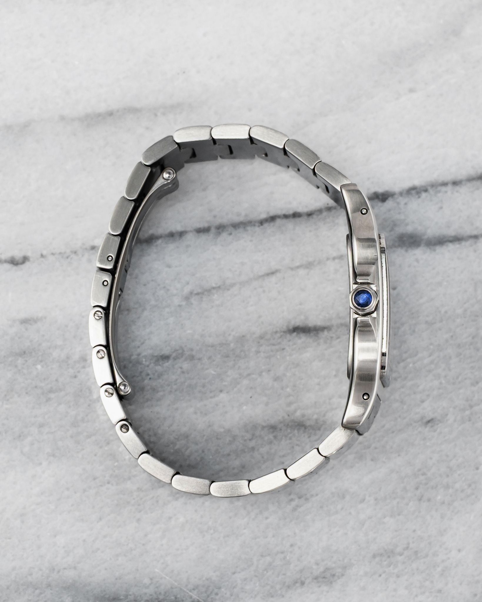 Here's a vintage Cartier Santos reference 1564 with a white dial in quartz from the 1980s. Measurements include a 29x41mm case and a butterfly clasp bracelet that fits up to a 6.75 inch wrist. Blue roman numeral dial. Blue cabochon crown. Ready to wear. All parts including the crown, dial, movement, and caseback are original