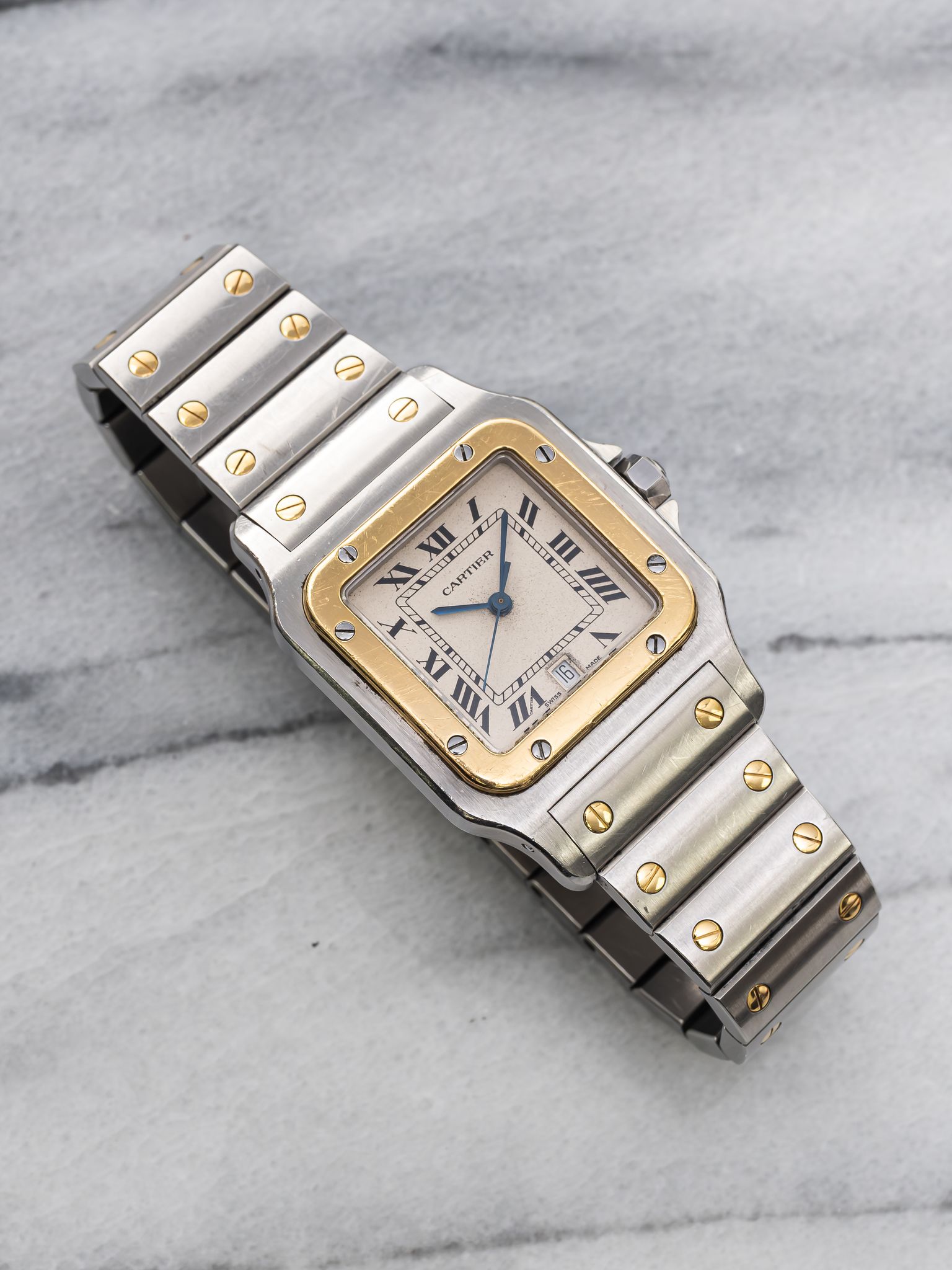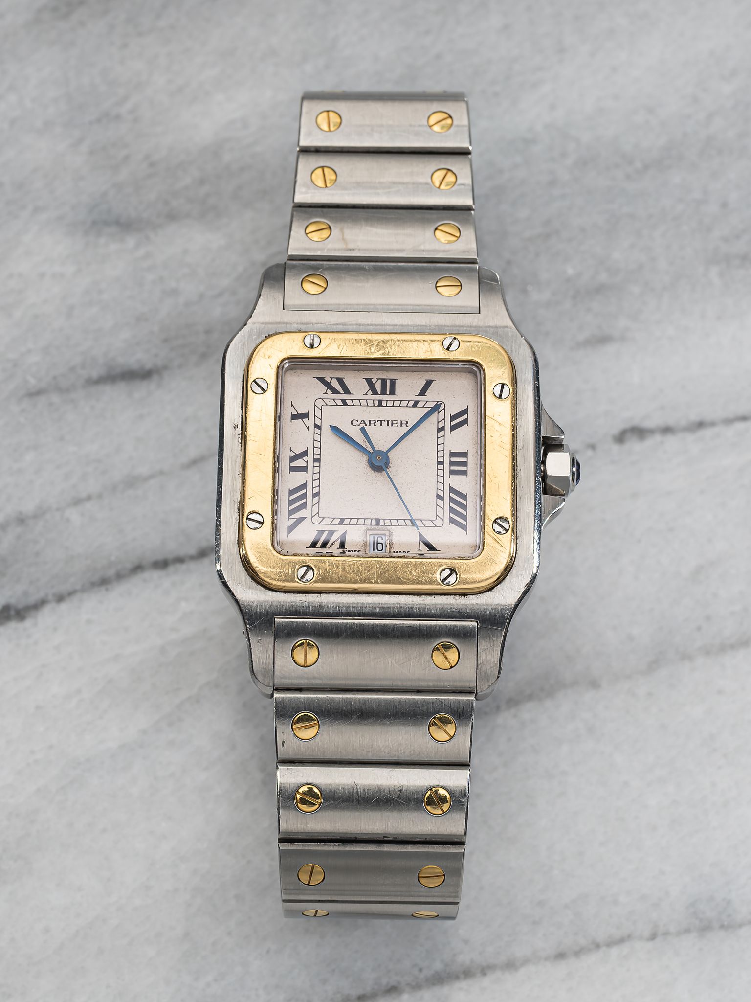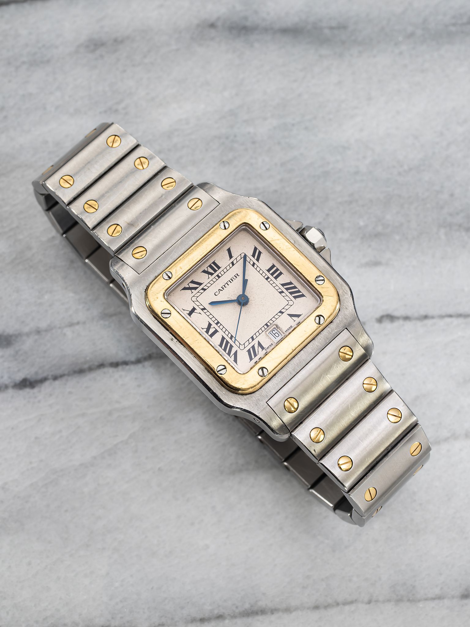 Here's a vintage Cartier Santos reference 2961 two tone quartz with a white Roman numeral dial from the 1980s. Measurements include a 29x41mm case and the bracelet fits up to a 7 inch wrist. All parts including the crown, dial, movement, and caseback are original.