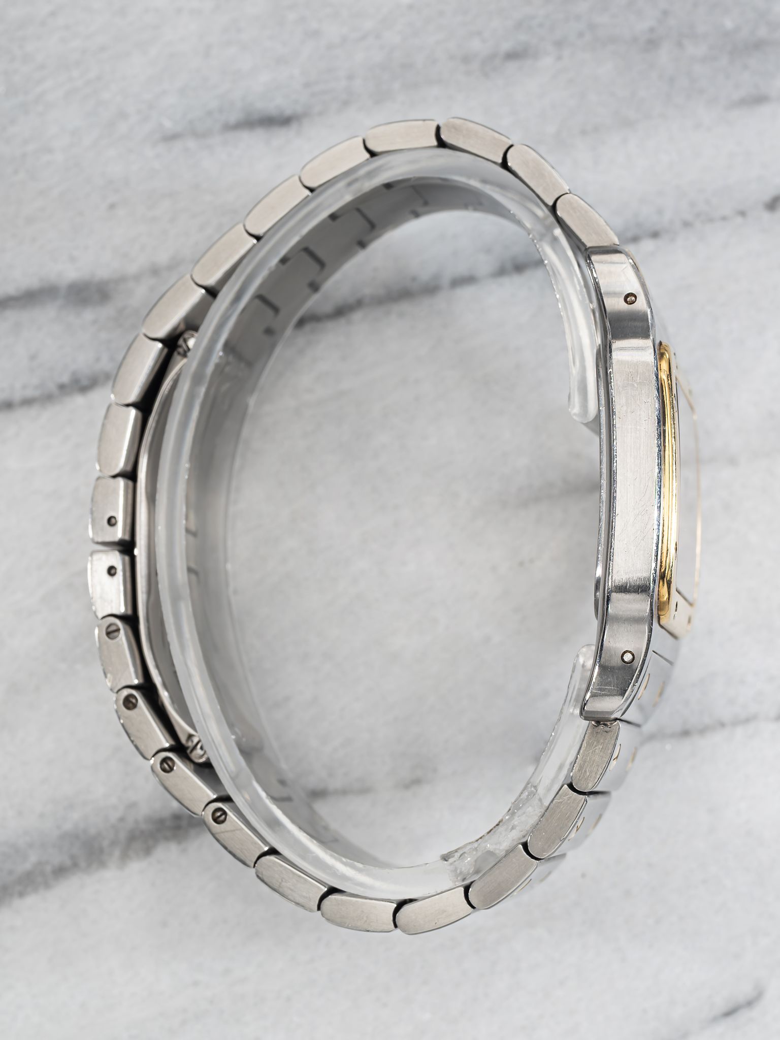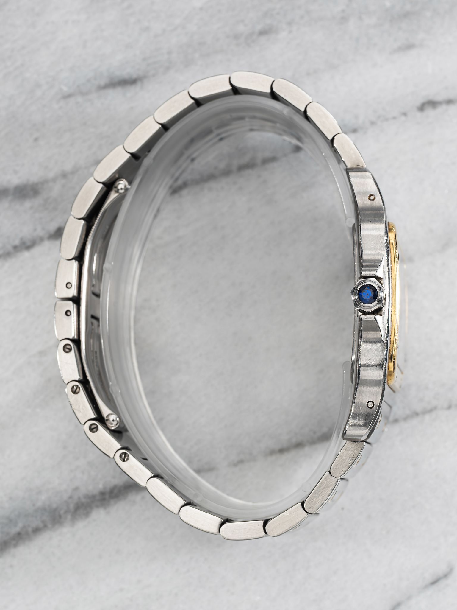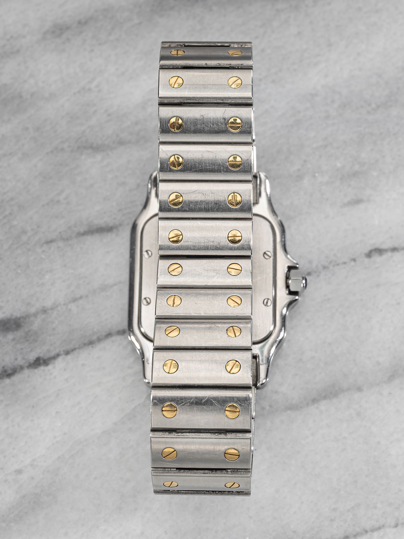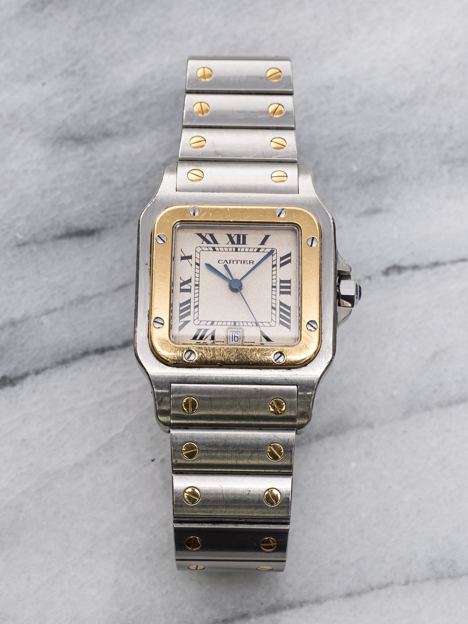Here's a vintage Cartier Santos reference 2961 two tone quartz with a white Roman numeral dial from the 1980s. Measurements include a 29x41mm case and the bracelet fits up to a 7 inch wrist. All parts including the crown, dial, movement, and caseback are original.