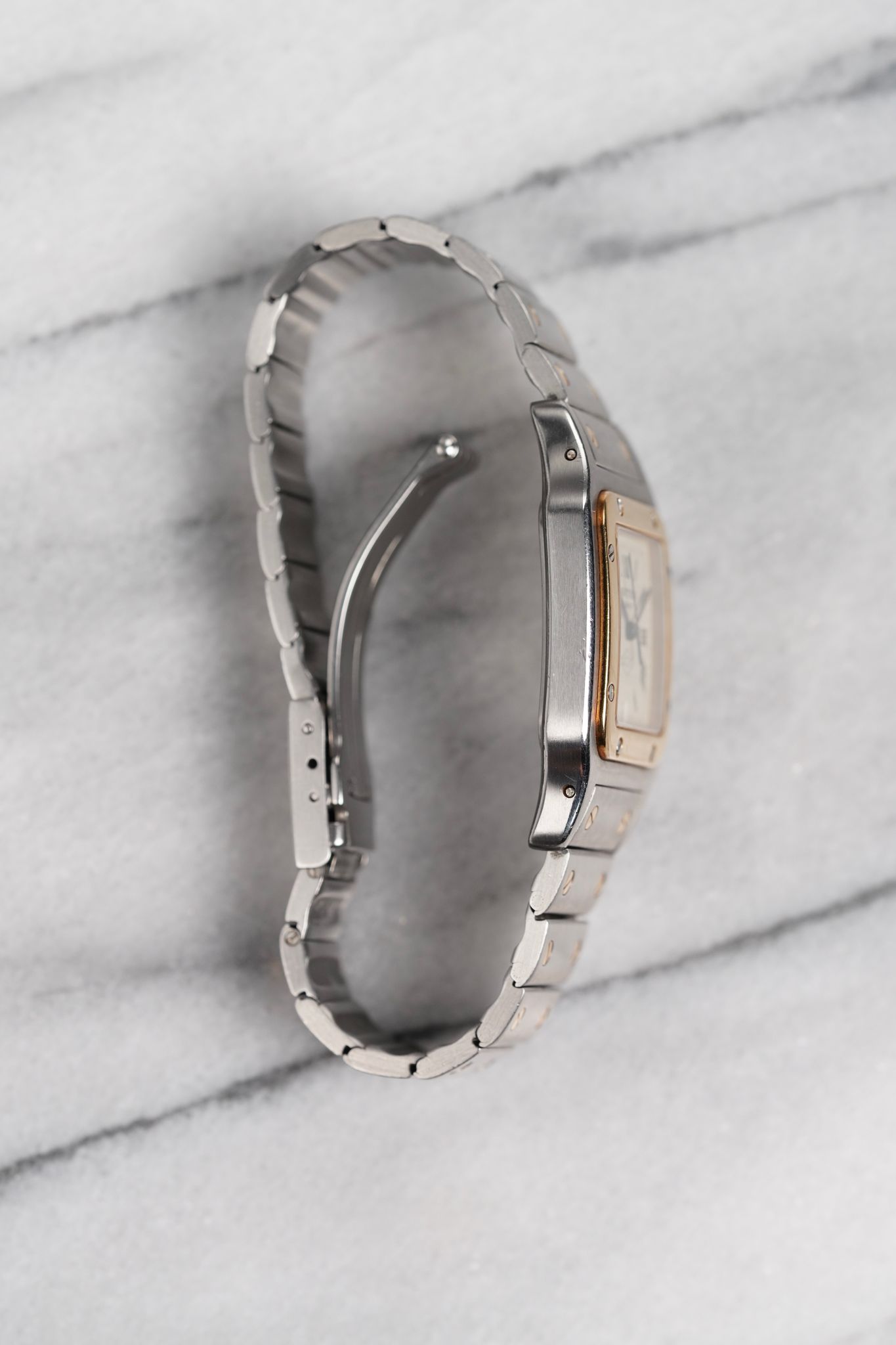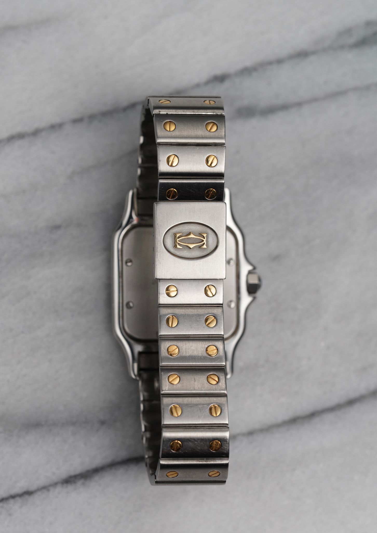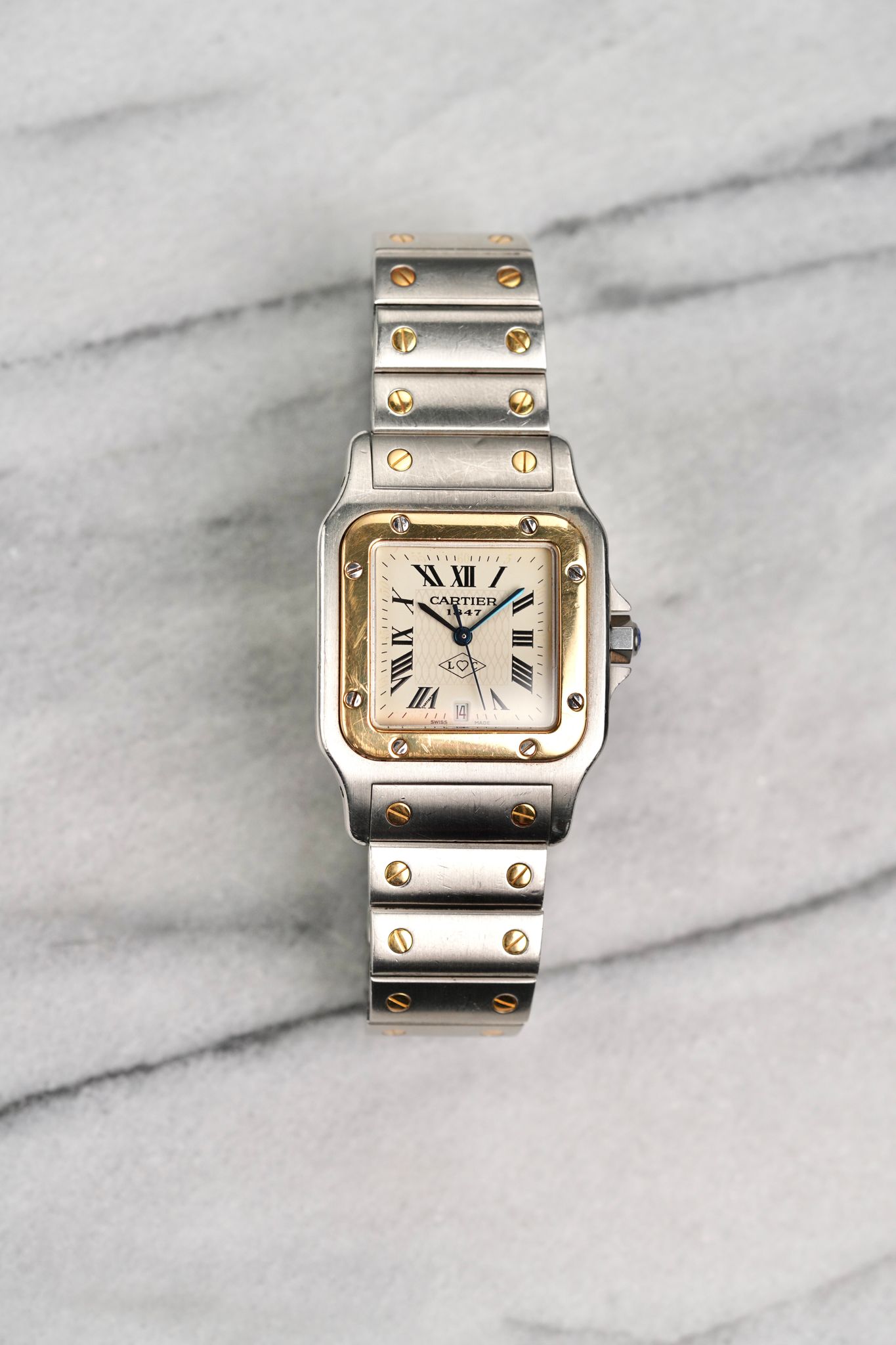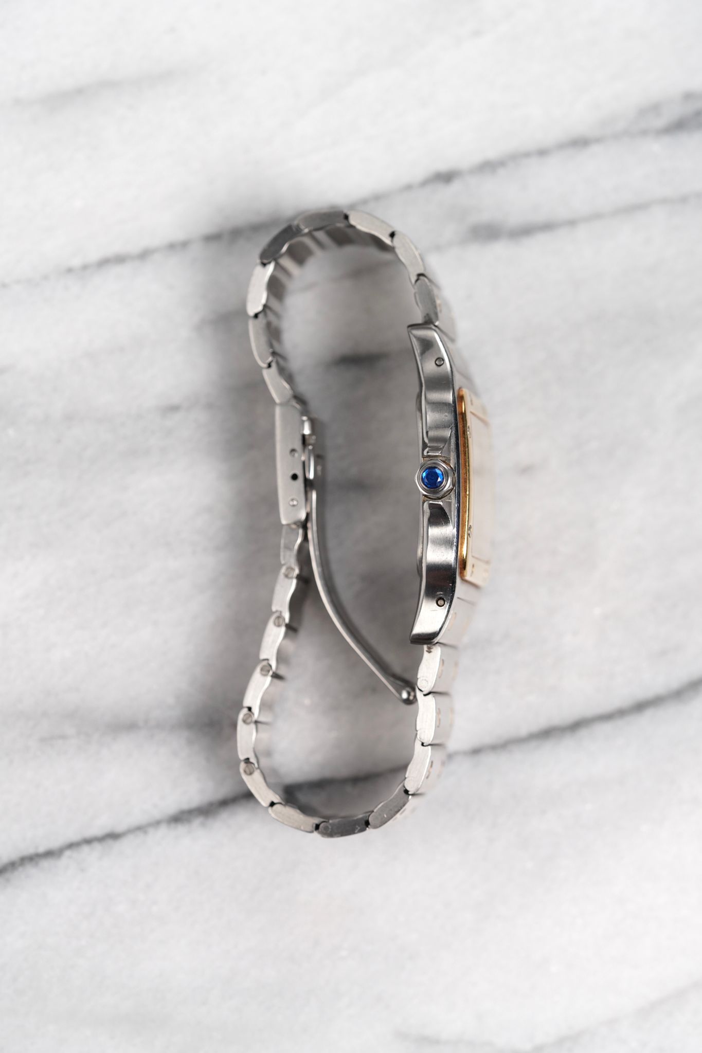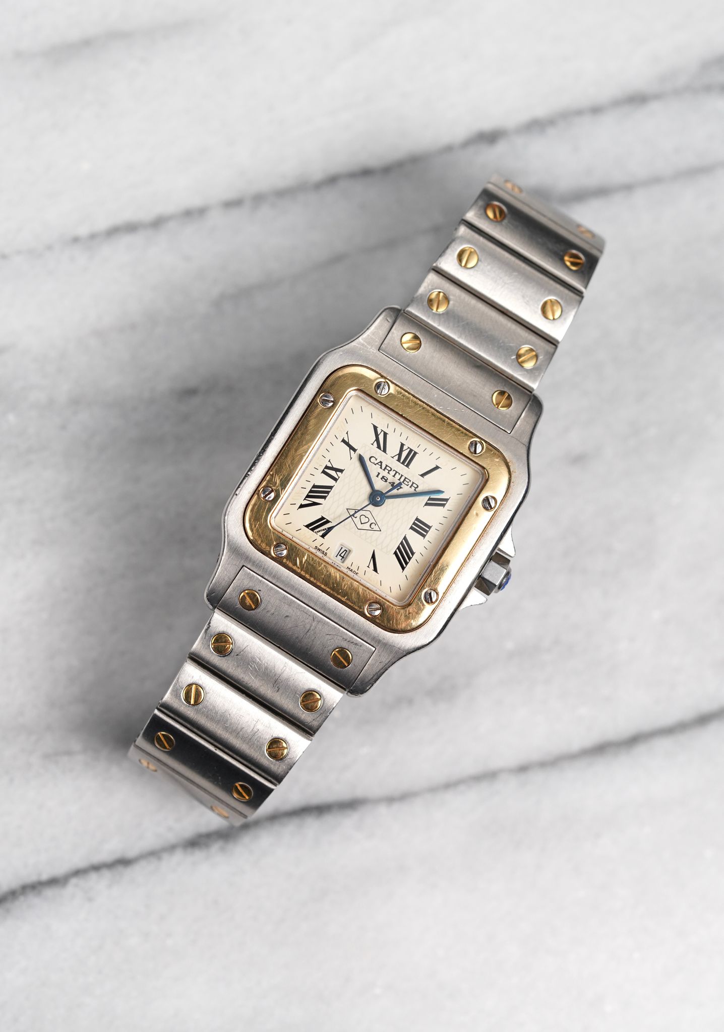 Here’s a Cartier Santos reference 1566 quartz two tone quartz cream roman numeral dial from the 1980s. Measurements include a 29x41mm case and bracelet fits up to a 7 inch wrist. Limited edition "I love you" stamp at 6 a clock. Fitted on its original two-tone bracelet. Original case, dial, and movement. Fully functional and keeping time.