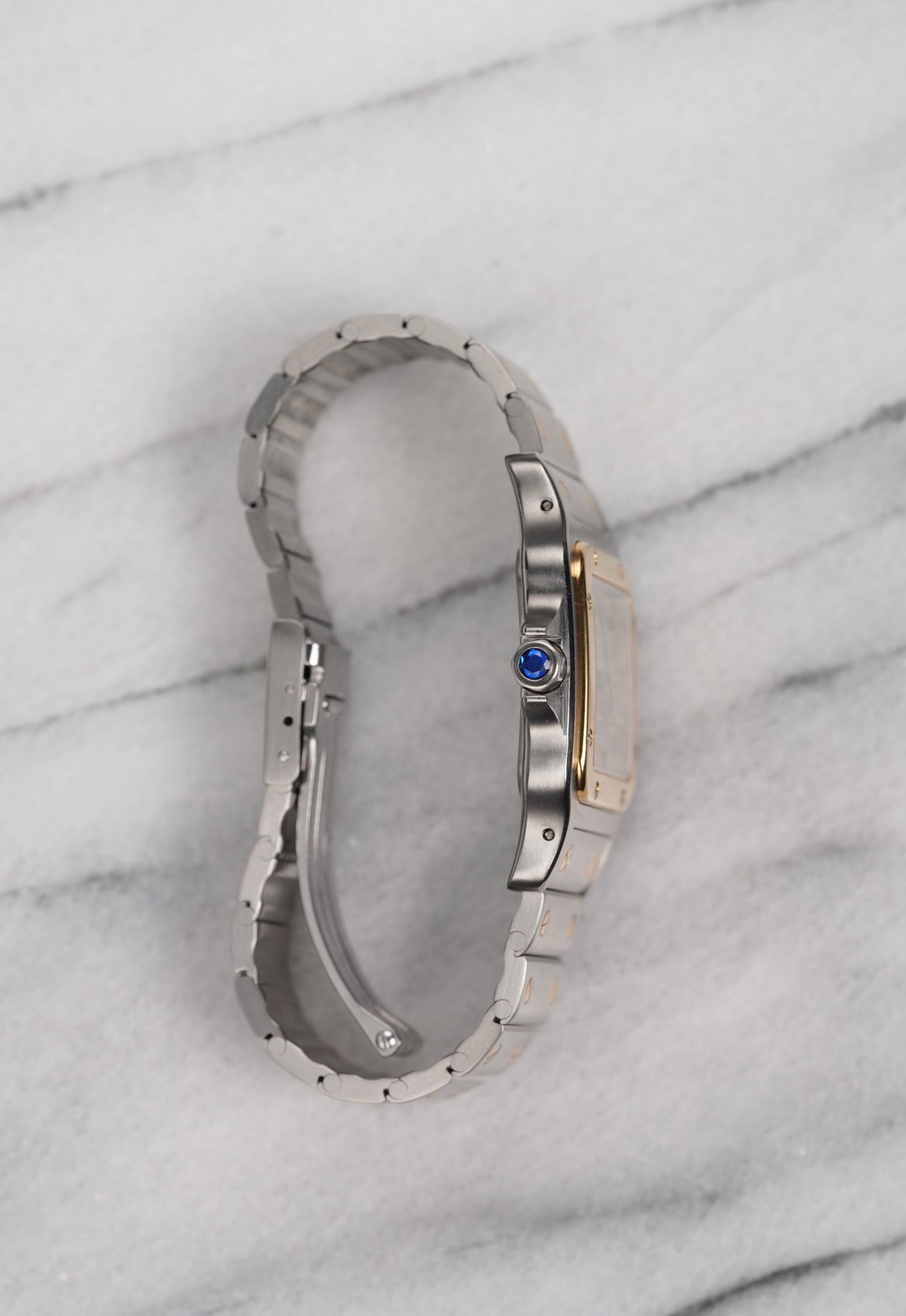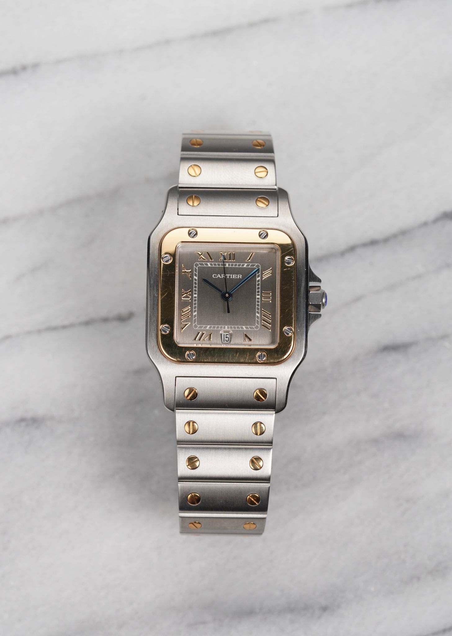 Here's a vintage Cartier Santos two tone quartz with a mocha( brownish) roman numeral dial from the late 80s, early 90s. Keeps great time and is fully functional. Measurements include a 29x41mm square case size and 18mm lug width. Integrated bracelet with screws that fit up to a 7 inch wrist. Blue cabochon crown. Blued hands. Matching black roman numerals and minute track. Quickset date function at 6 a clock. Stainless steel case and caseback. Some scratches on the bezel, case, and bracelet. gold bezel and screws in the bracelet. Brushed finishing on both the case and bracelet. Matching screws on the bezel and bracelet. Great condition overall on the case and bracelet. Drilled lug holes. Makes for a great watch for both men and women. All the parts are original including the crown, dial, movement, and caseback. Both the dial and case are in great cosmetic, untouched condition.